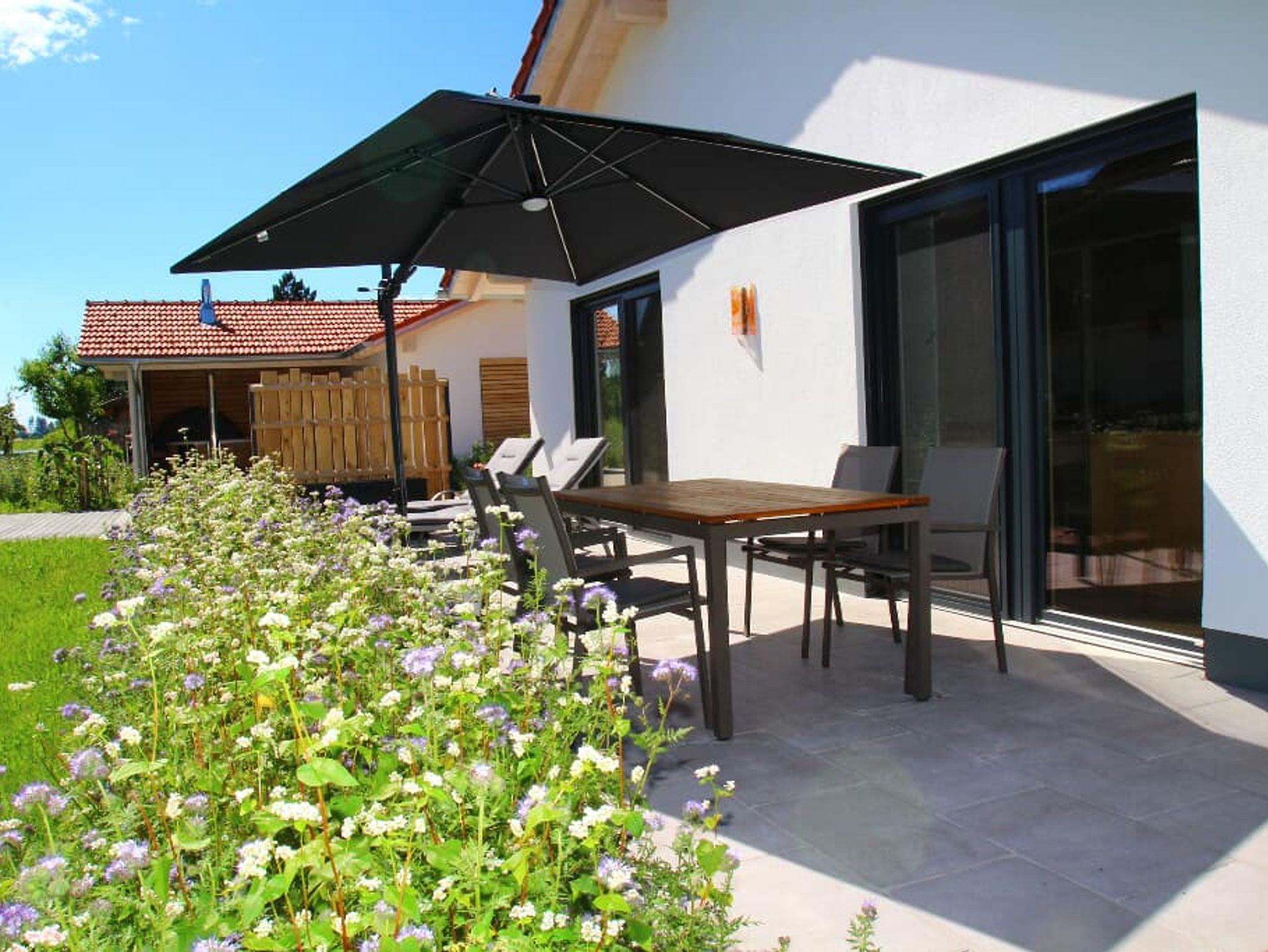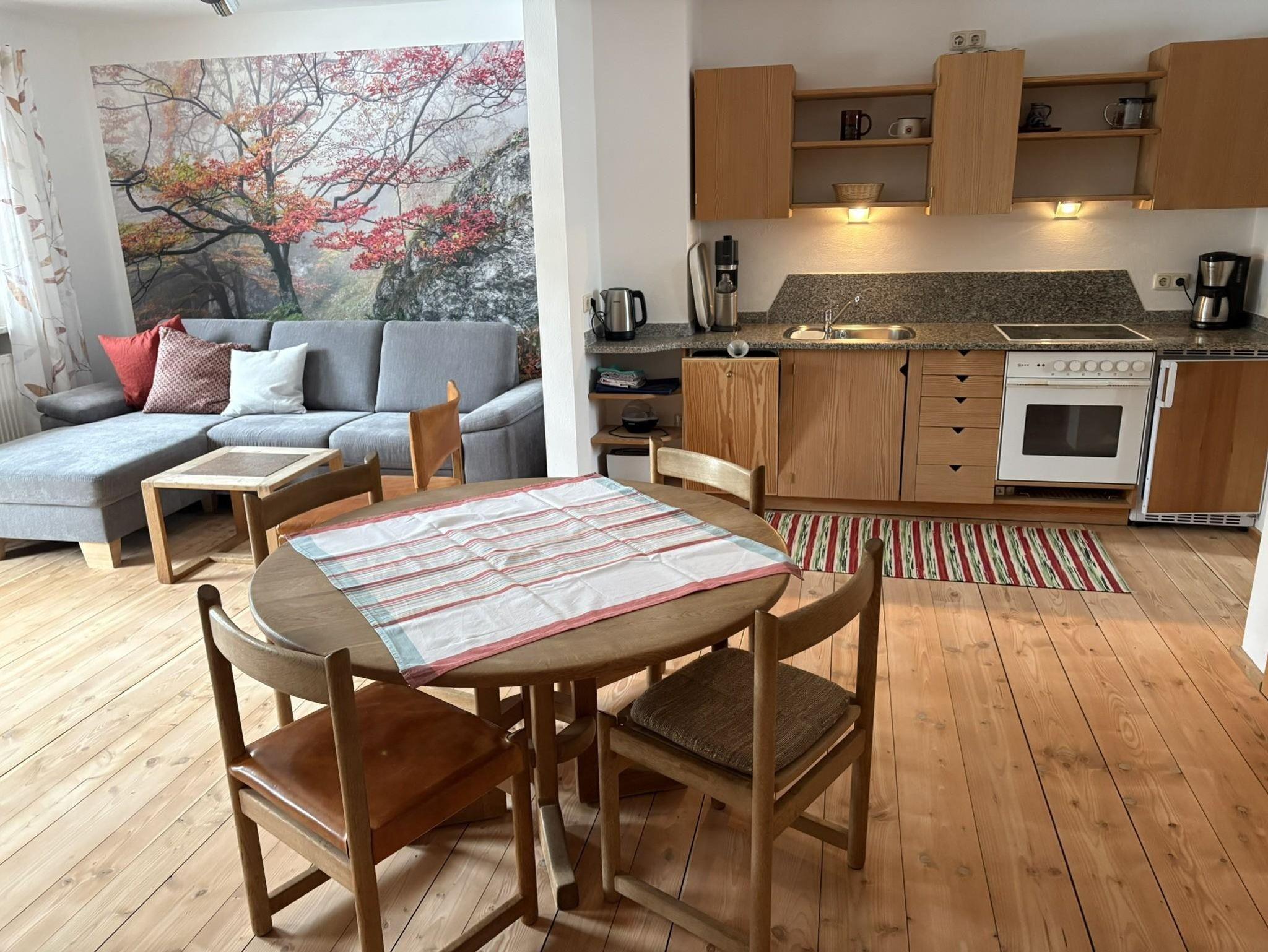 Die Wohnung Hafner im Erdgeschoss hat 45 qm mit einem Schlafzimmer mit Küche und Dusche/WC. Die Wohnung wurde mit Vollholzmöbel vom Schreiner Hafner ausgestattet. Die Küche verfügt über eine Spülmaschine, Toaster, Kaffeemaschine und Wasserkocher. Zusätzlich haben Sie eine Sitzmöglichkeit im Innenhof direkt vor Ihrer Terrasse, wo Sie jederzeit auch mit unserem Kugelgrill grillen können. Parkmöglichkeit direkt vorm Haus. Das WLAN können Sie gerne kostenfrei nutzen.