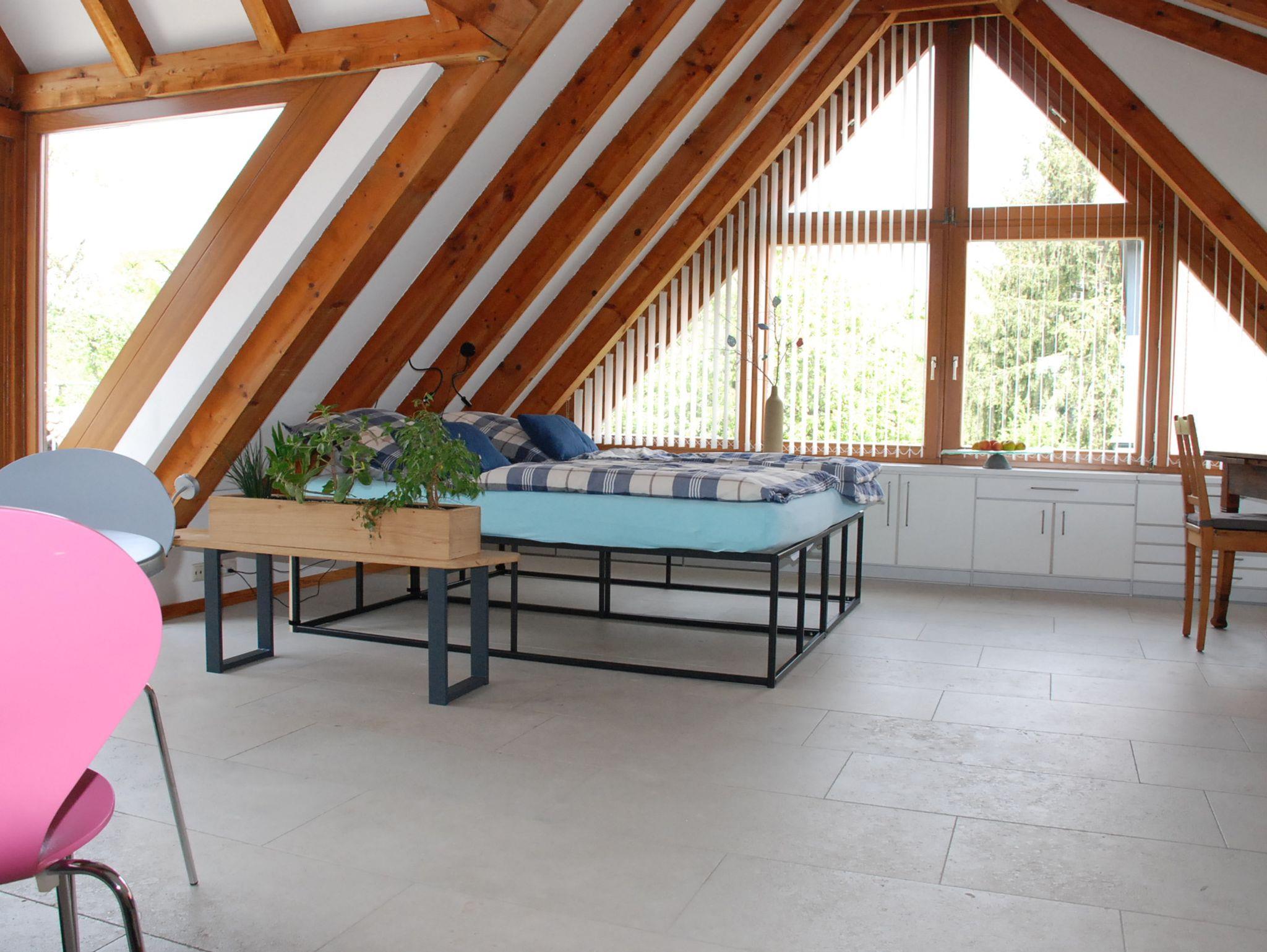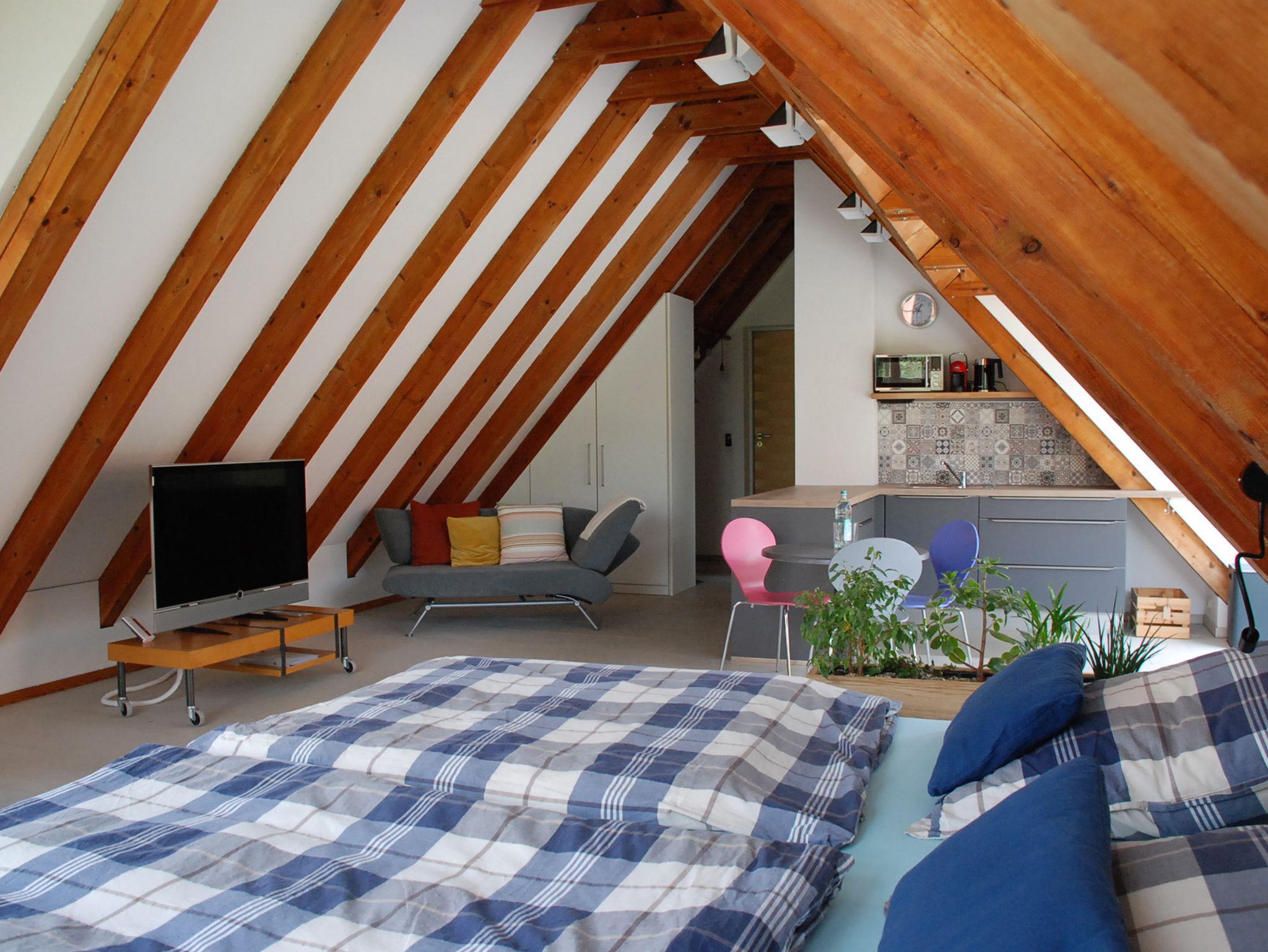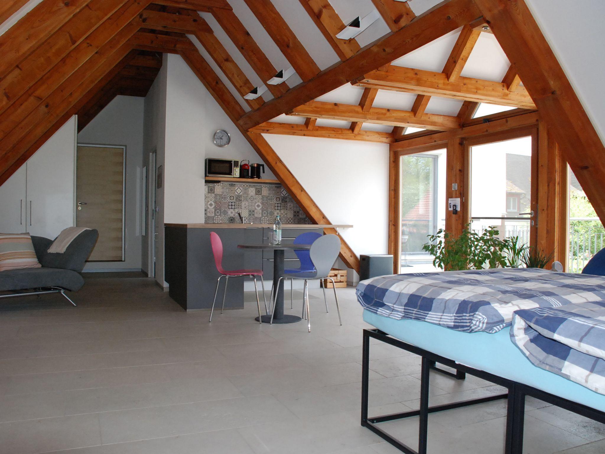 Lichtdurchflutetes, offenes Apartment im 1. Obergeschoß (Dachgeschoß) mit Fußbodenheizung und zugluftfreier Raumkühlung. Zugang über eine Spindeltreppe und einen großzügigen, möblierten Balkon mit Sonnenschirmen. Moderne Einrichtung mit viel Stauraum und gut ausgestatteter Küche, Essplatz, 48-TV-Gerät über SAT-Anlage, antikem Schreibtisch mit Bürodrehsessel sowie zwei - auch getrennt stellbare - Einzelbetten 90 x 200 cm. Modernes Bad mit Dusche und WC. WLAN mit 50 MBit.