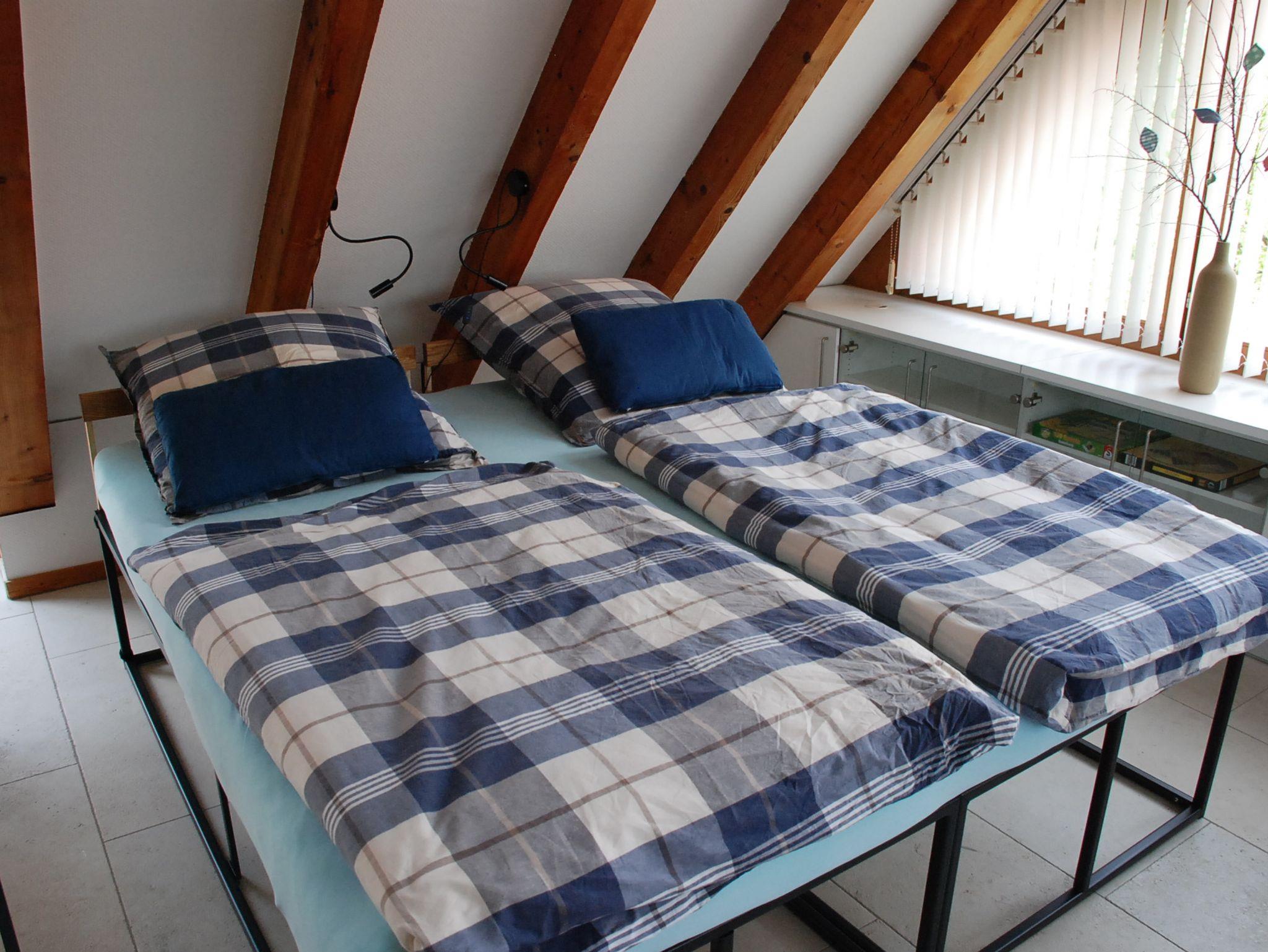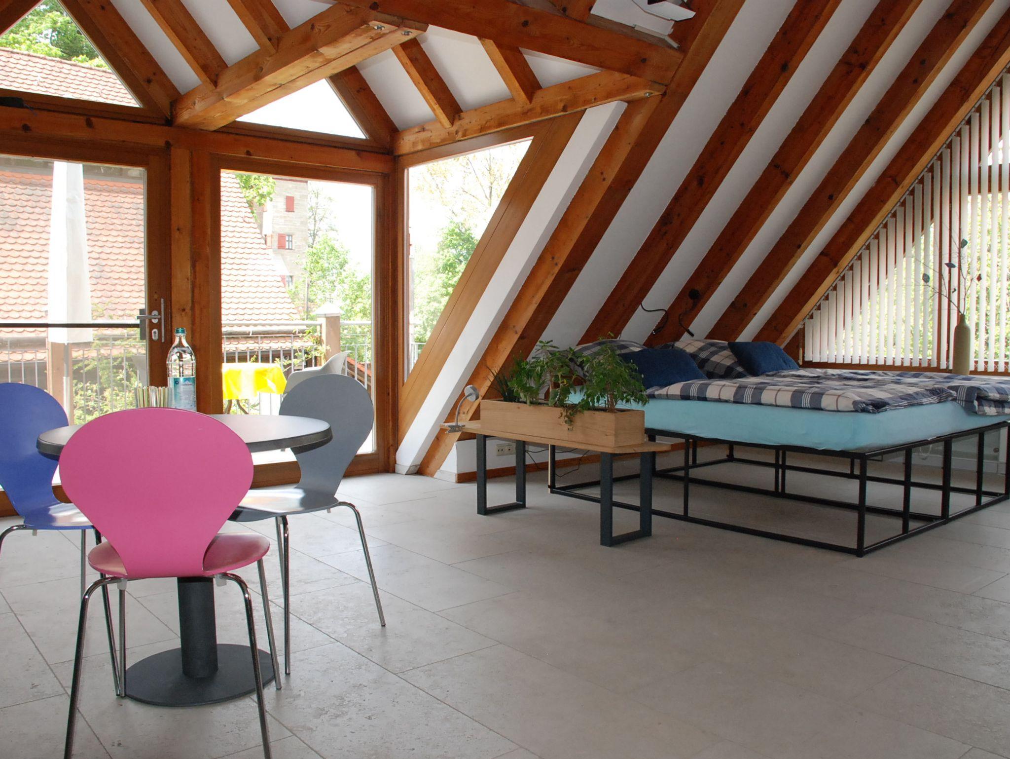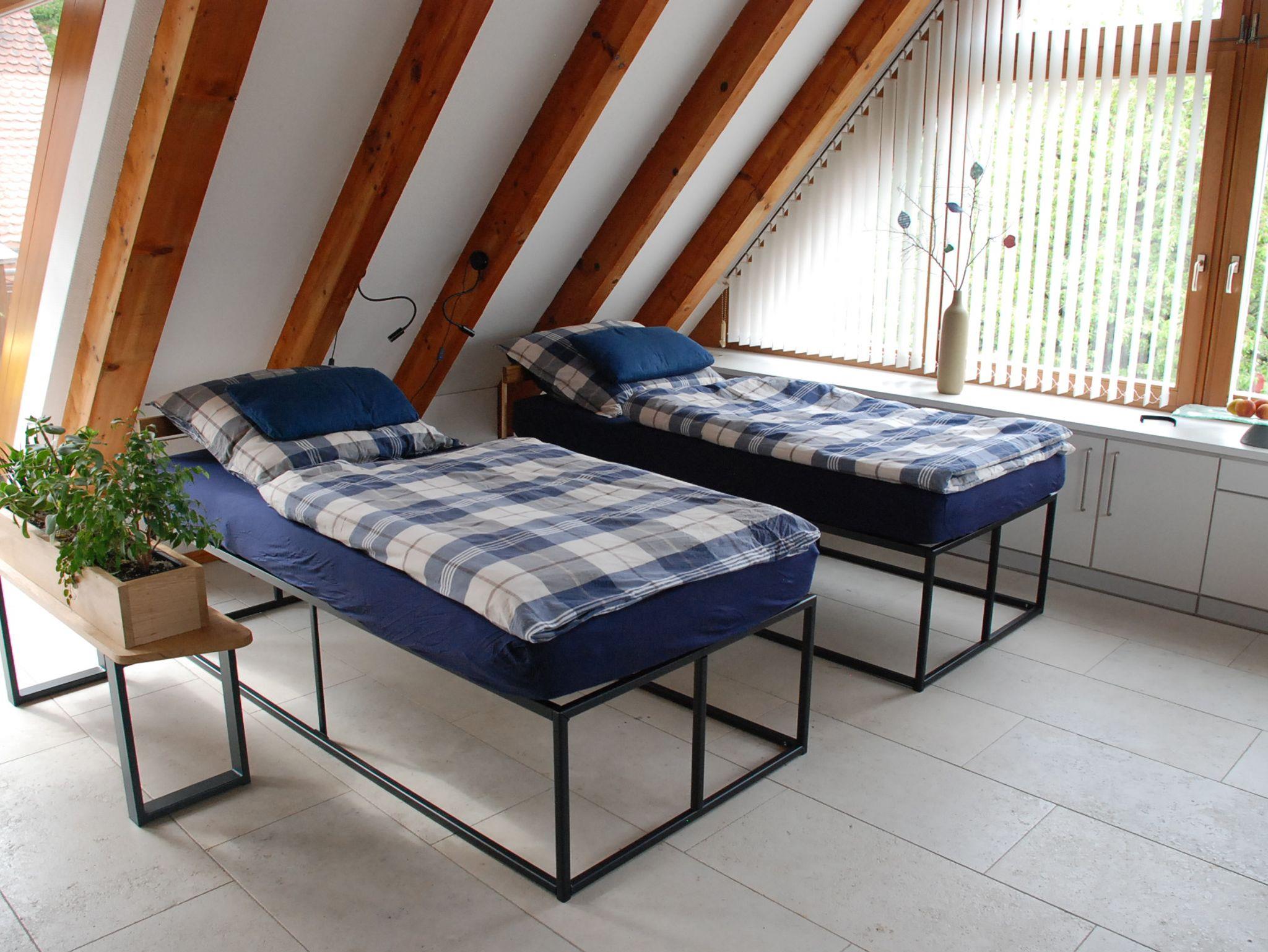 Lichtdurchflutetes, offenes Apartment im 1. Obergeschoß (Dachgeschoß) mit Fußbodenheizung und zugluftfreier Raumkühlung. Zugang über eine Spindeltreppe und einen großzügigen, möblierten Balkon mit Sonnenschirmen. Moderne Einrichtung mit viel Stauraum und gut ausgestatteter Küche, Essplatz, 48-TV-Gerät über SAT-Anlage, antikem Schreibtisch mit Bürodrehsessel sowie zwei - auch getrennt stellbare - Einzelbetten 90 x 200 cm. Modernes Bad mit Dusche und WC. WLAN mit 50 MBit.