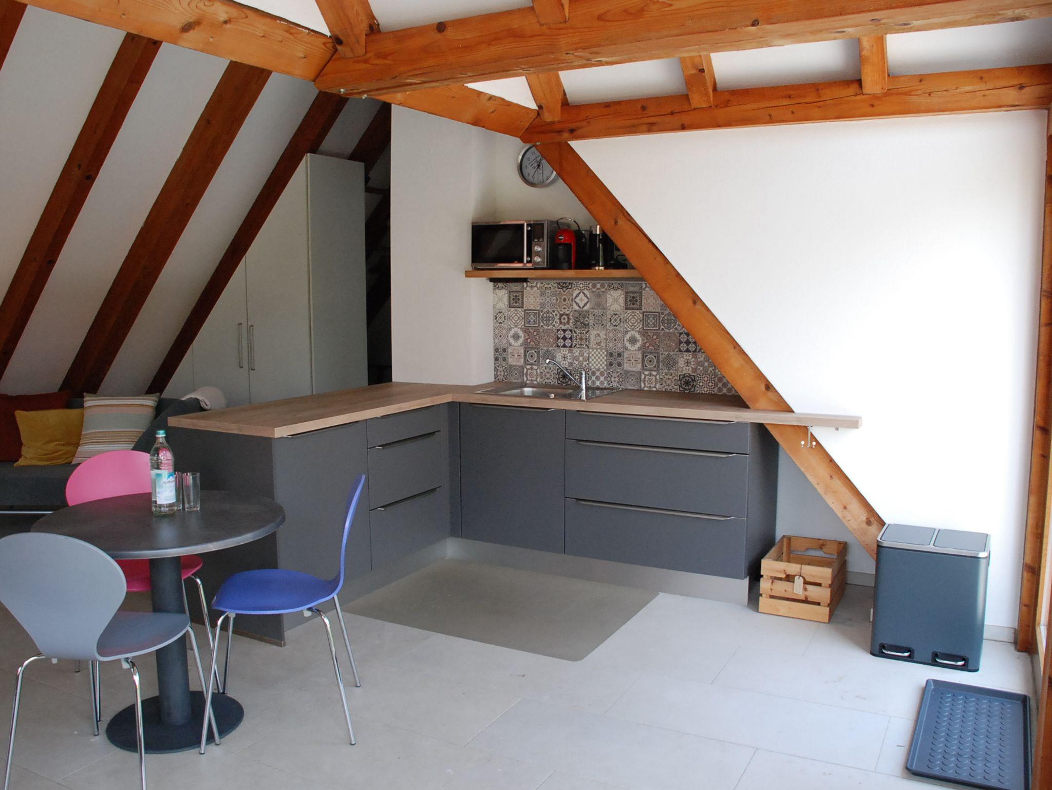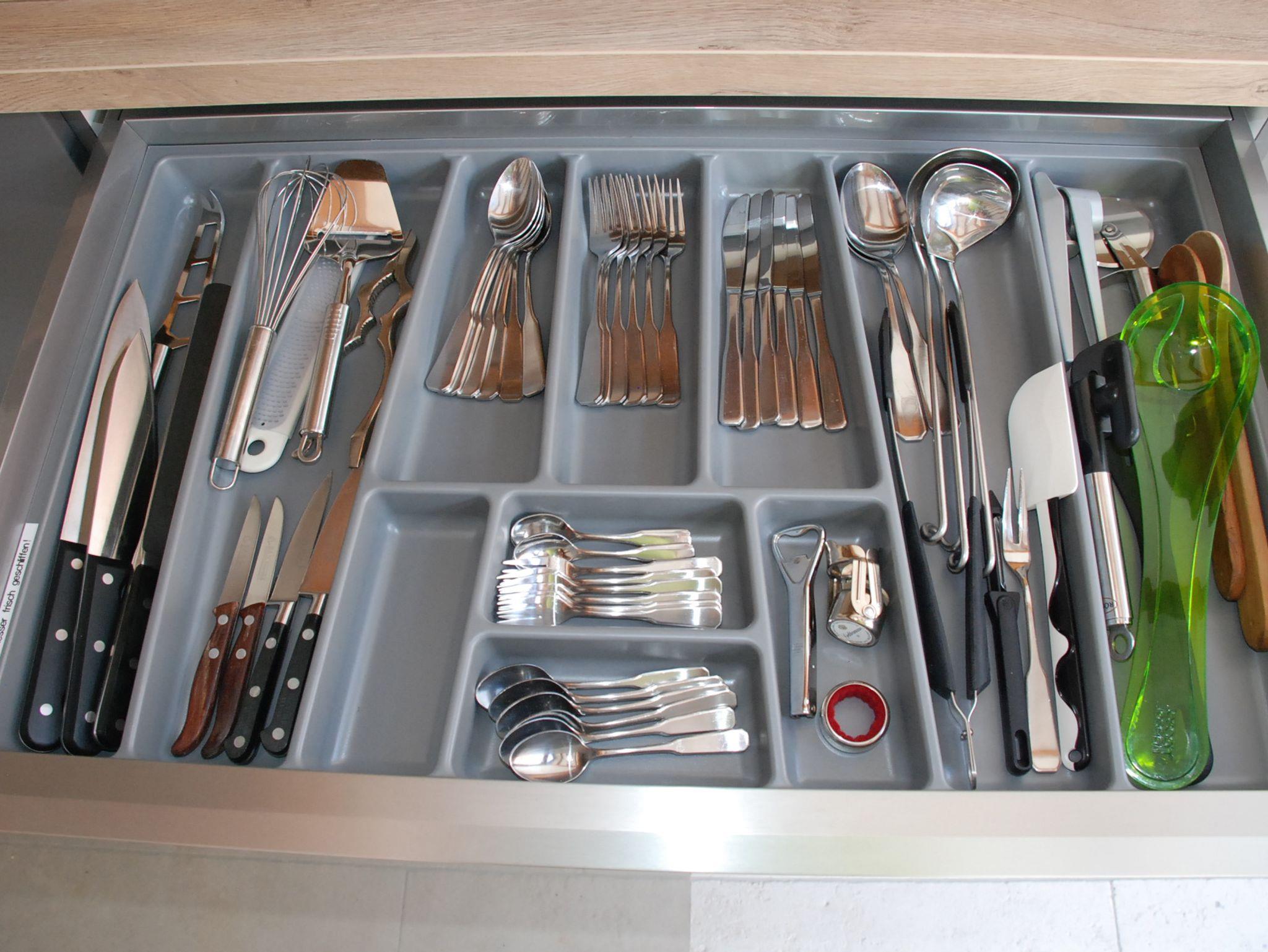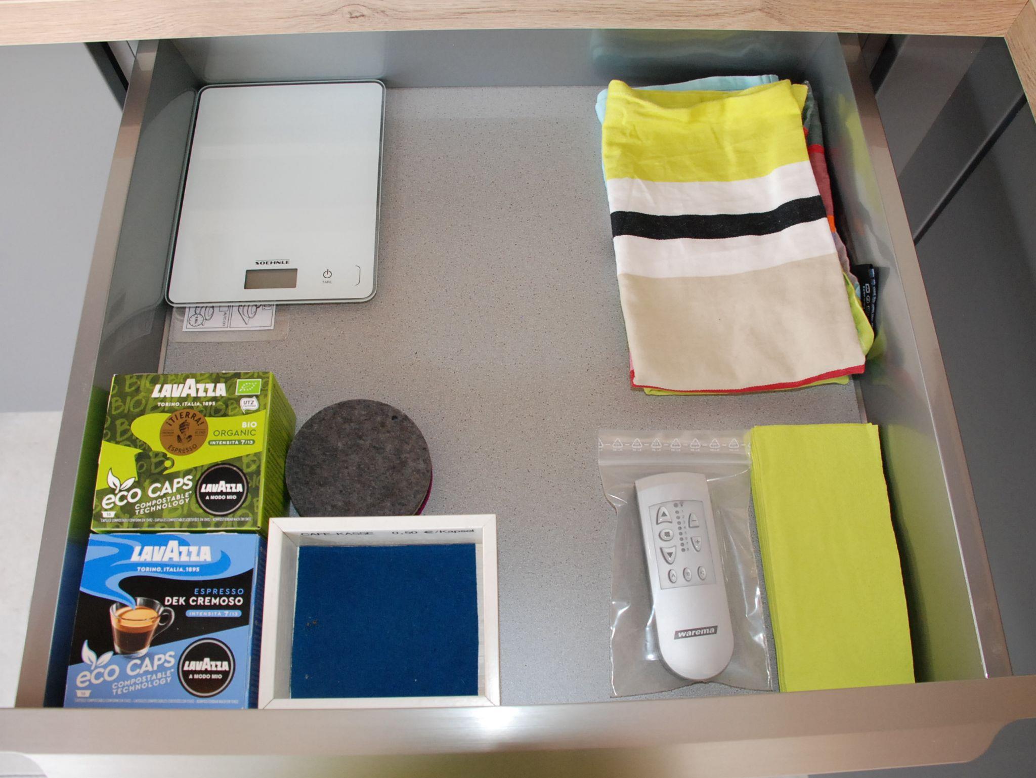 Kühlschrank mit Gefrierabteil, Lavazza-Modo-Mio-Kapselmaschine sowie eine Frenchpress-Kanne, Wasserkocher, Kombi-Mikrowellen-Gerät sowie ein transportables Doppelinduktionskochfeld stehen bereit. Auf Anfrage kann ein Grill zur verfügung gestellt werden.