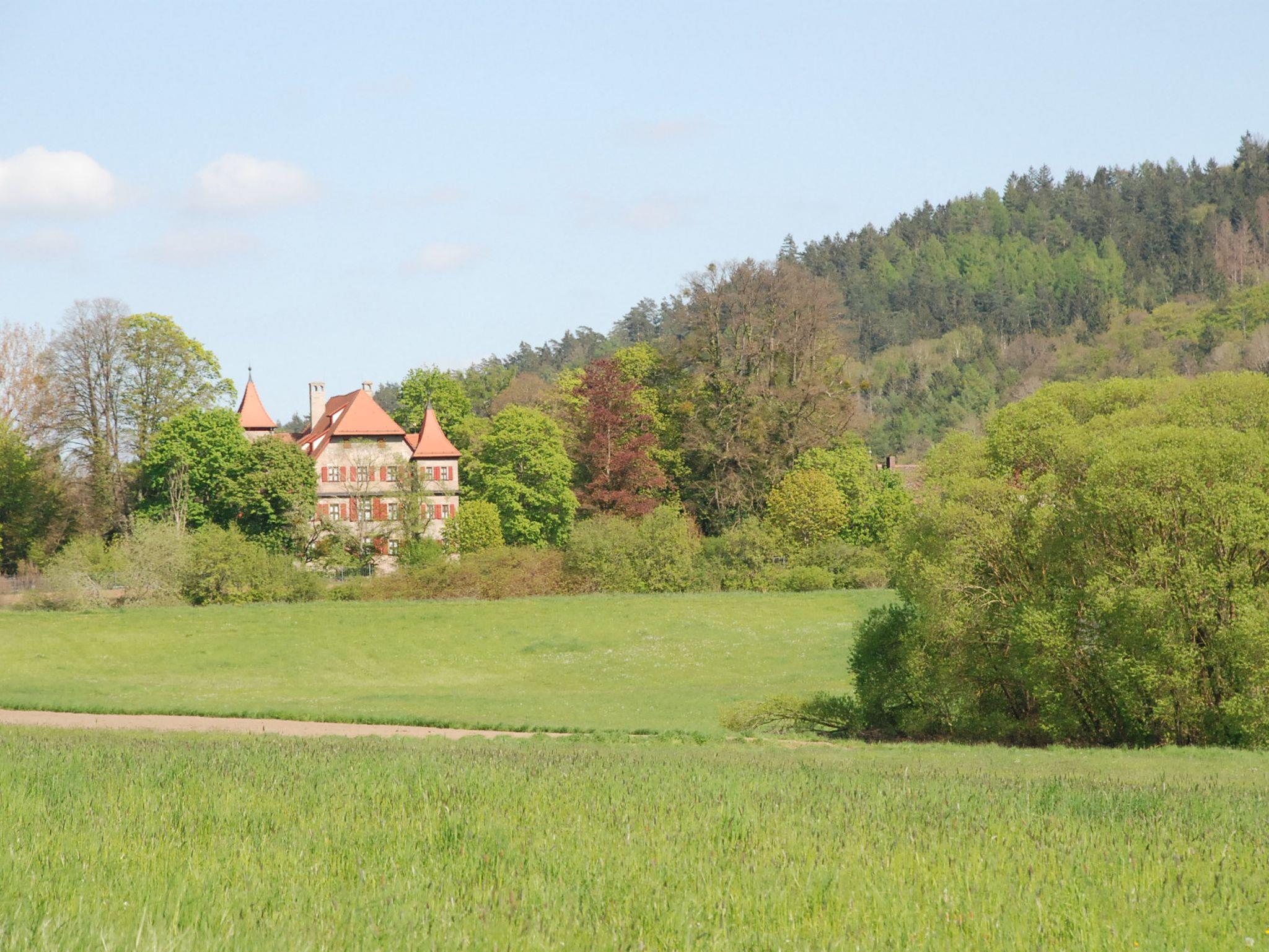 Blick auf den Moritzberg und das benachbarte, 500 Jahre alte Wasserschloss der Nürnberger Patrizierfamilie von Fürer. Öffentliche Ladestationen, Spielplatz, Bolzplatz und Bushaltestelle (u.a. zur S-Bahn) nur je 50 m entfernt. Wald, Weiher, Schluchten und Naturdenkmäler in unmittelbarer Umgebung. Die Nürnberger Altstadt, der Flughafen und die Messe sind in ca. 25 Minuten erreichbar. Mit der S-Bahn erreicht man die Nürnberger Innenstadt in 20 Minuten. Die Historische Gaststätte Zum Rockenbrunn mit traditionell fränkischer Küche und frischen Fischen ist fußläufig erreichbar; nach einer Besteigung des Moritzberges - für gute Wanderer in 40 Minuten machbar - kann man sich in der dortigen Gaststätte erfrischen. Manchmal ist der Aussichtsturm geöffnet. Die Region ist ideal für Wanderer + Kletterer, für Mountainbiker und Kanuten geeignet.