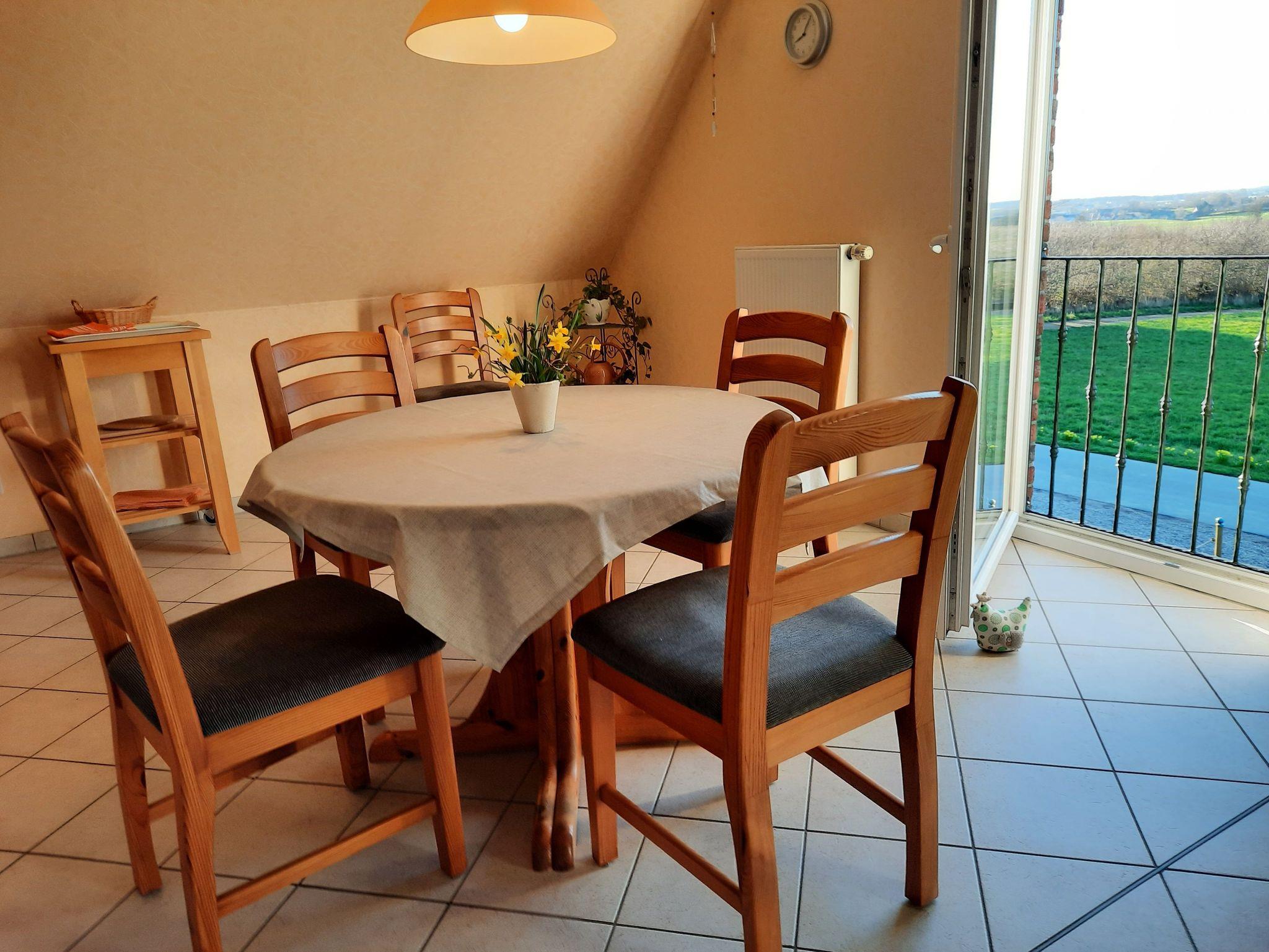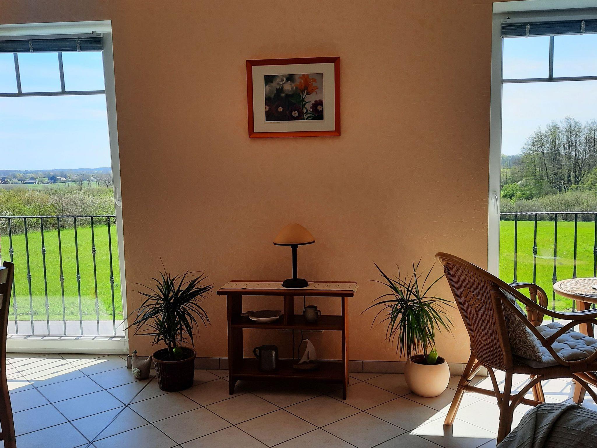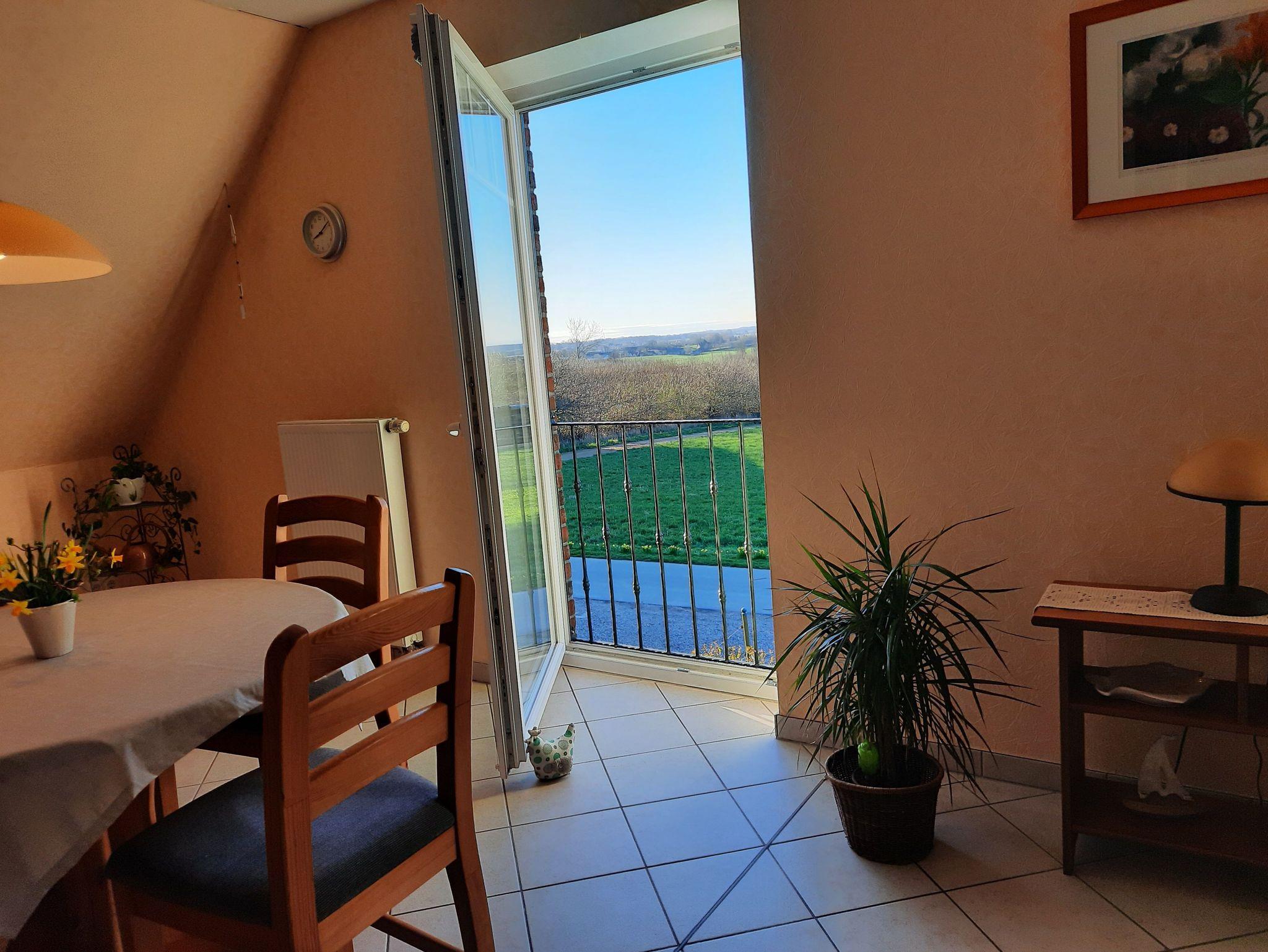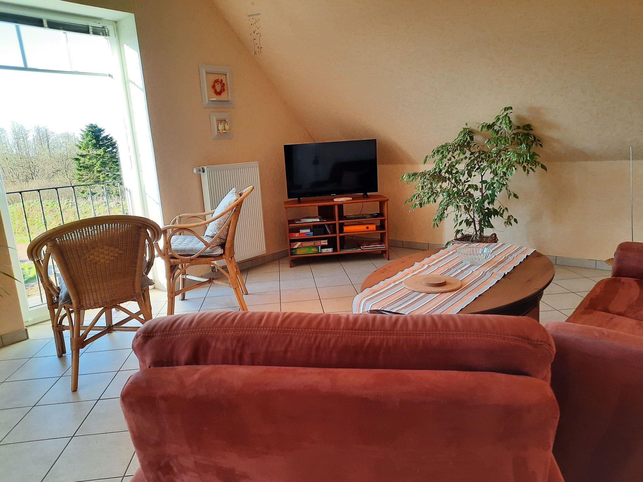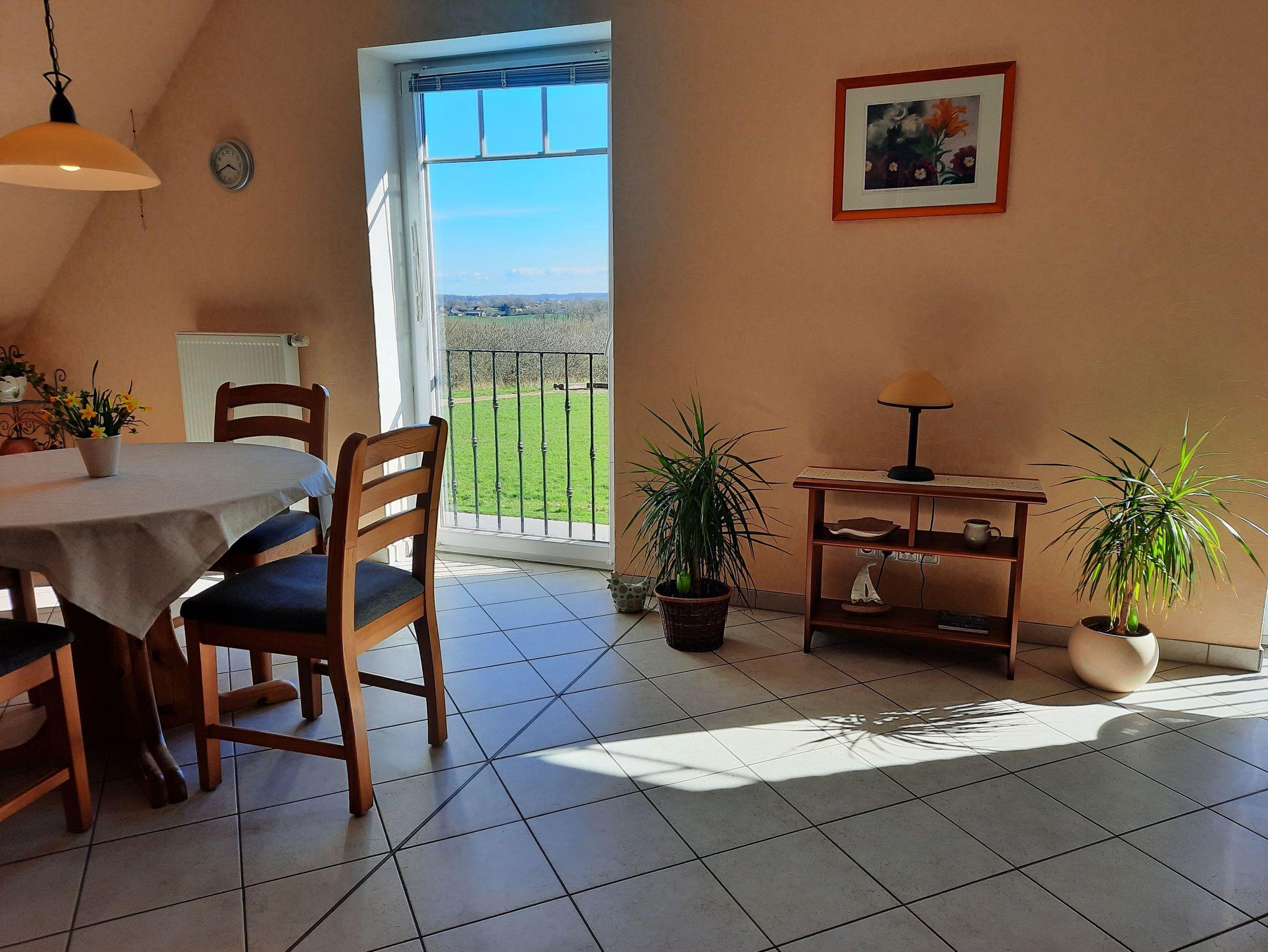 Ferienwohnung (70 m²), sep. Eingang, Etage, komfort. großzügiger Wohnraum nach Süden mit bodenstehenden Fenstern und Blick über die Landschaft, Küchenzeile als Einbauküche und Eßbereich, Mikrowelle, Geschirrspüler, Flachbildschirm-TV, WLan.