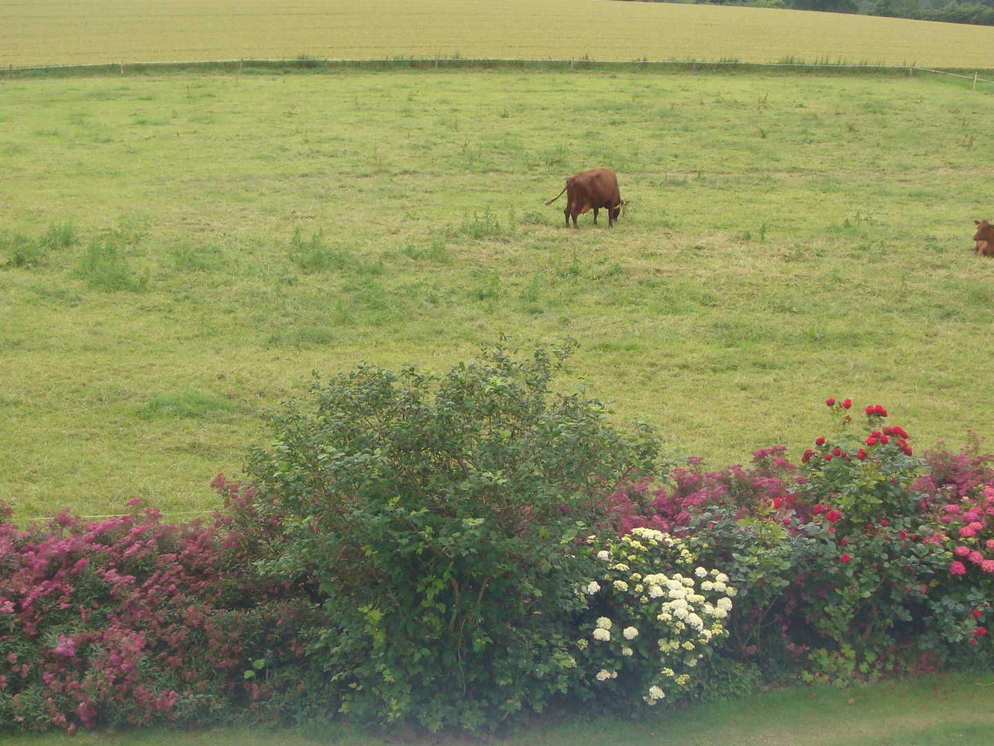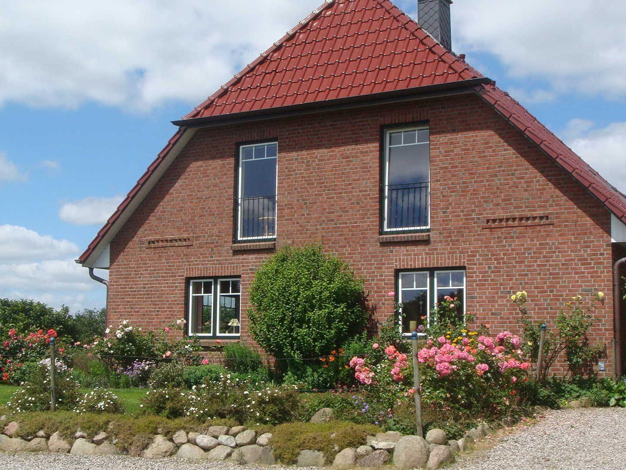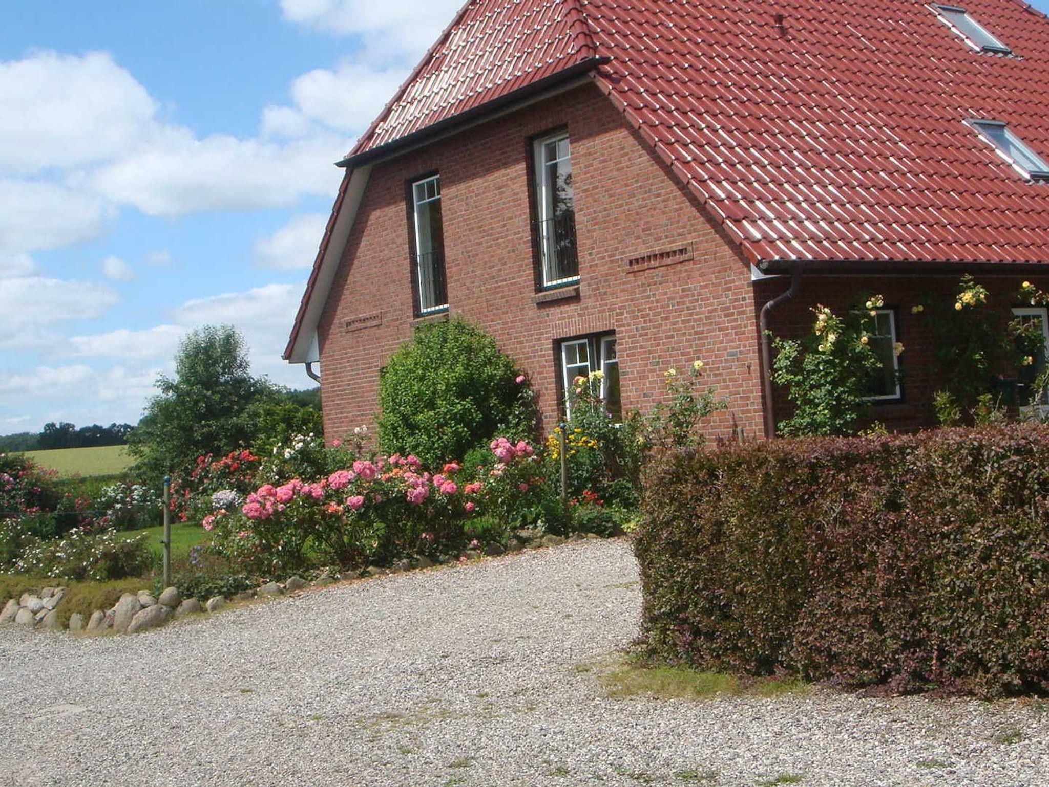 Ruhig gelegene Ferienwohnung mit schöner Aussicht auf Felder und Wälder, in der Ferne liegt Arnis bzw. die Schlei. Zum Bauernhof (Milchviehhaltung, Getreideanbau) gehörendes Haus, gelegen an einer Nebenstraße, die auch zugleich empfohlener Radwanderweg ist. Das Grundstück hat einen großen Garten und grenzt mit seinem Gemüsegarten an den Obstgarten des Bauernhofs. Die Terrasse für die Gäste befindet sich im Winkel nach Westen mit Abendsonnenschein. . Dort befindet sich auch die Liegewiese.