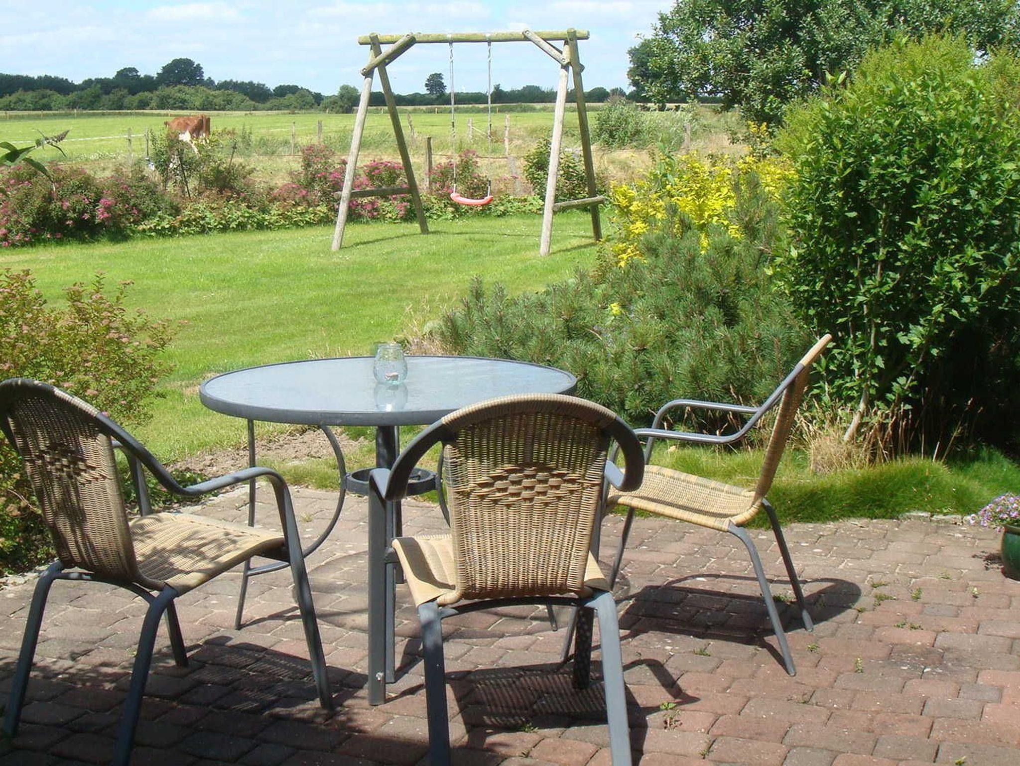 Die Terrasse im Garten befindet sich im Hauswinkel an der Rasenfläche mit Abendsonne und freiem Blick über die Felder. Dort ist auch ein Spielrasen bzw. eine Liegewiese.