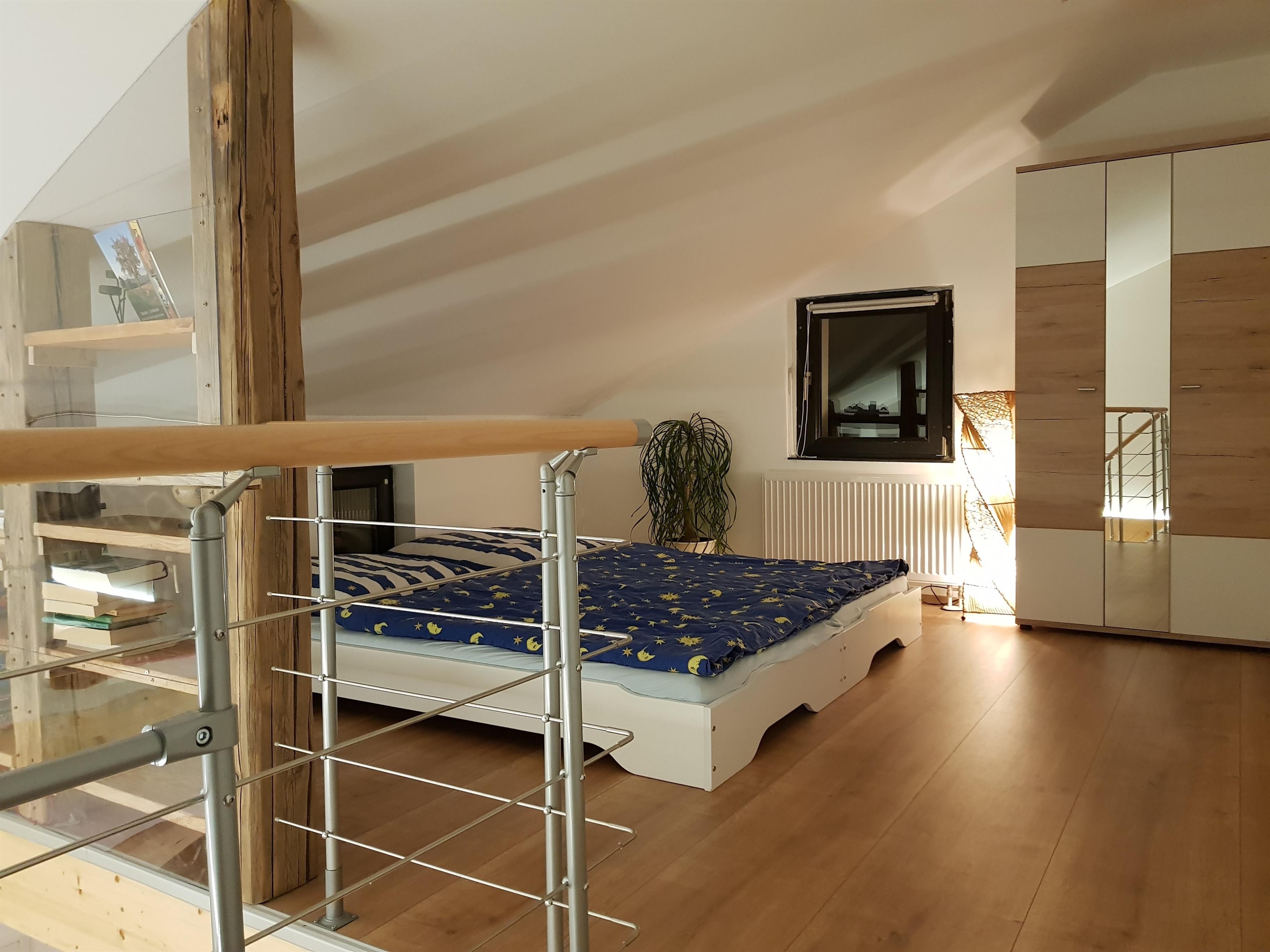 Im Zuge der Sanierung wurde eine kleine Galerie mit halboffenem Schlafraum geschaffen, welche der Maisonette-Wohnung einen gemütlichen Charme verleiht. Das abschließbare Schlafzimmer überzeugt mit einem unikaten Balkenbett, welches unaufdringlich zum Träumen einlädt. Für die Besinnlichkeit sorgt dabei eine passive Beleuchtung unterhalb des Bettes. Alle Räume sind insgesamt hell gestaltet und mit individuellen Möbeln bestückt, welche teilweise exklusiv angefertigt wurden. Der geräumige Innenhof und der wunderschöne, große Garten laden Kinder zum Spielen und Erwachsene zum Verweilen ein. Auch der große Pool kann saisonal mitgenutzt werden (Juni-September), um sich an heißen Tagen schnell abkühlen zu können. Eine kleine Terasse gibt die Möglichkeit bei schöner Witterung draußen die Seele baumeln zu lassen oder gemütlich zu grillen.