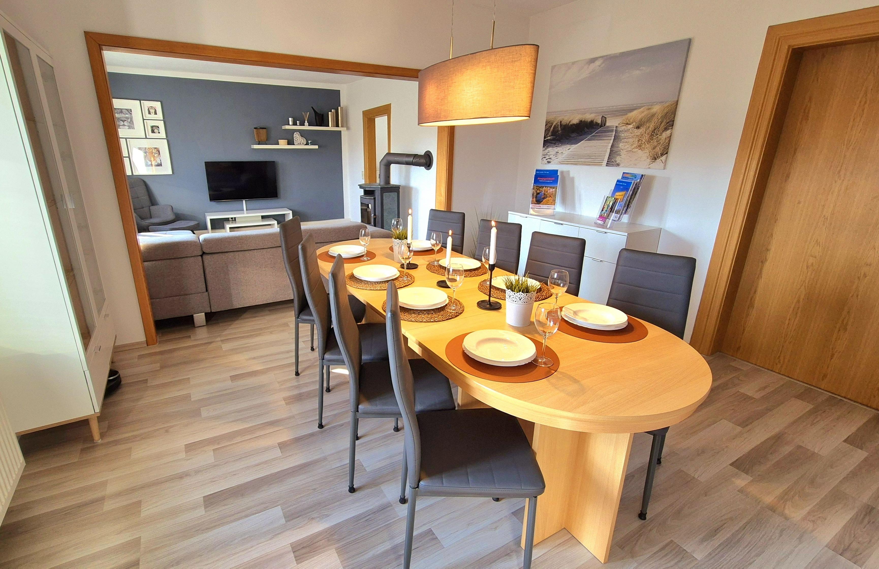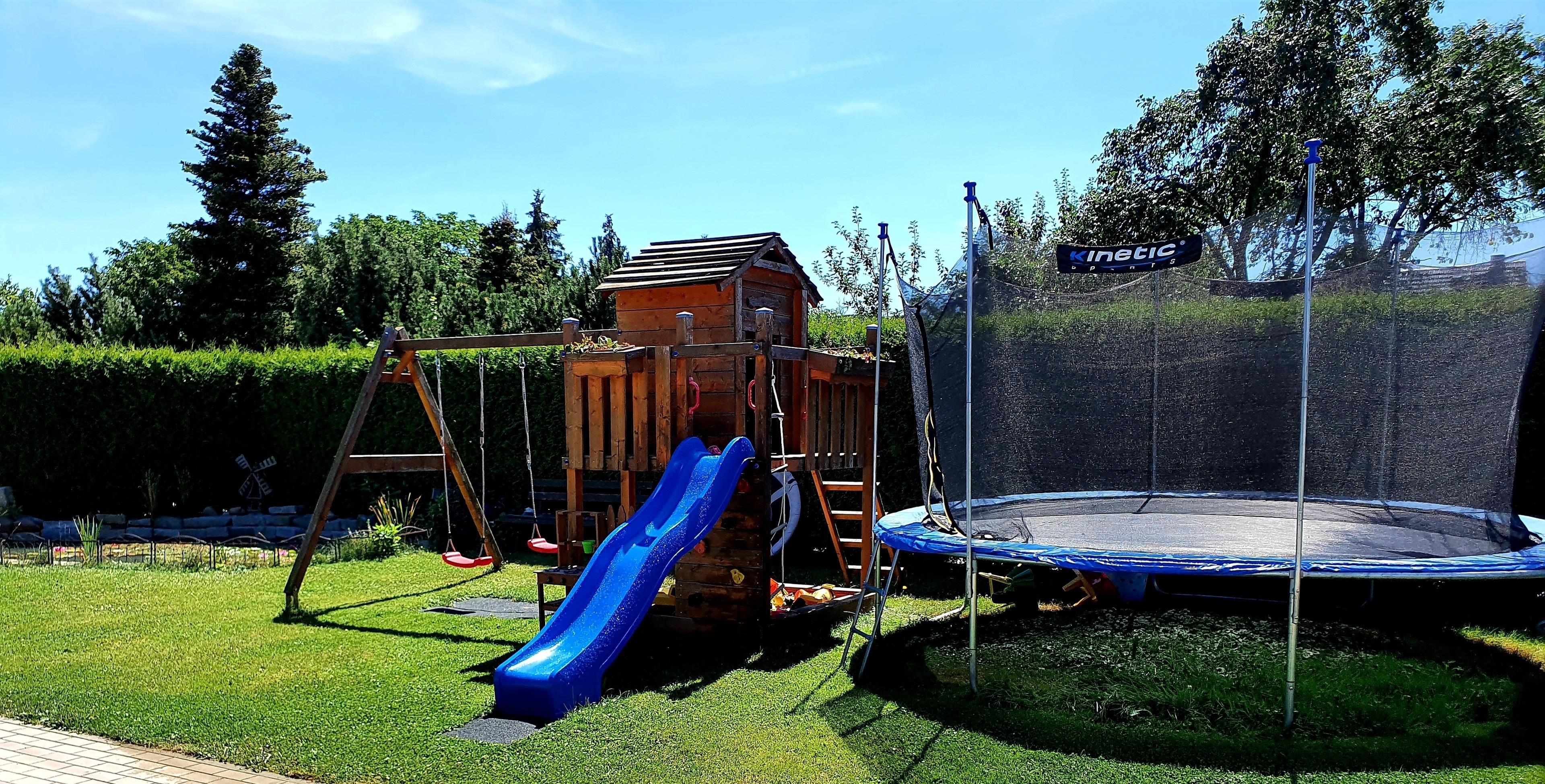 Im Außenbereich befinden sich Sitzmöglichkeiten sowie ein Spielbereich für Kinder. Ein Grill steht für einen schönen Abend bereit.