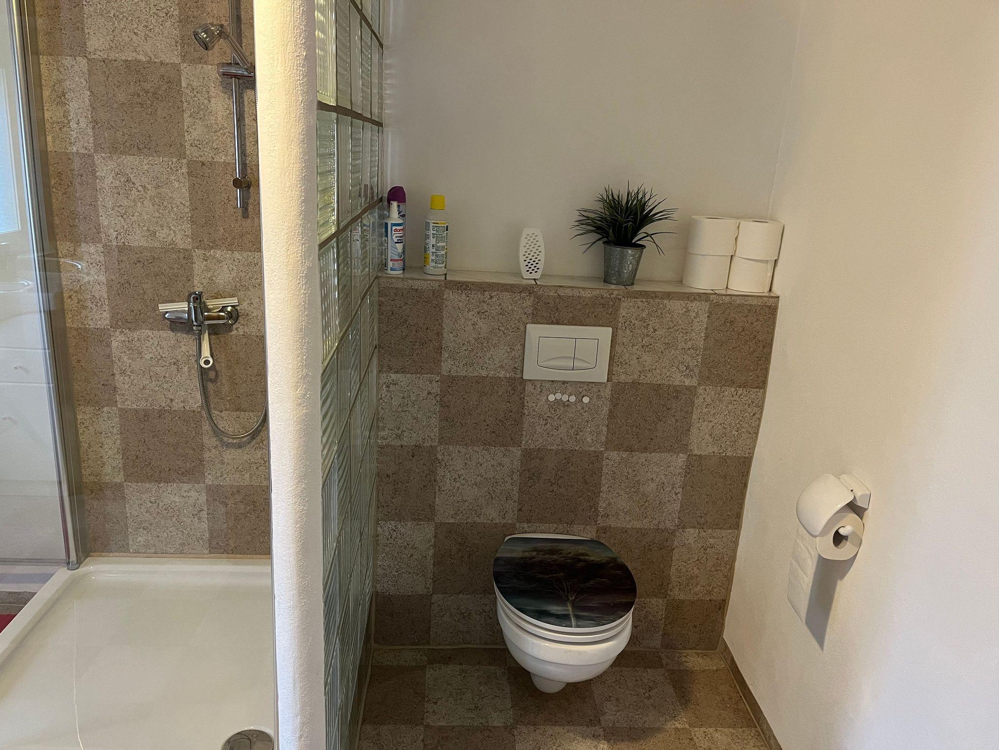 Die Ferienwohnung in Holzoptik verfügt über eine geräumige Wohnküche mit Eßecke, Wohnzimmer mit gemütliche Sitzecke, ein Schlafzimmer mit Doppelbett und großes Badezimmer mit Dusche, WC und Waschmaschine.