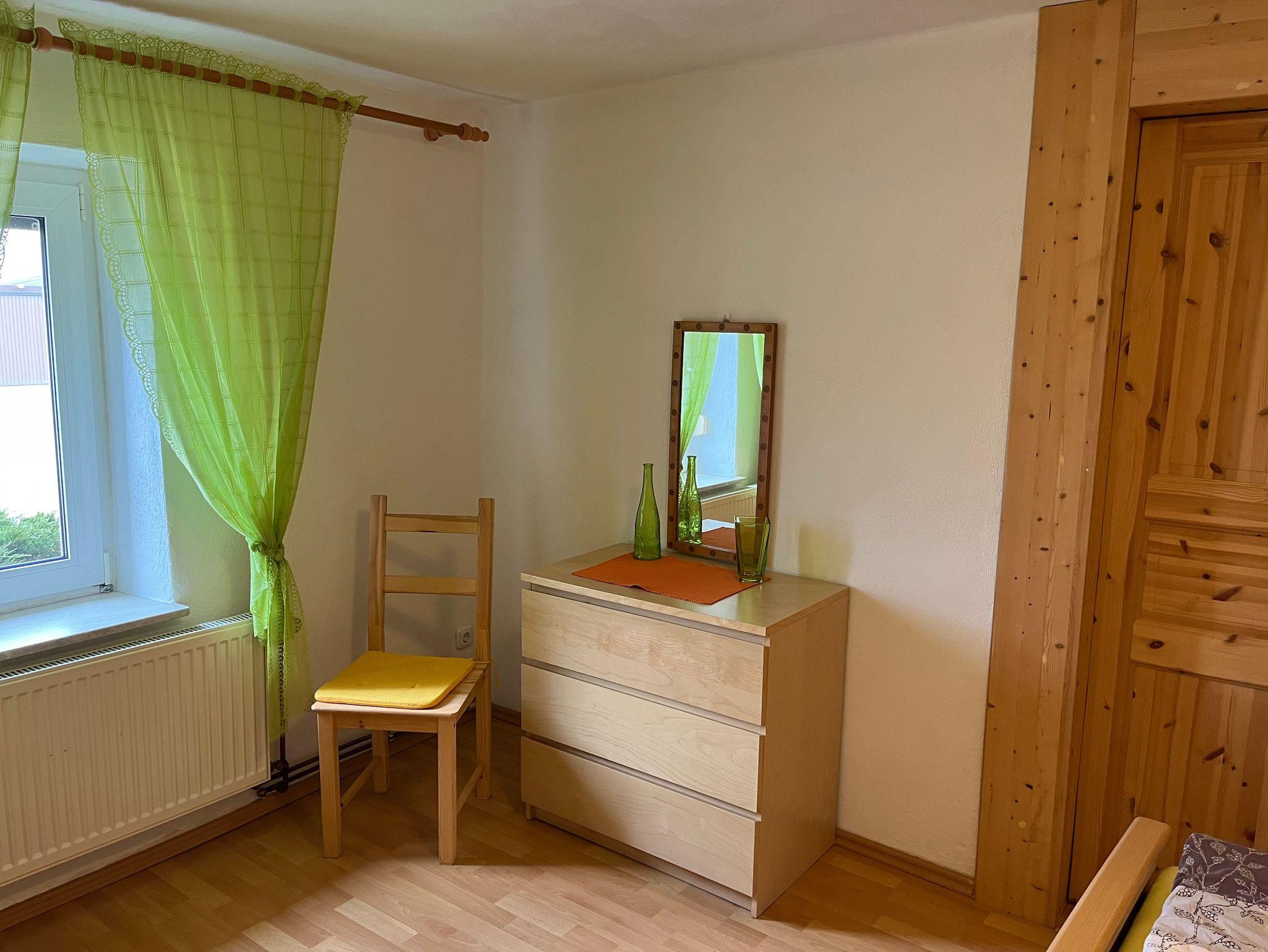 Gemütliche 2-Raum-Ferienwohnung. Wohnküche mit Eßecke. Küche ausgestattet mit 2-Plattenherd, Kaffeemaschine, Wasserkocher, Toaster, Mikrowelle und Kühlschrank. Wohnzimmer mit Couch und TV. Schlafzimmer mit Doppelbett. Badezimmer mit Dusche, WC und Waschmaschine.
