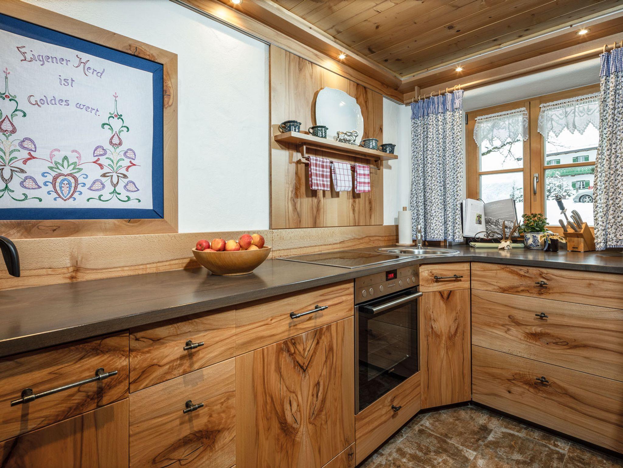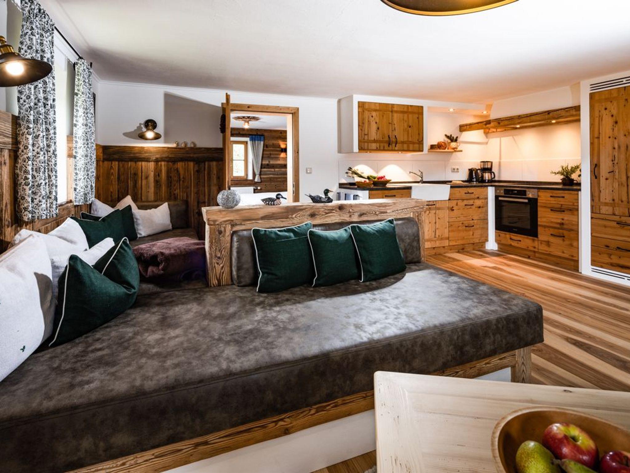Die Küche ist aus Bergedellaubholz handgemacht mit Bergblick beim Kochen! Das Jagerstüberl besticht durch traditionelle Einrichtung, eine gemütliche Sitzecke und ein Sofa zum entspannen.
