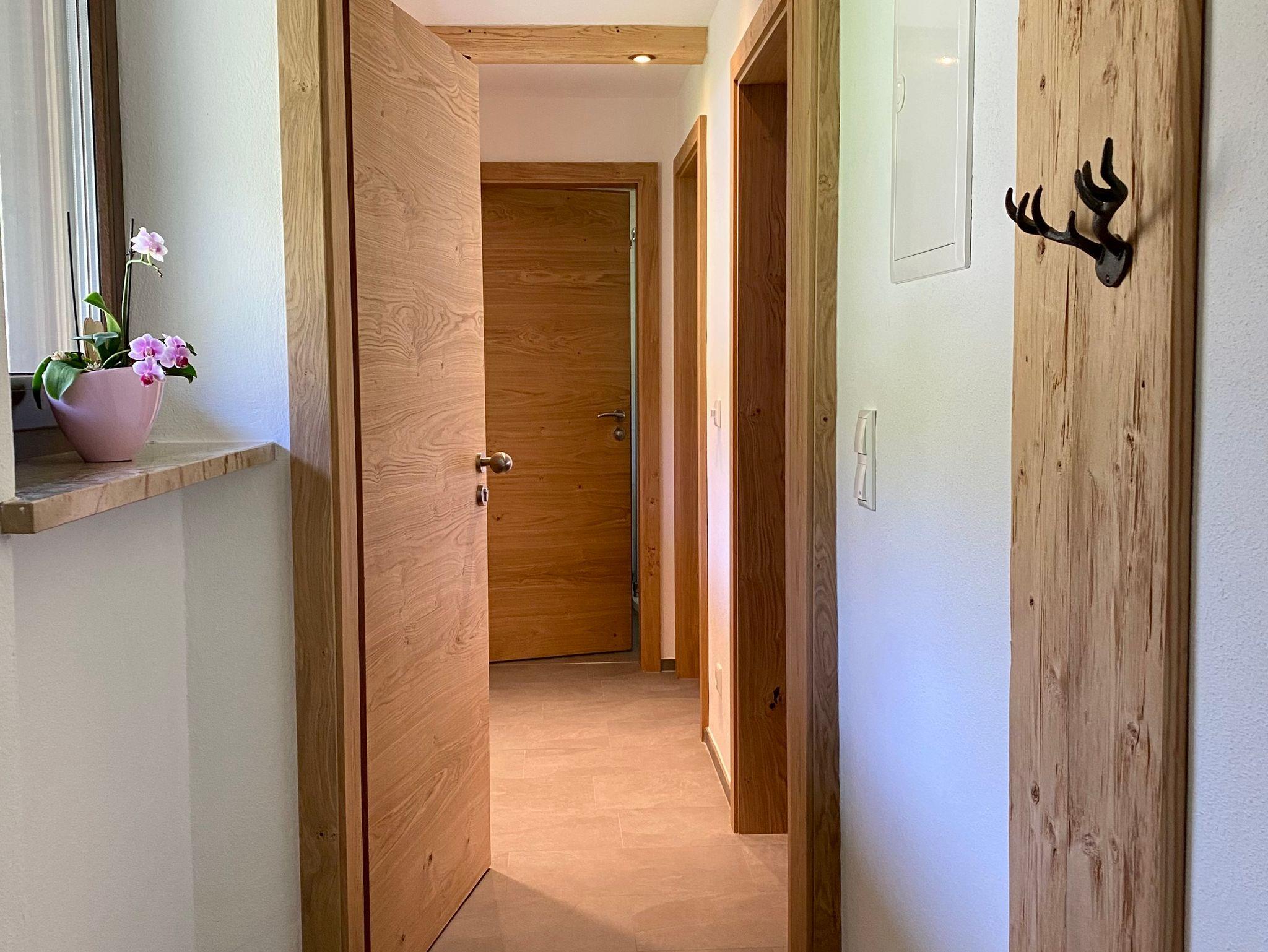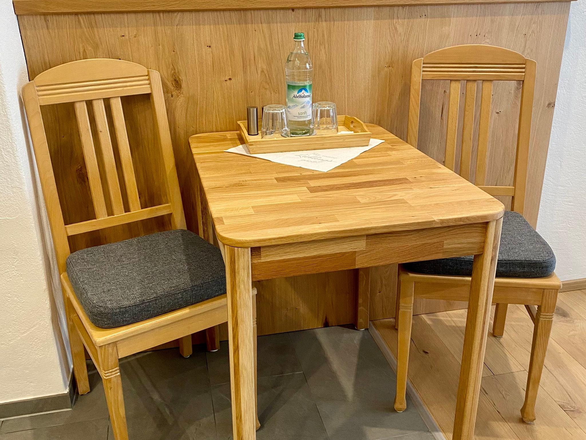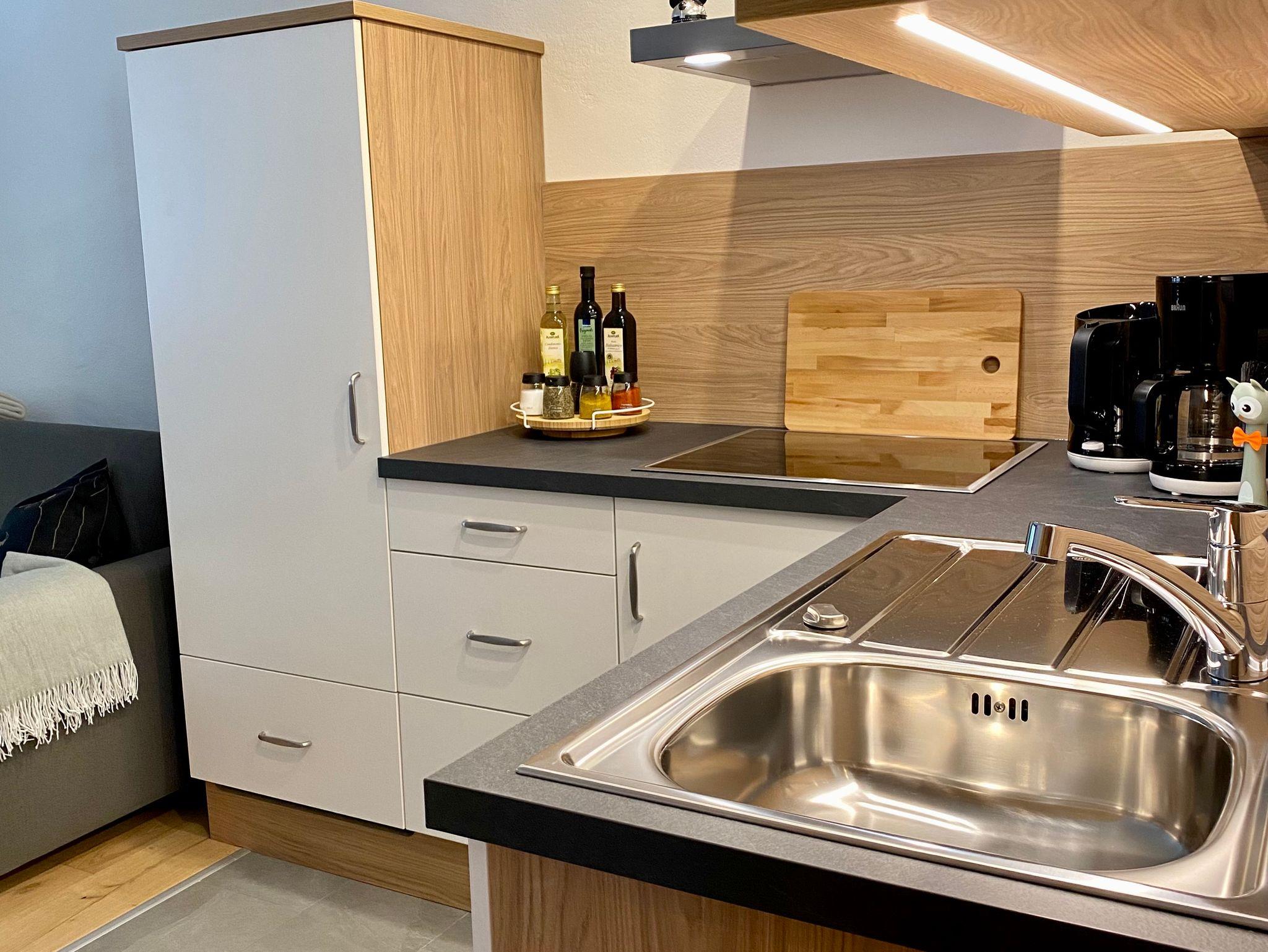 Neuwertige Ferienwohnung (39 qm) zum Wohlfühlen und mit ausreichend Platz für 2 Personen im ersten Obergeschoss: Moderne Ausstattung im Alpenchic, jeder Raum mit Fenster und Fußbodenheizung, überdachter Balkon zur Südseite, kostenloser Stellplatz dirket am Haus. Wohnküche mit Couch, TV, Essbereich und gut ausgestatteter Einbauküche + Dunstabzug. Schlafzimmer mit Doppelbett, Schrank, Gardarobe und Kofferablage. Bad mit Rainshower-Dusche, WC und Waschbecken + beheizbaren Spiegel. Nichtraucher-Wohnung