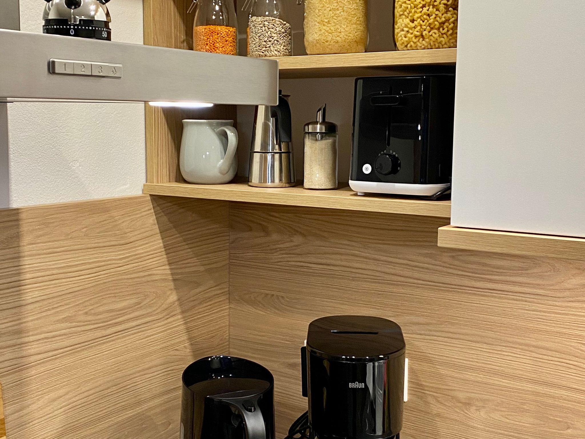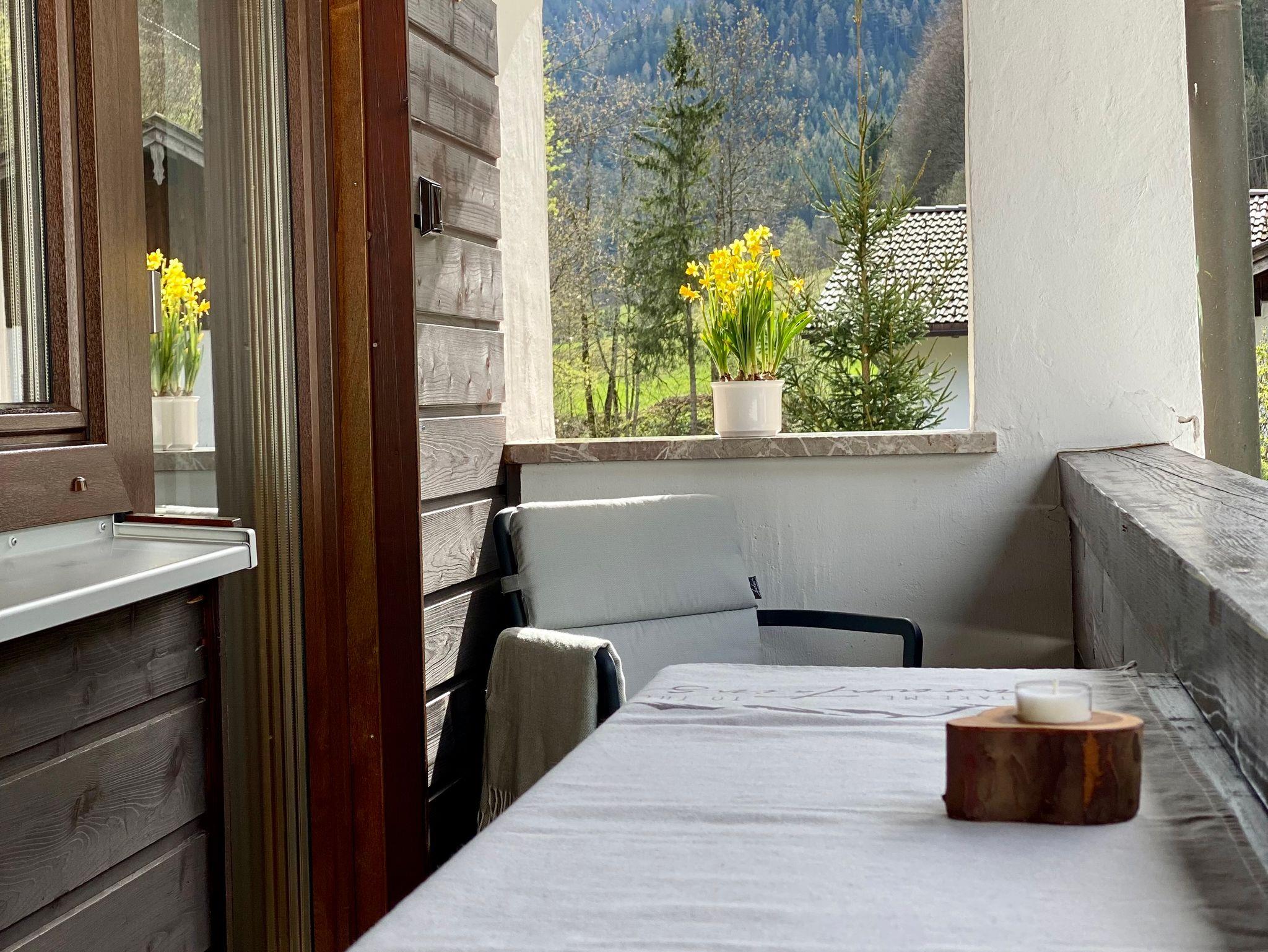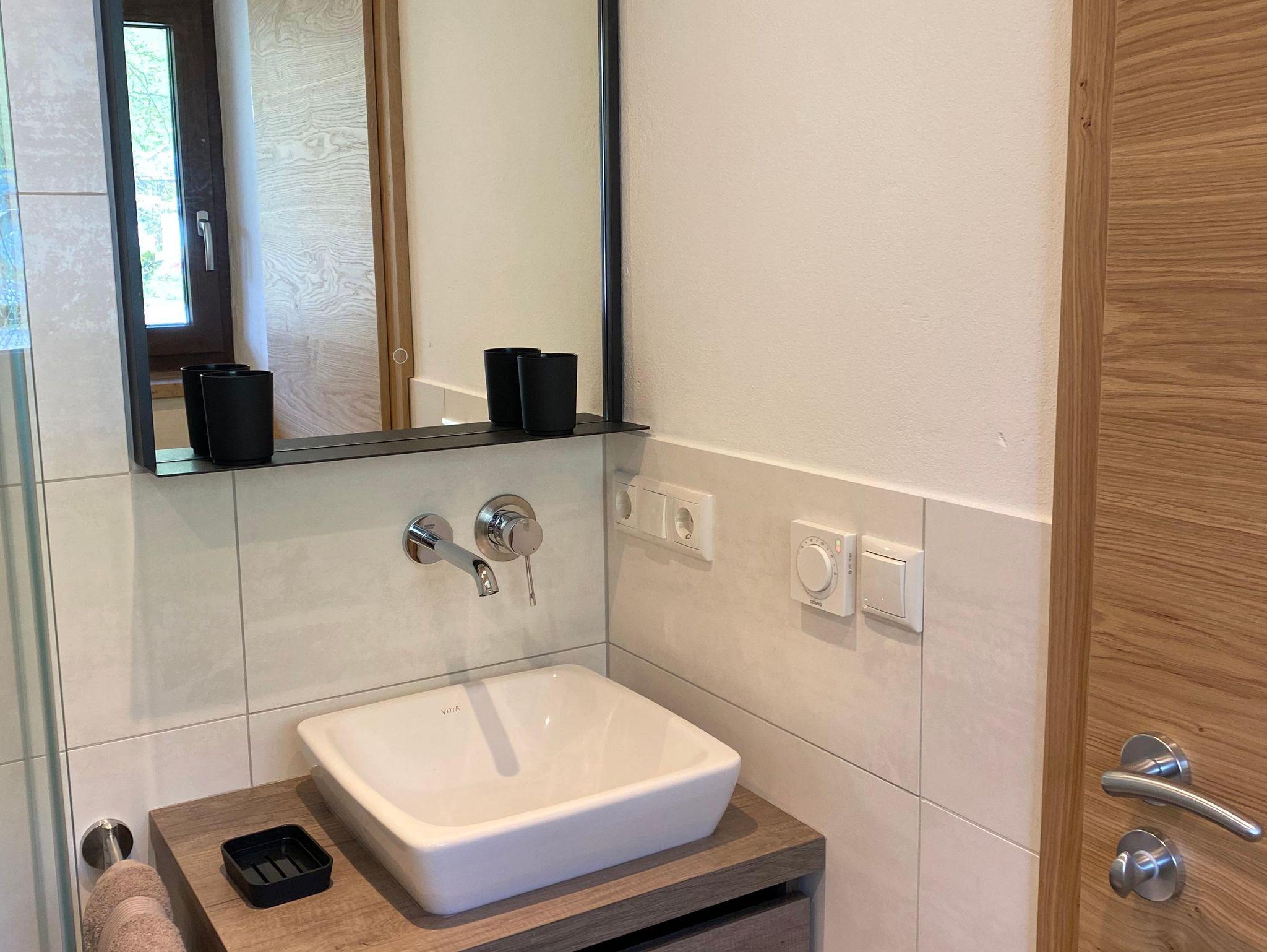 Neuwertige Ferienwohnung (39 qm) zum Wohlfühlen und mit ausreichend Platz für 2 Personen im ersten Obergeschoss: Moderne Ausstattung im Alpenchic, jeder Raum mit Fenster und Fußbodenheizung, überdachter Balkon zur Südseite, kostenloser Stellplatz dirket am Haus. Wohnküche mit Couch, TV, Essbereich und gut ausgestatteter Einbauküche + Dunstabzug. Schlafzimmer mit Doppelbett, Schrank, Gardarobe und Kofferablage. Bad mit Rainshower-Dusche, WC und Waschbecken + beheizbaren Spiegel. Nichtraucher-Wohnung
