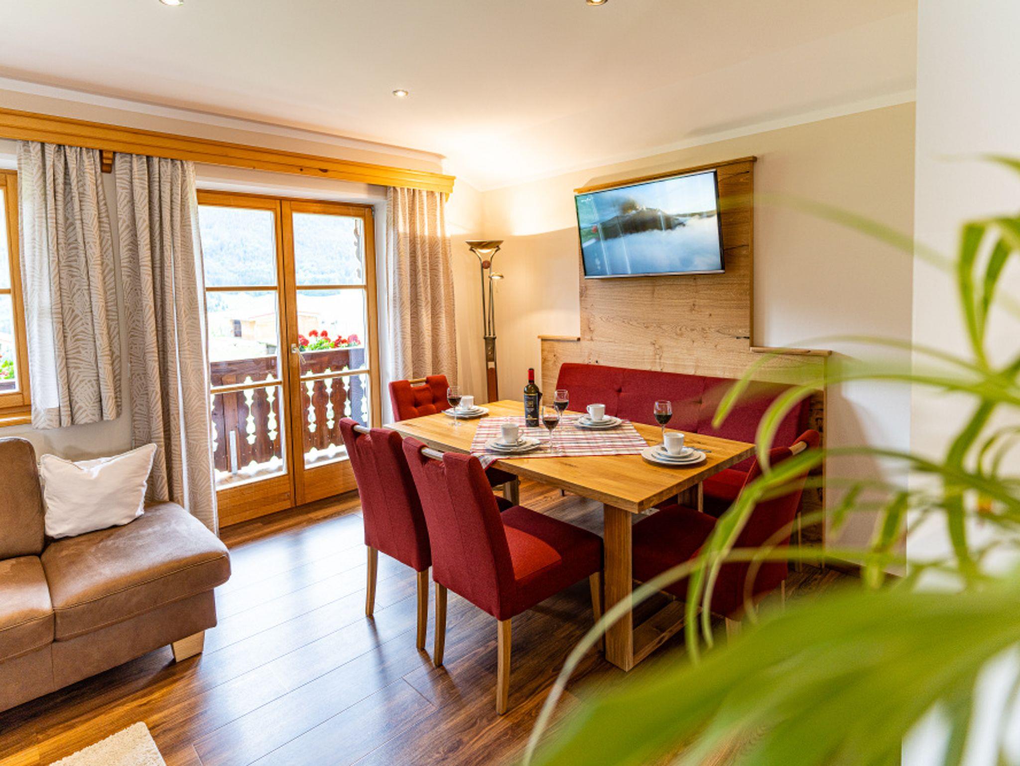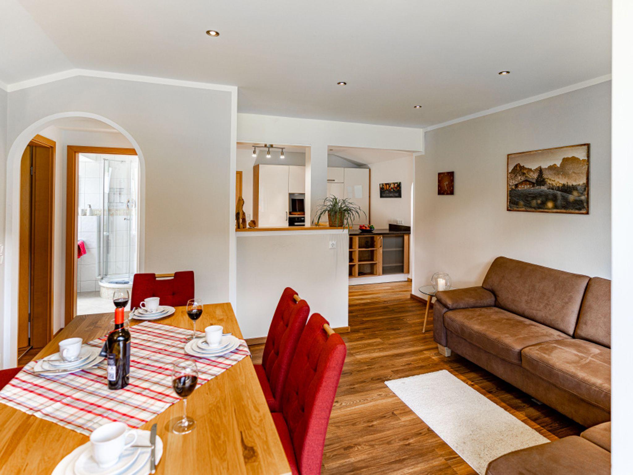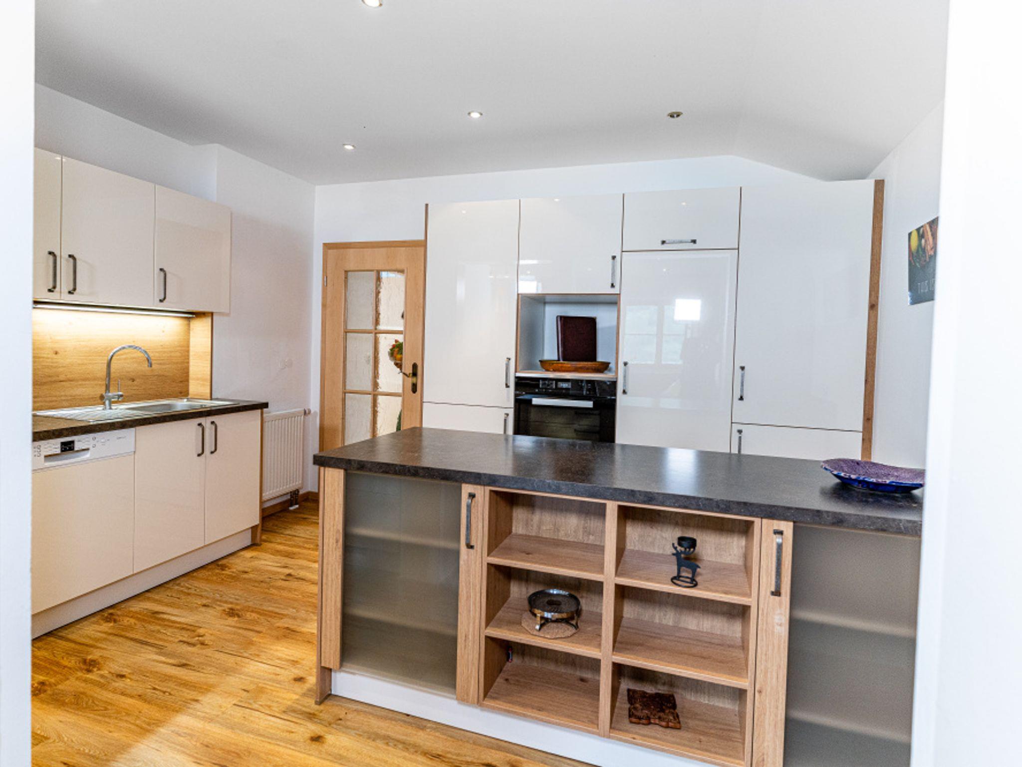 Eine hinreißende Aussicht genießen Sie in unserer großen Ferienwohnung für bis zu 6 Personen – perfekt für Familienurlaube oder für eine tolle Zeit mit Freunden! In der hellen, modern eingerichteten Küche kocht man mit Blick auf die Schärtenalm und hat eine freie Sicht über das Wohnzimmer hinaus zu den Hoftieren.