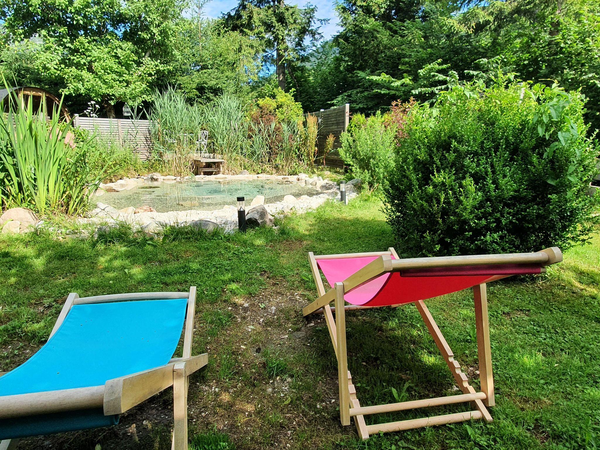 Nichtraucher-Ferienwohnung Almrausch im Erdgeschoss mit Terrasse und Garten zur Westseite für 2-3 Personen, 55 qm, modern eingerichtet, Wohnzimmer mit Schlafcouch, große Essecke für 4 Pers., Smart TV, kostenloses W-LAN,Bluetooth Musikanlage, Schlafzimmer mit Komfortbett, Matratzen mit unterschdl. Härtegraden, Liegehöhe 54 cm, , Küche ausgestattet mit Induktionsherd, Geschirrspüler, Mikrowelle, Filterkaffeemaschine, Toaster, kleiner Backofen, Wasser- und Eierkocher, Badezimmer mit Fön, Dusche und WC, Hygieneartikel wie Shampoo, Toilettenpapier und Seife vorhanden.