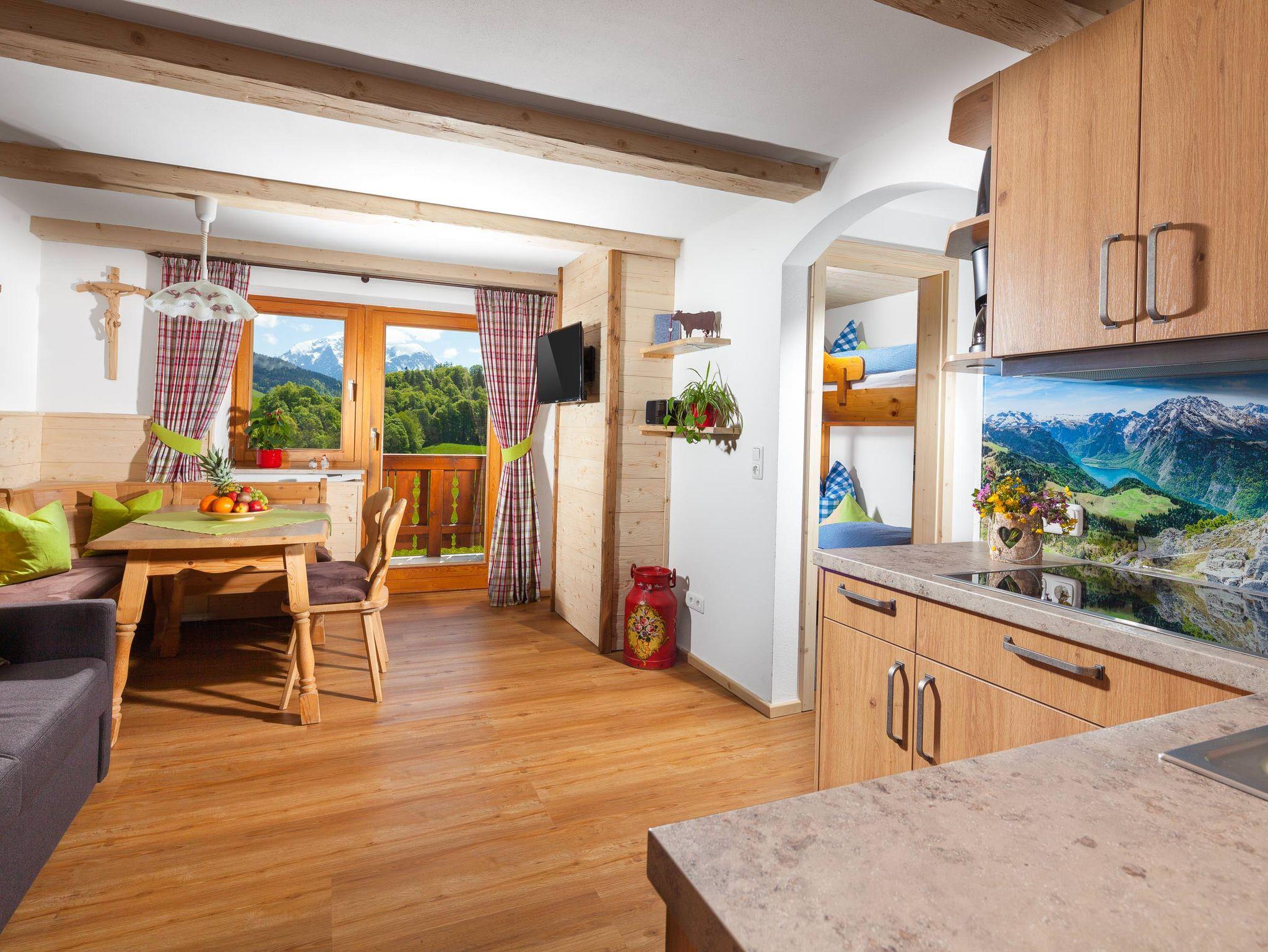 Besonders familienfreundlich für 1-4 Personen/ 2 getrennte Schlafzimmern, eins davon mit Etagenbett, gut ausgestattete Wohnküche mit Spülmaschine, Badezimmer mit WC, großer Ost-Balkon mit herrlichem Blick auf die Berchtesgadener Alpen, TV-SAT, W-LAN.
