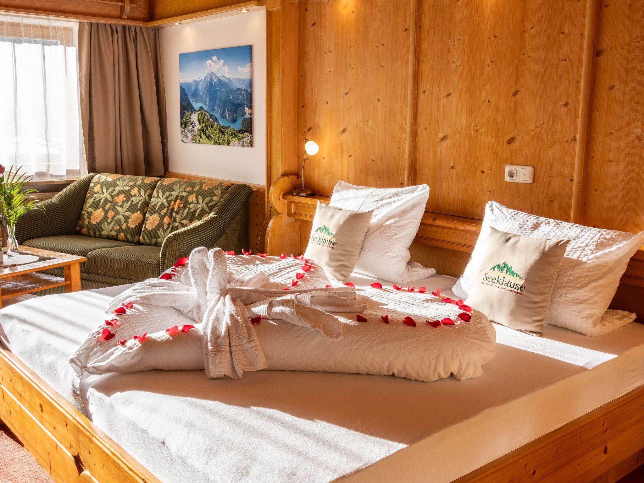 In unserer familiär geführten Hotelpension erwarten Sie geräumige, liebevolle und komfortable 7 Doppelzimmer mit einer Größe von ca. 36 qm. Alle Doppelzimmer haben Bad mit Dusche/WC, Föhn, Hotelkosmetik, Digital-Sat-Flachbild-TV mit 12 Programme, kostenloser W-Lan-Zugang, Safe, Wasserkocher mit Tee und Kaffee, 6 Zimmer mit Südbalkon alle Doppelzimmer mit herrlichem Blick auf den Hintersee, Hochkalter und Berchtesgadener Alpen. Pension, Balkone und Gaststube sind Nichtraucherzonen. Rauchen ist nur vor der Pension und auf der Terrasse gestattet. Kostenfreie Internetstation und W-Lan stehen zur Verfügung