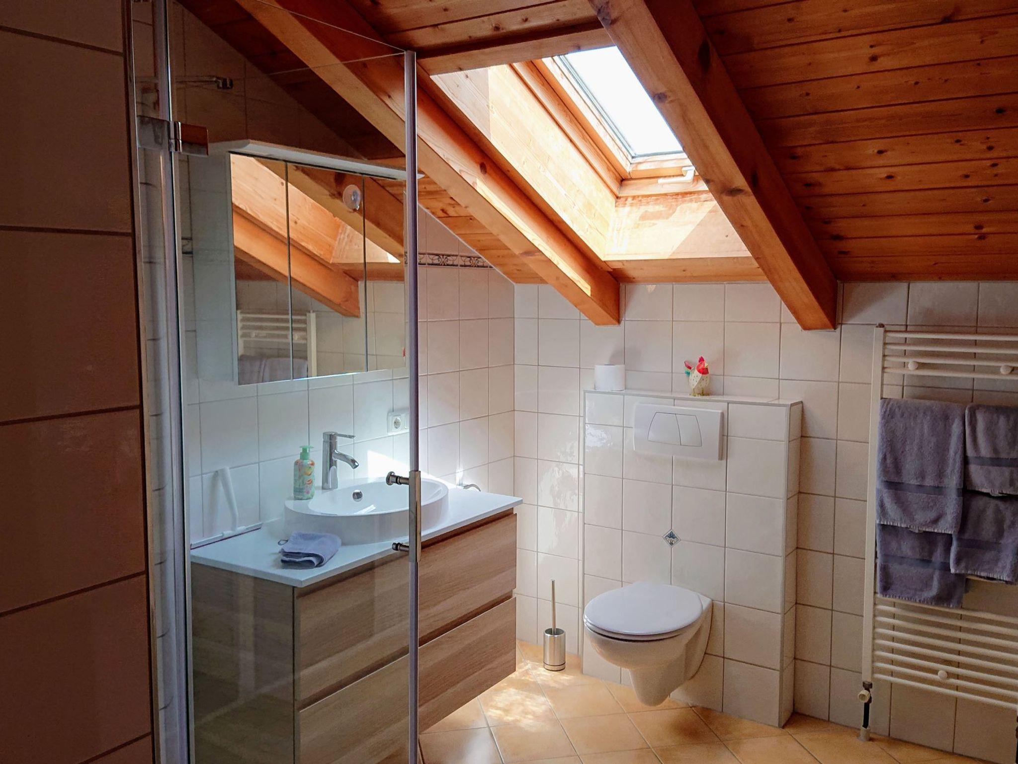 Großzügige und hell und freundlich eingerichtete Ferienwohnung (58 qm) in ruhig gelegenen Einfamilienhaus in bester Lage von Ramsau. Im modernen Landhausstil eingerichtet, steht Ihnen im 2. Stock das gesamte Dachgeschoss mit Sichtdachstuhl zur Verfügung. Fußbodenheizung in jedem Zimmer, helles Tageslichtbad und 2 Balkone mit herrlichem Bergblick sowie WLAN und eigener Parkplatz. Wohnbereich mit bequemen Ecksofa (ausgezogen als Schlafmöglichkeit verwendbar), Leselampe und TV. Die Küchenzeile ist mit 4-Plattenherd, Kühlschrank und Tiefkühlfach versehen und mit Kaffeemaschine, Wasserkocher, Toaster, Eierkocher, Topfset von Fissler und Geschirr im Landhausstil ausgestattet. Die Essecke besteht aus einer gemütlichen Eckbank mit Holztisch, 2 Stühlen und Tischleuchte. Im viel Platz bietenden Bad mit großem Dachfenster befinden sich Dusche, Waschbecken und Toilette. Das Schlafzimmer hat ein Doppelbett, Bauernschrank, sowie eine komfortabler Sitzecke mit kleinem Sofa, Sessel, Glastisch und Lampe. Zwei Balkone mit Gartenstühlen und Balkontisch laden zum Entspannen ein.