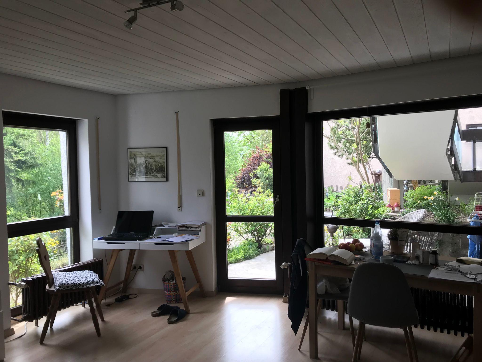 Die Küchenzeile ist funktionsfähig (Kühlschrank, Herdplatten, Kaffeemaschine, Geschirr) ausgestattet. Es gibt eine abschließbare Abstellmöglichkeit für Fahrräder und der Mainradweg ist fünf Minuten entfernt.