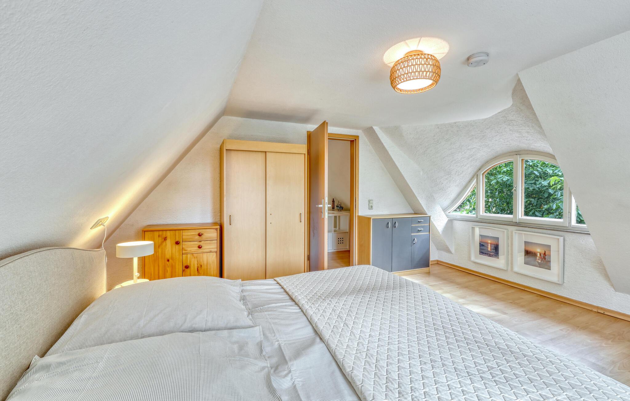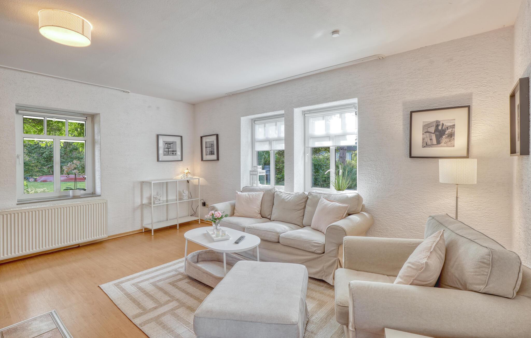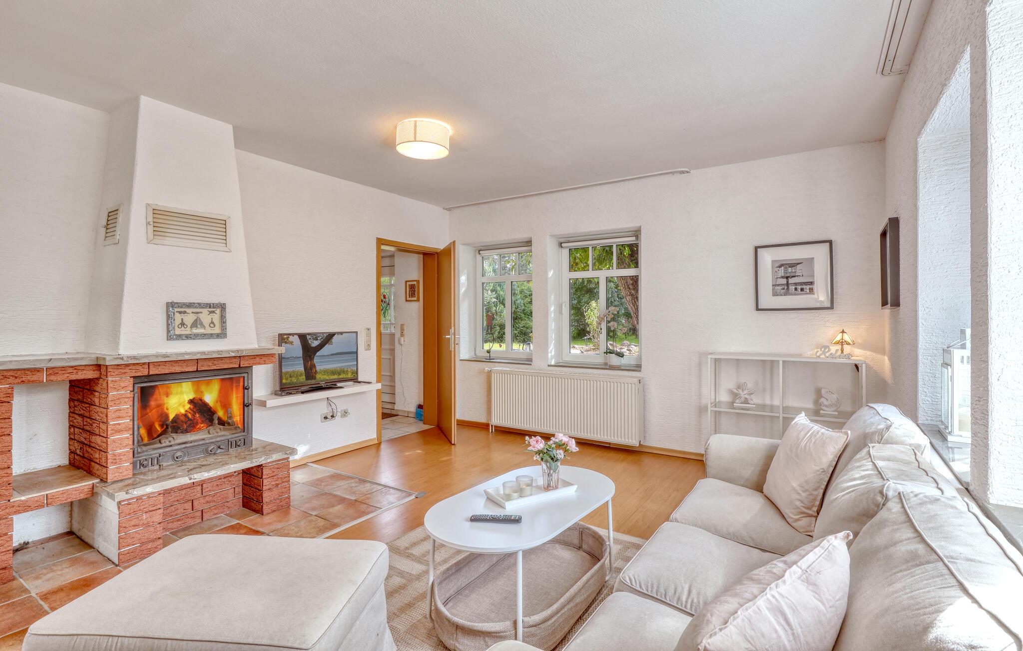 Det lyse interiør byder på komfortable siddepladser i stuen. Brug pejsen til at skabe en varm atmosfære på kølige dage og sæt jer til rette med en god bog eller foran fjernsynet. Tilbered jeres måltider i det rummelige køkken med moderne apparater og nyd dem ved spisebordet med udsigt over haven.