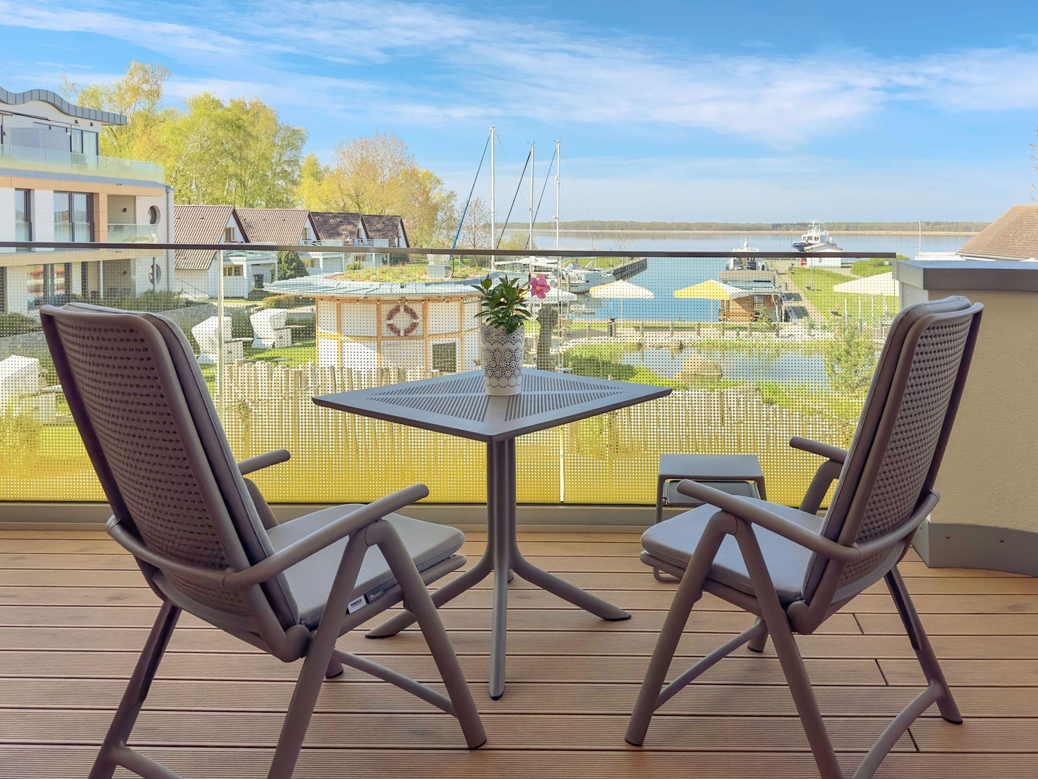 70m² Suite im OG für 2 Personen. Schlafzimmer mit Doppel-Boxspringbett (180x200). 20 m² Balkon mit einmaligem Blick auf Wasser und Hafen. Nichtraucher-Suite. Parkplatzund WLAN sind inklusive. Turmsauna mit Dachterrasse, Fitnessraum und Frühstück sind vor Ort zu buchbar. Wäschepaket und Endreinigung einmalig 139,- €.