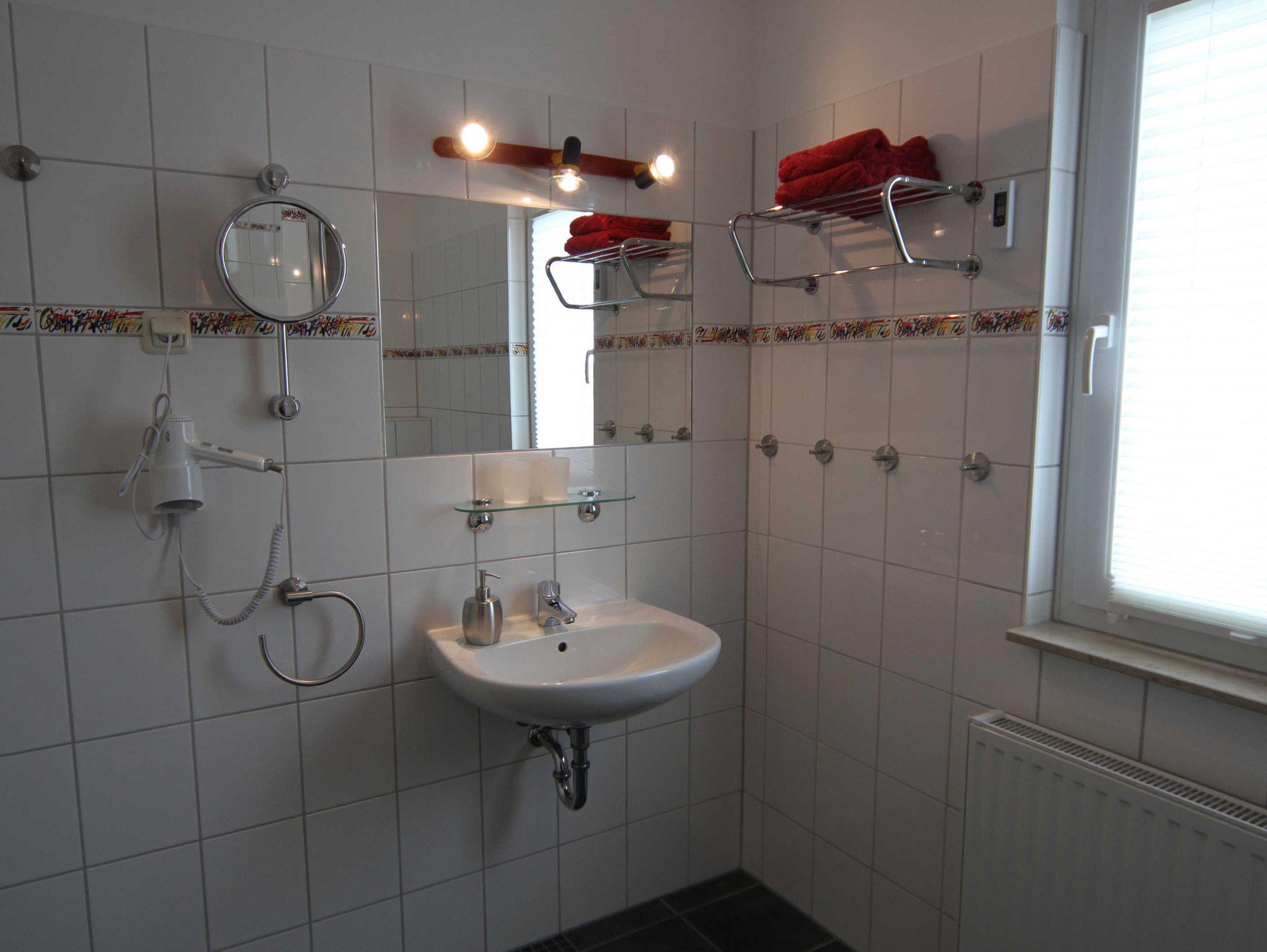 Im Erdgeschoss - Wohnbereich, Sitzgruppe, Sat ? TV, Stereoanlage, DVD Player - Essbereich für bis zu 4 Personen - Voll ausgestatteter Küchenbereich mit Ceranfeld, Backofen, Geschirrspüler, Kühl/Gefrierkombination, Mikrowelle, Kaffemaschine, Toaster und Wasserkocher - 1 Schlafraum mit Doppebett ( 1,80 x 2,00 ) und Sat-TV, 1 Schlafstube mit Einzelbett ( 0, 90 x 2,00 ) und Sat-TV - Bad mit Dusche, WC, Infrarotwellen Wärmeplatte und Haarfön - großer Flur mit Garderobe - kleiner Flur mit Schrank