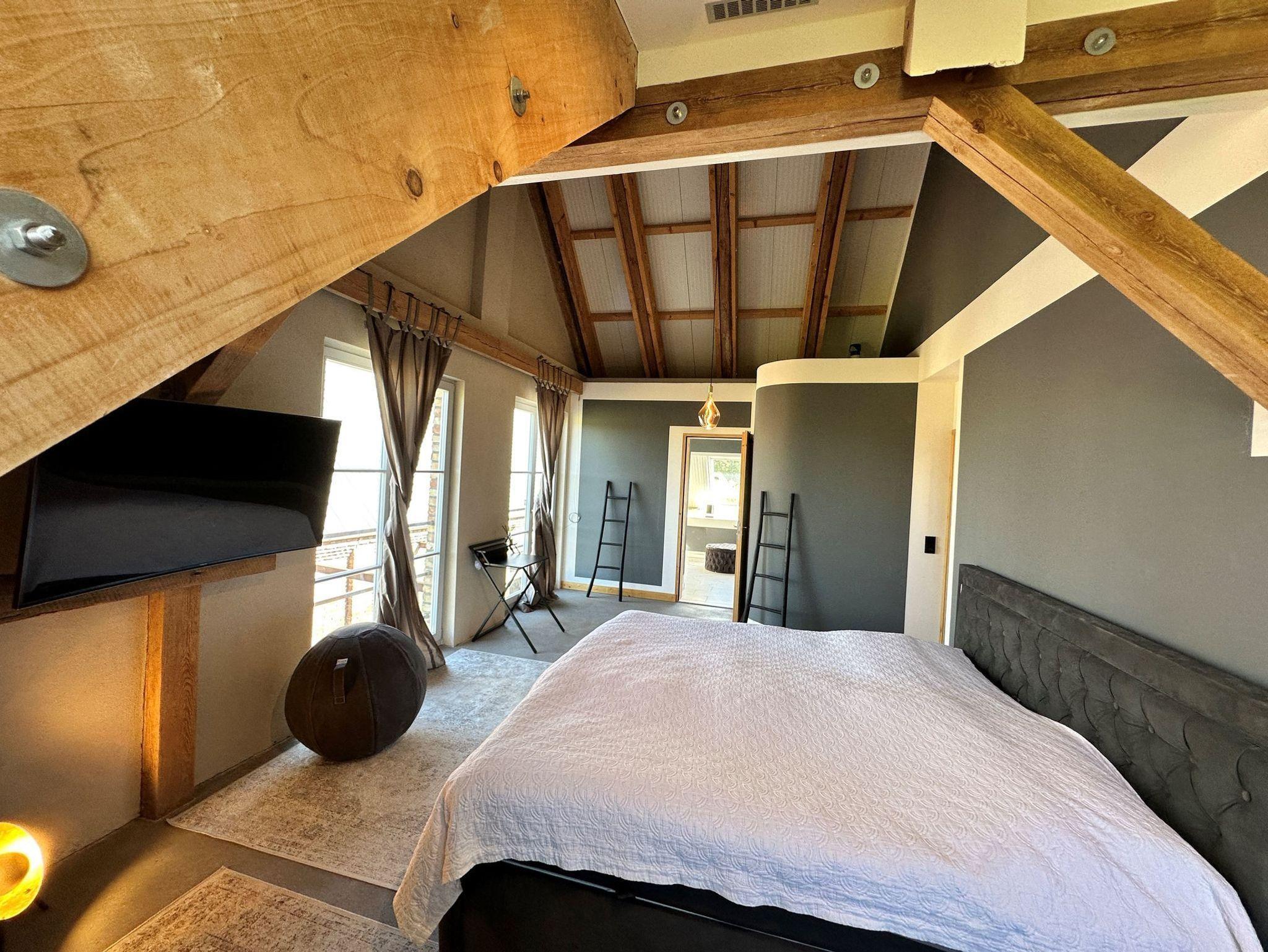 • Ein stilvolles Masterbedroom mit imposanter Spitzdecke und viel Raum für Erholung.