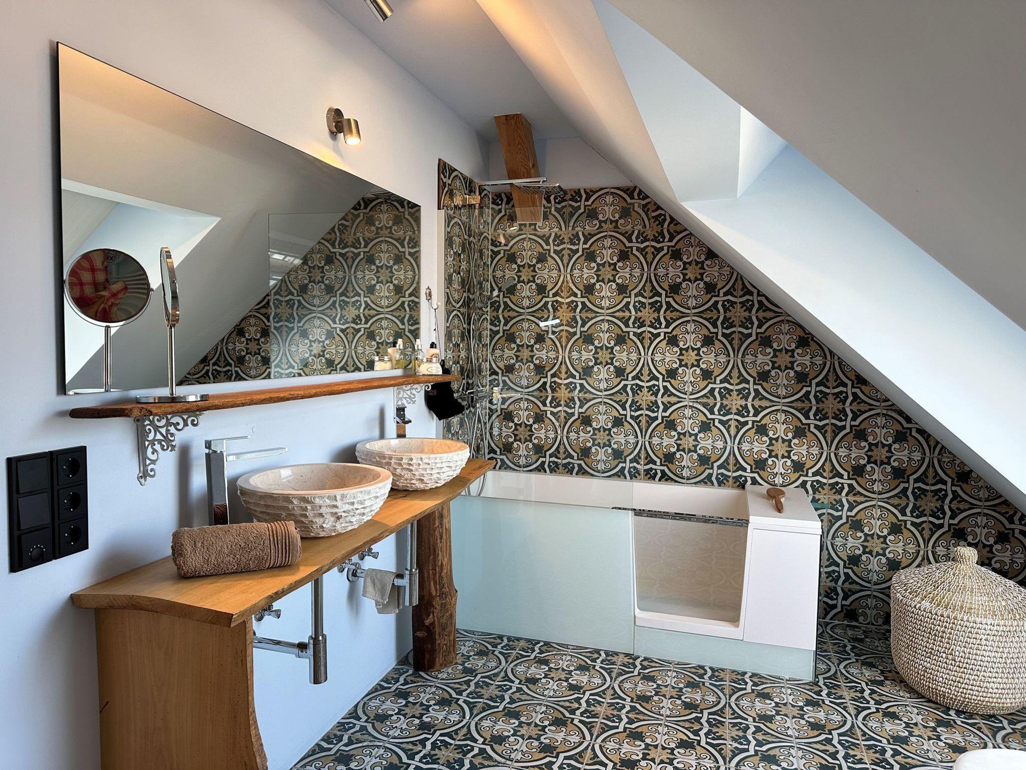 • Badezimmer-Highlights: Eine elegante Badewanne im einen, eine begehbare Dusche im anderen Zimmer.