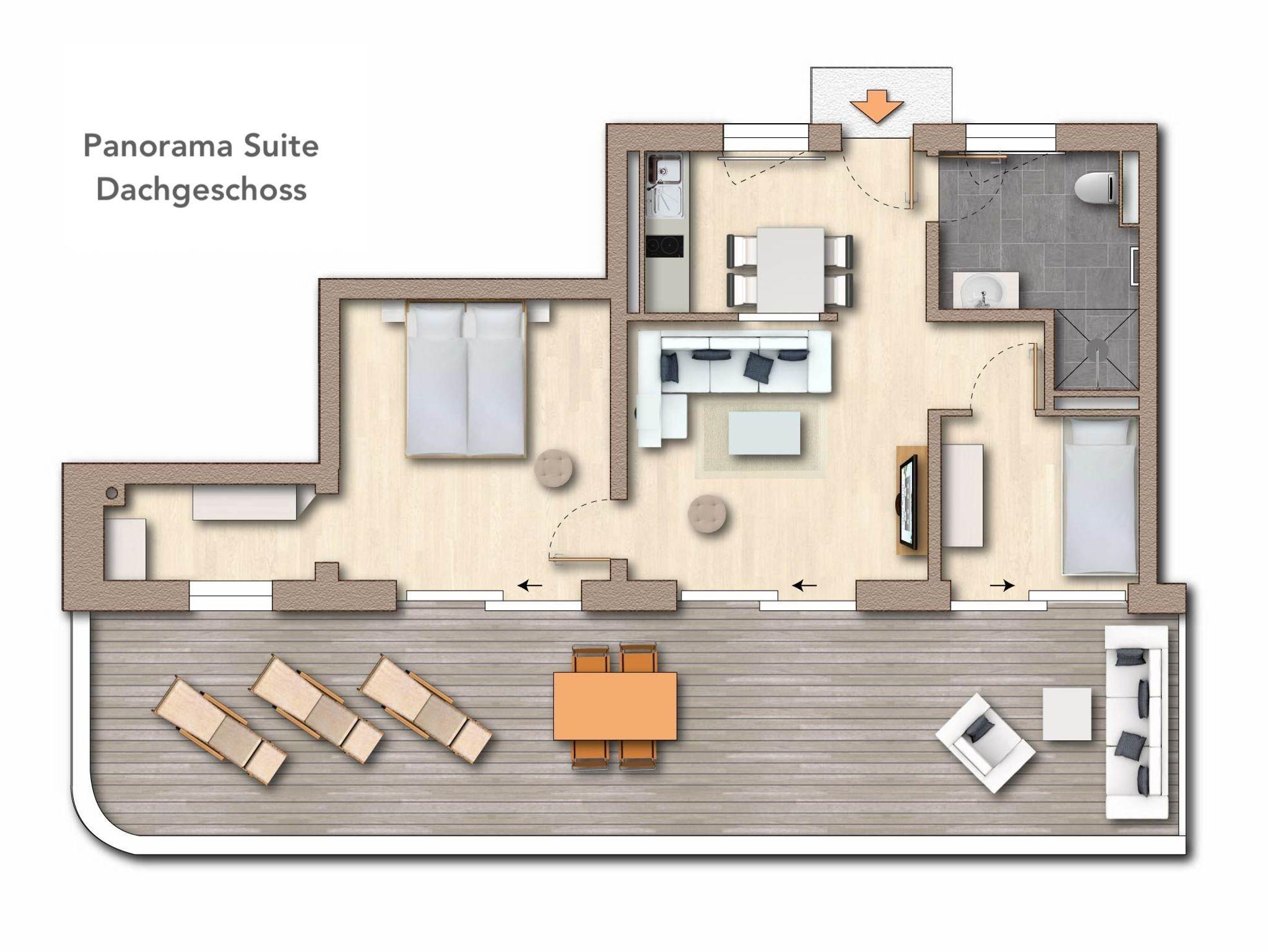 Die Panorama Suite bietet reichlich Platz auf der XXL-Dachterrasse, von der Sie abends die schönsten Sonnenuntergänge der Insel genießen können. Lassen Sie Seele und Geist baumeln.