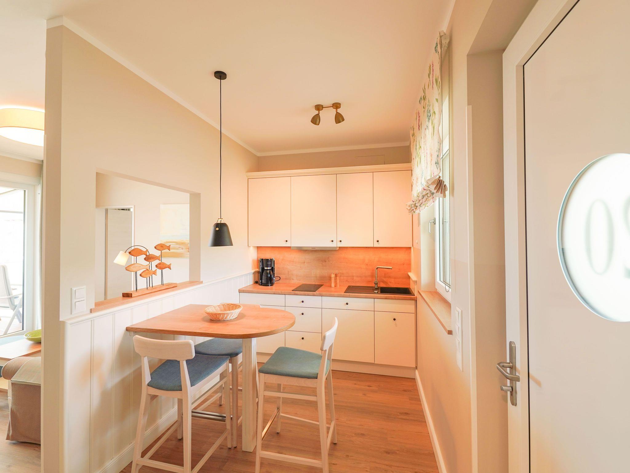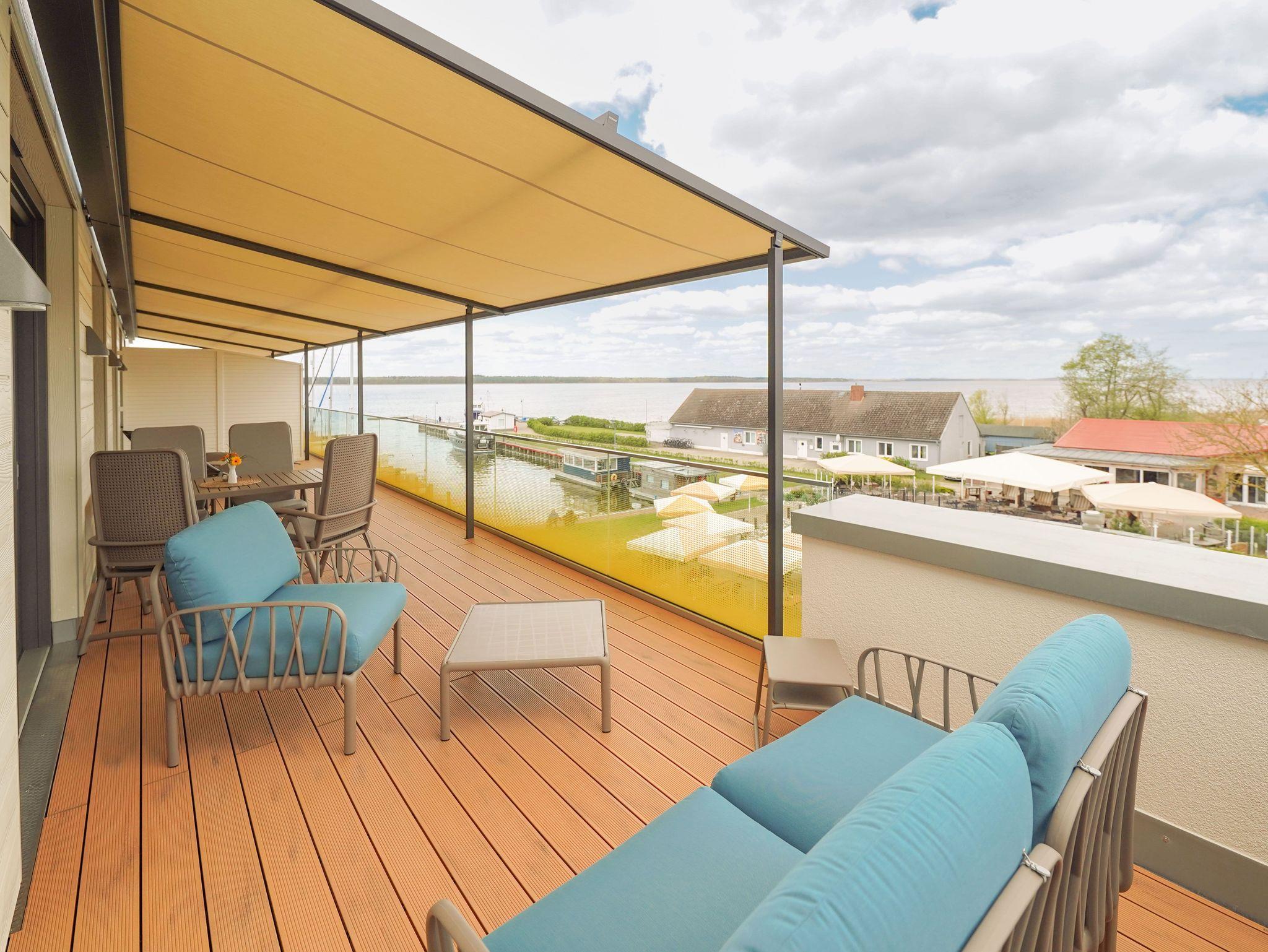 60m² Suite im DG für bis zu 3 Personen, alle Schlafzimmer mit Boxspringbett (180x200). Voll-ausgestattete 2-Stellen Kochfeld Küche. 40 m² Dachterrasse mit einmaligem Blick auf Wasser und Hafen. Nichtraucher-Suite. Parkplatz und WLAN sind inklusive. Dachsauna mit Terrasse, Fitnessraum und Frühstück sind vor Ort zu buchbar. Wäschepaket und Endreinigung einmalig 139,- €.
