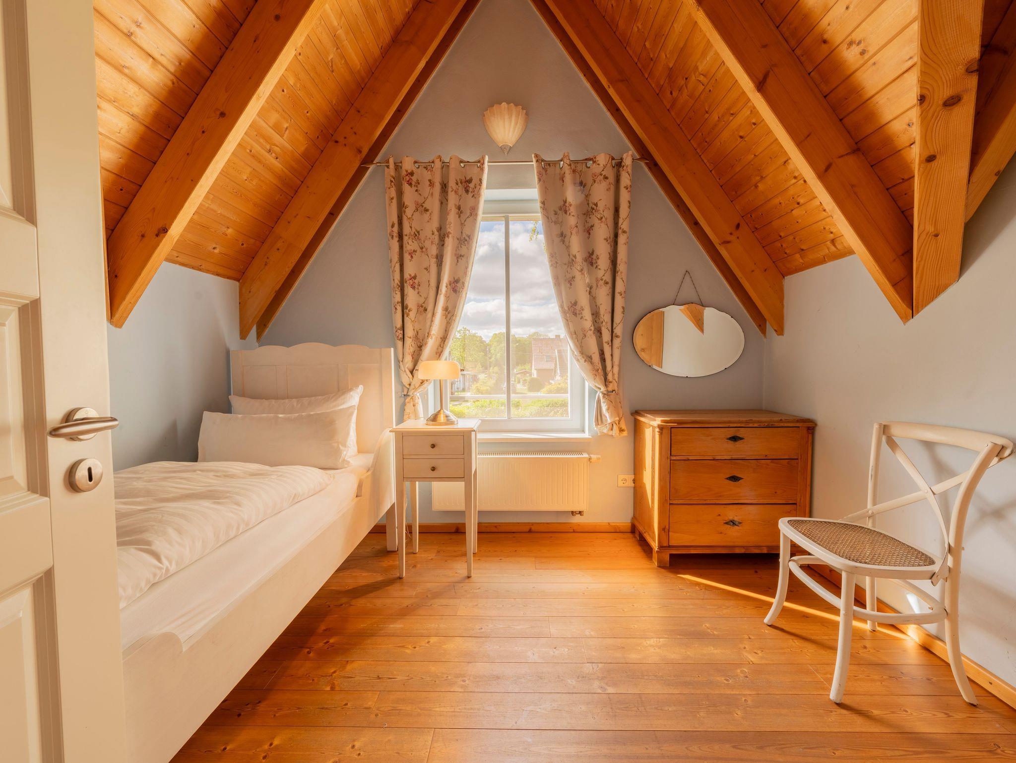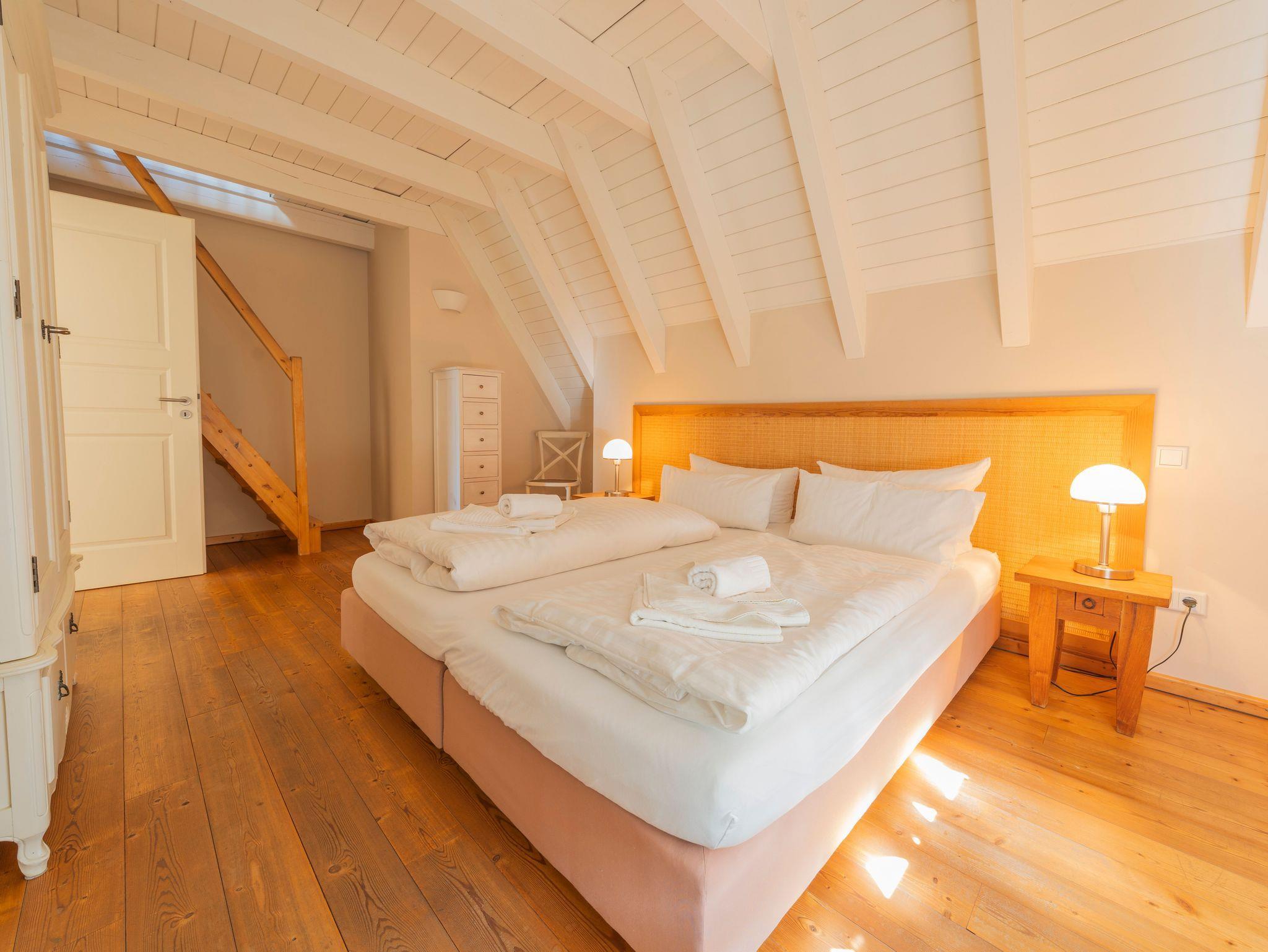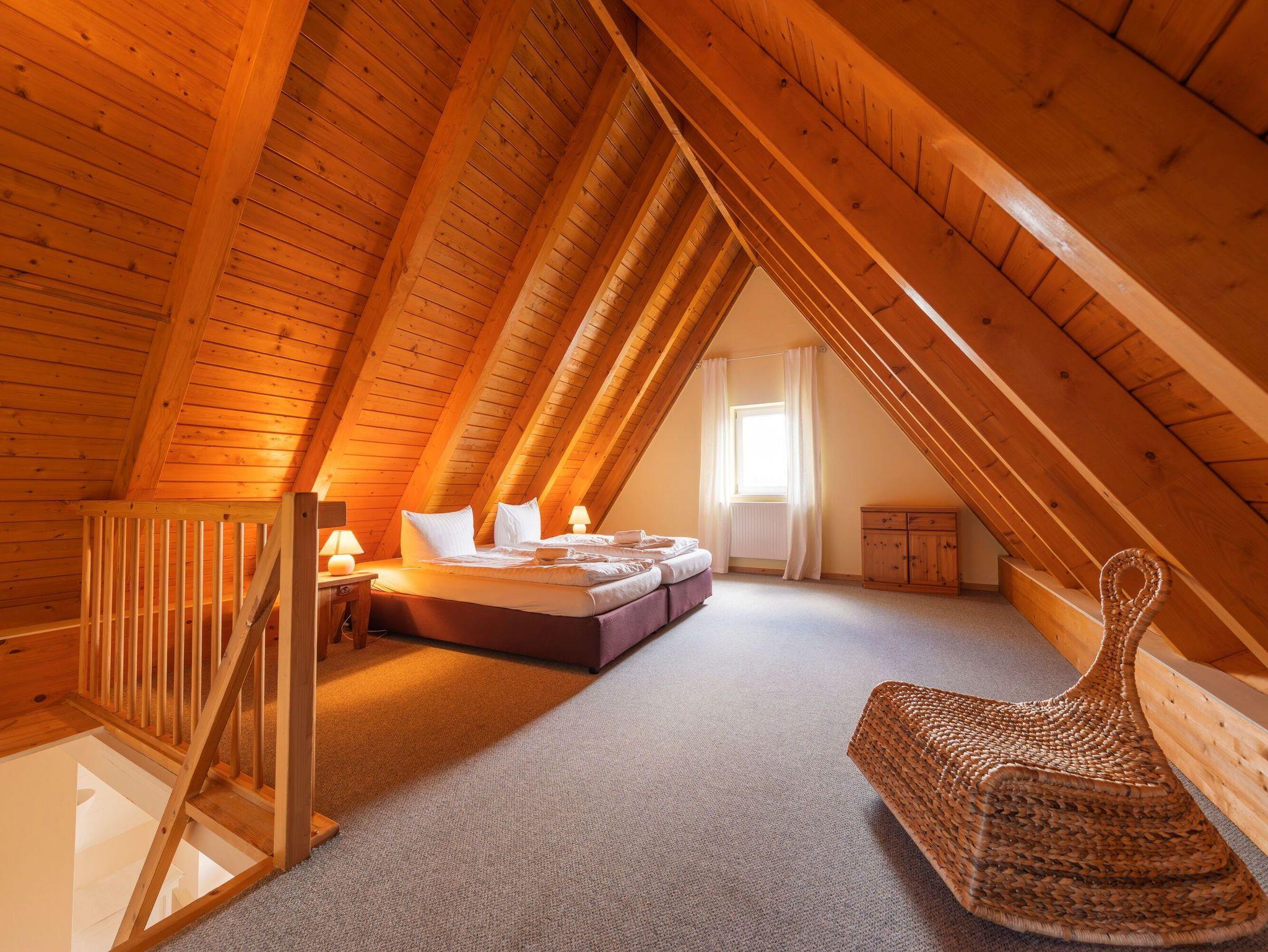 • Spitzboden: Über ein Schlafzimmer über eine Treppe erreichbar (nicht barrierefrei), mit Doppelbett und Schlafcouch ideal für zusätzliche Gäste