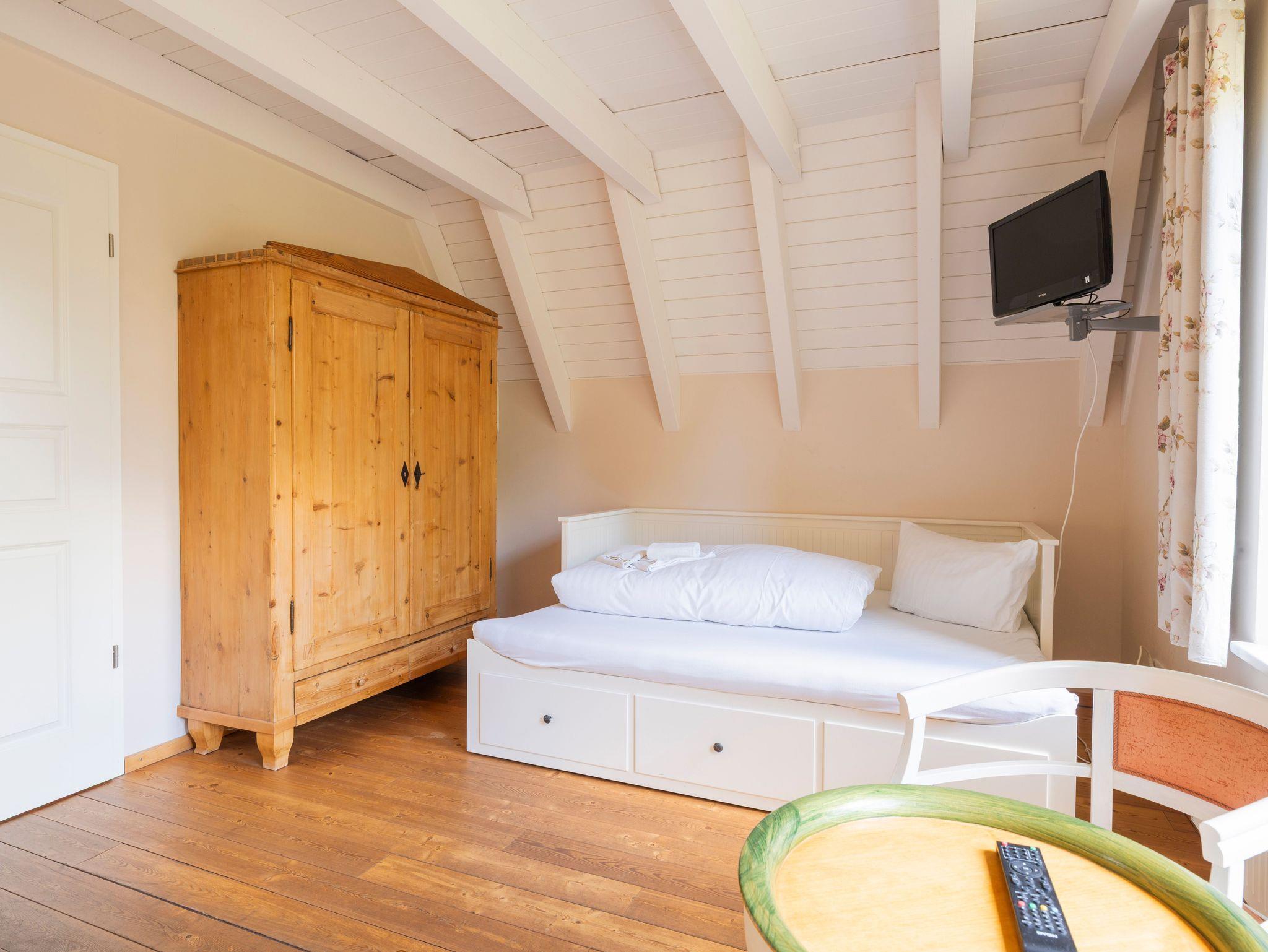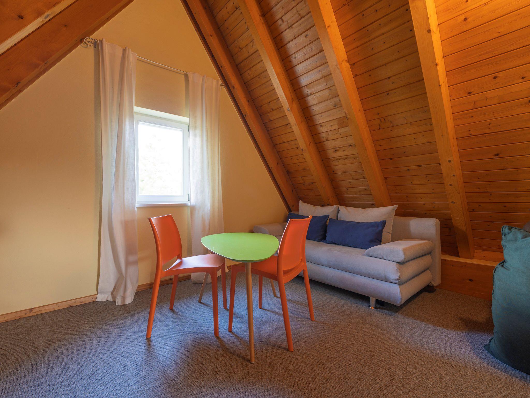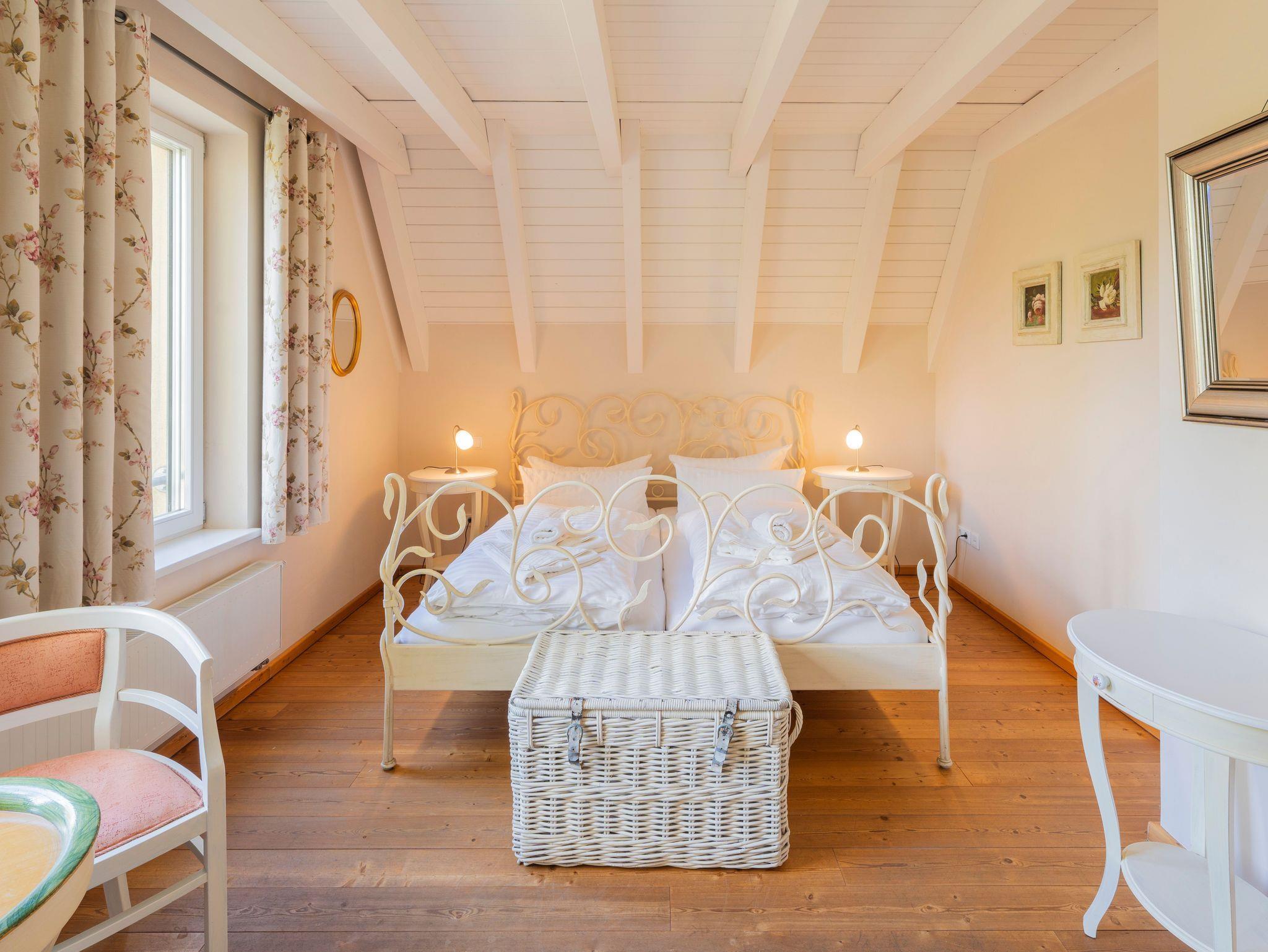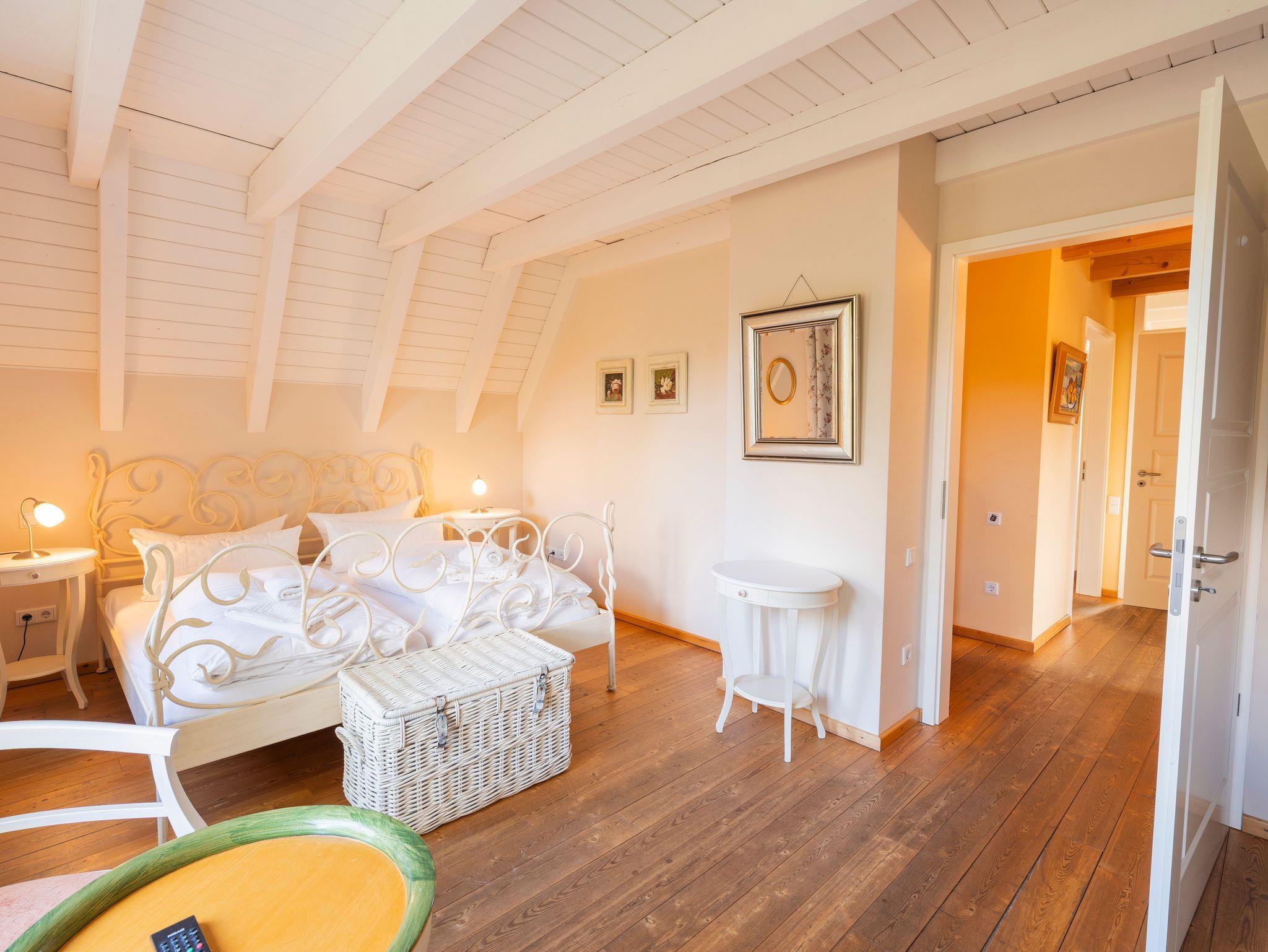 • Spitzboden: Über ein Schlafzimmer über eine Treppe erreichbar (nicht barrierefrei), mit Doppelbett und Schlafcouch ideal für zusätzliche Gäste