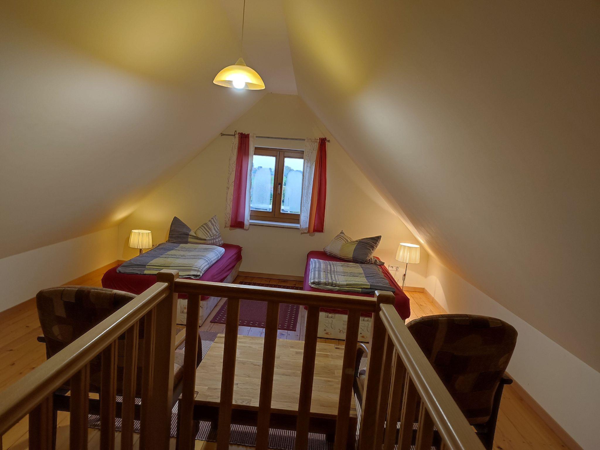 Diese 3 Raum Ferienwohnung im 1.OG verteilt sich auf 2 Etagen. Wohnzimmer mit integrierter Küchenzeile und TV. Schlafzimmer mit Doppelbett, ein Schlafzimmer mit 2 Einzelliegen ist über eine Treppe im ausgebauten Dachgeschoß zu erreichen. Eine Sitzgelegenheit im Garten mit Grillmöglichkeit ist vorhanden. PKW Stellplatz auf dem Grundstück. Handtücher bitte selbster mitbringen. Alle Nebenkosten sind im Preis inklusive!