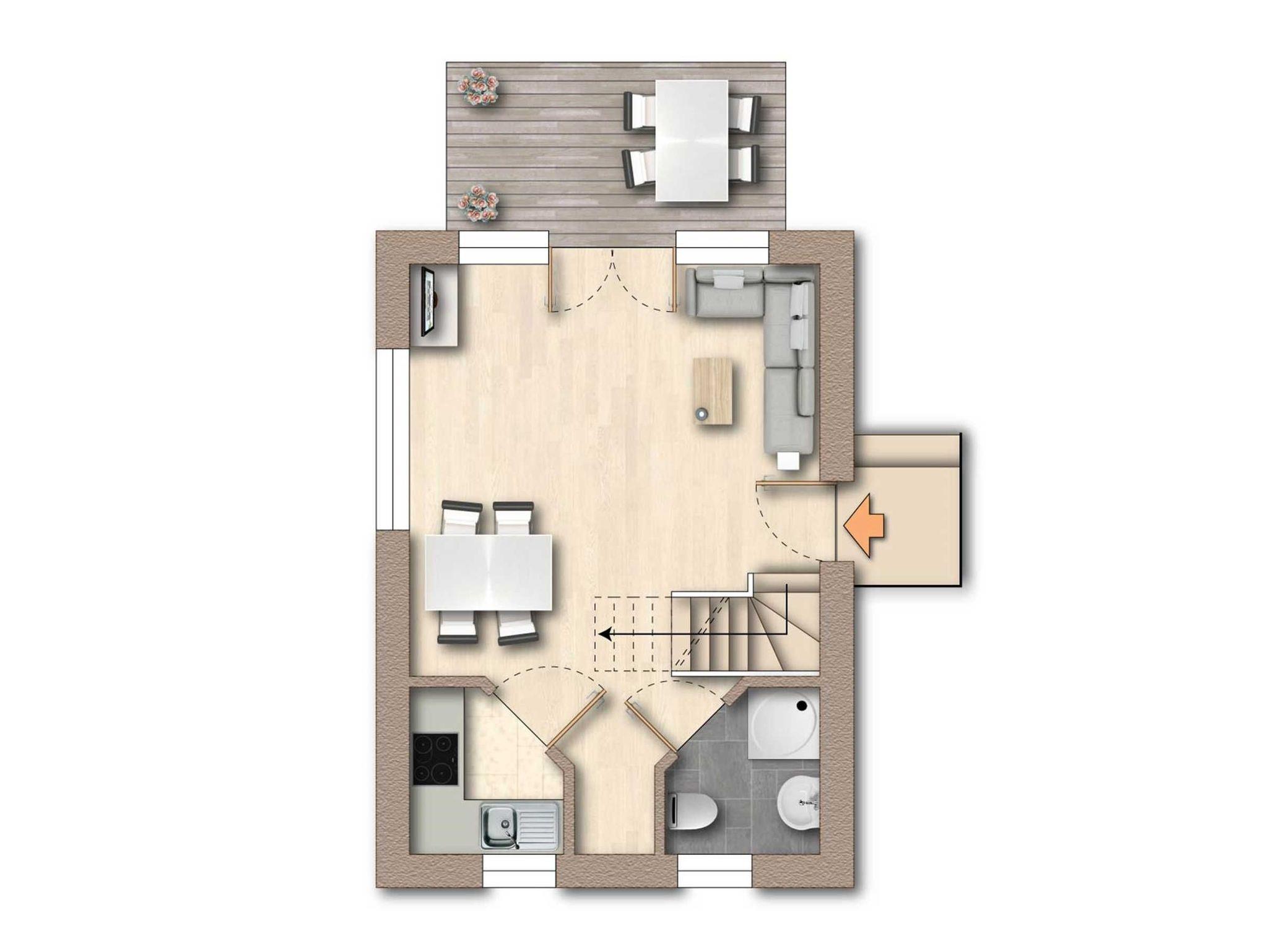 Im Erdgeschoss erwarten Sie ein einladender Wohn- und Essbereich, eine kompakte Küchenzeile sowie ein modernes Bad mit ebenerdiger Dusche und WC. Im Dachgeschoss befinden sich zwei Schlafzimmer sowie ein großzügiger Balkon mit herrlichem Ausblick.
