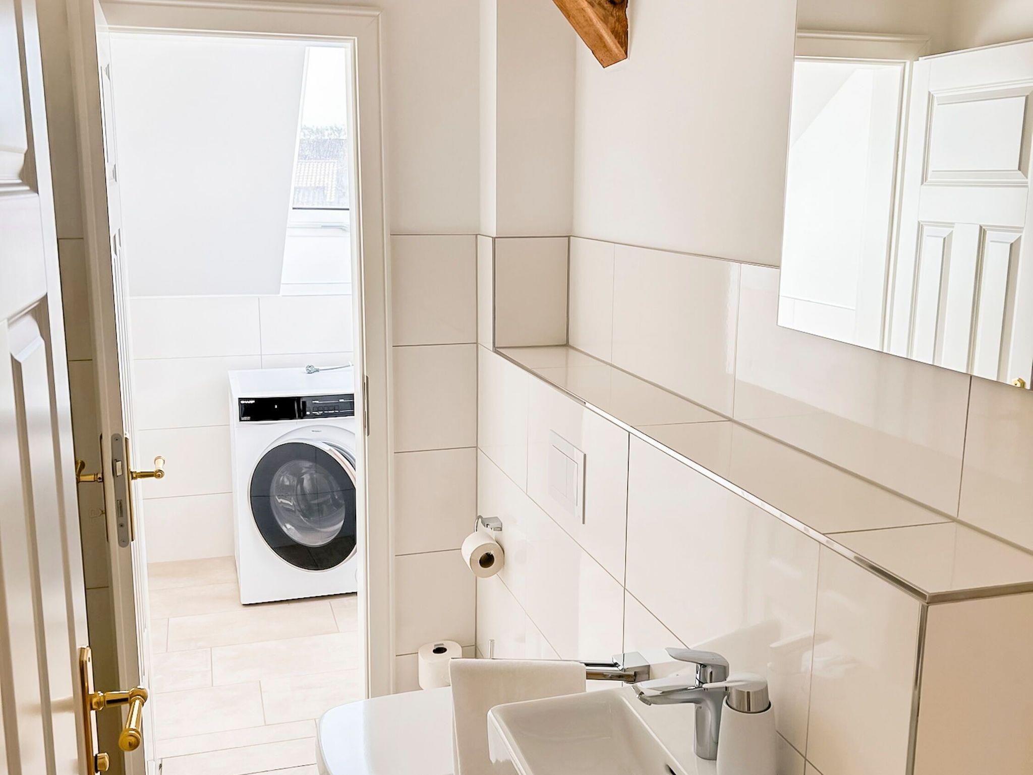 • Moderne Bäder: Ein Badezimmer mit Badewanne, Dusche, Waschtisch und WC sowie ein zusätzliches Gäste-WC und ein separater Waschraum stehen zur Verfügung.