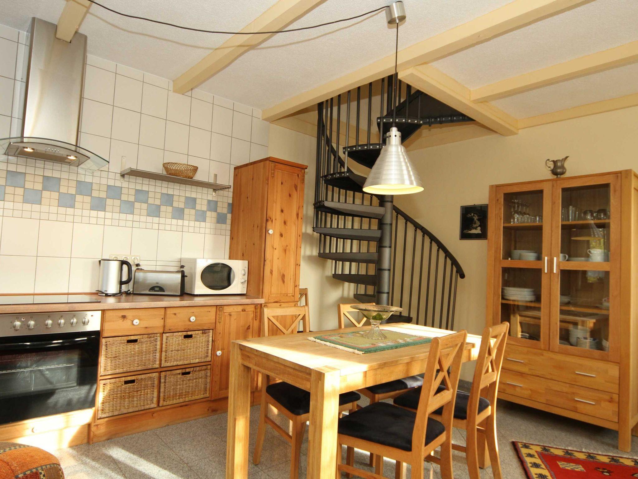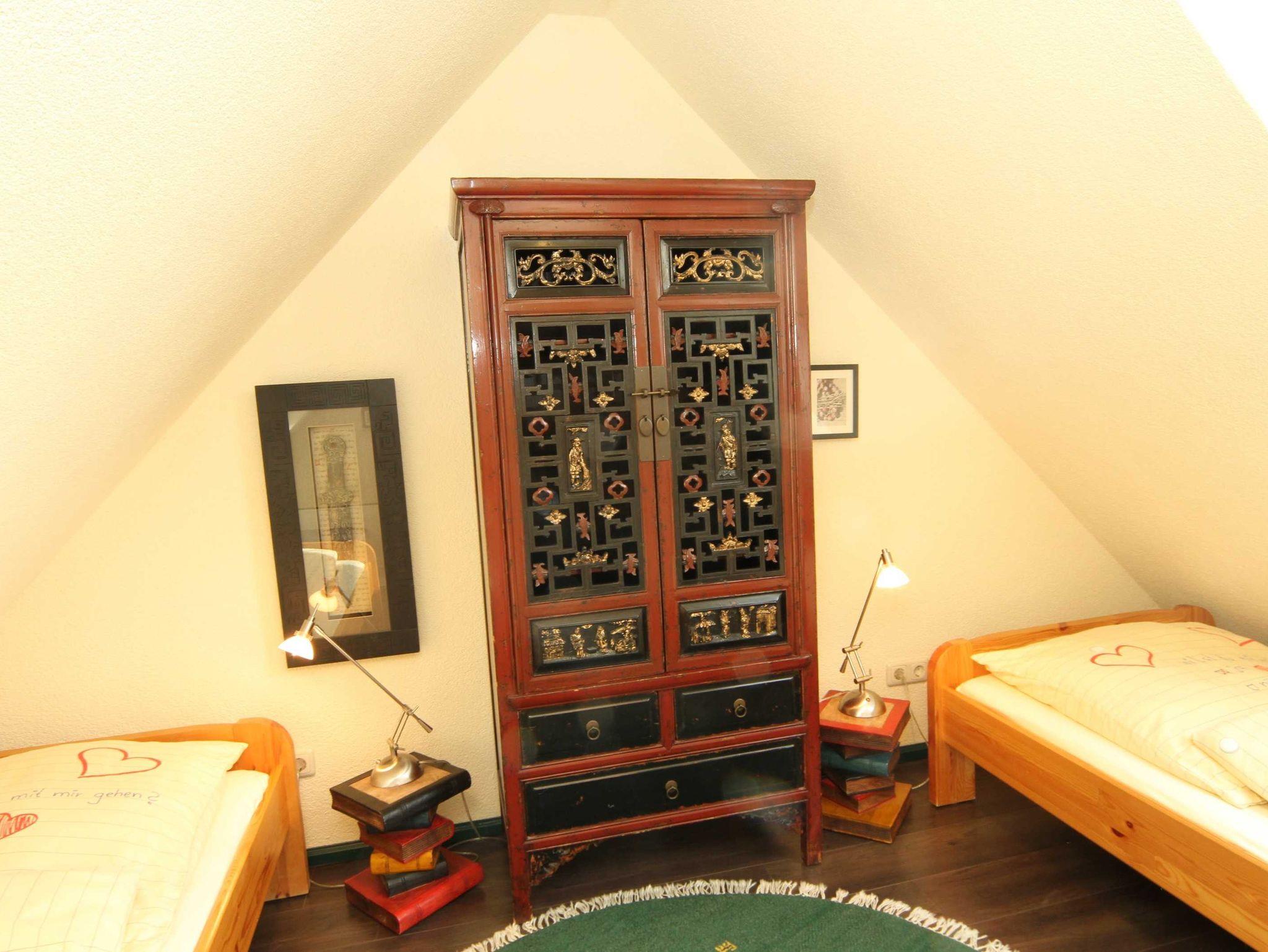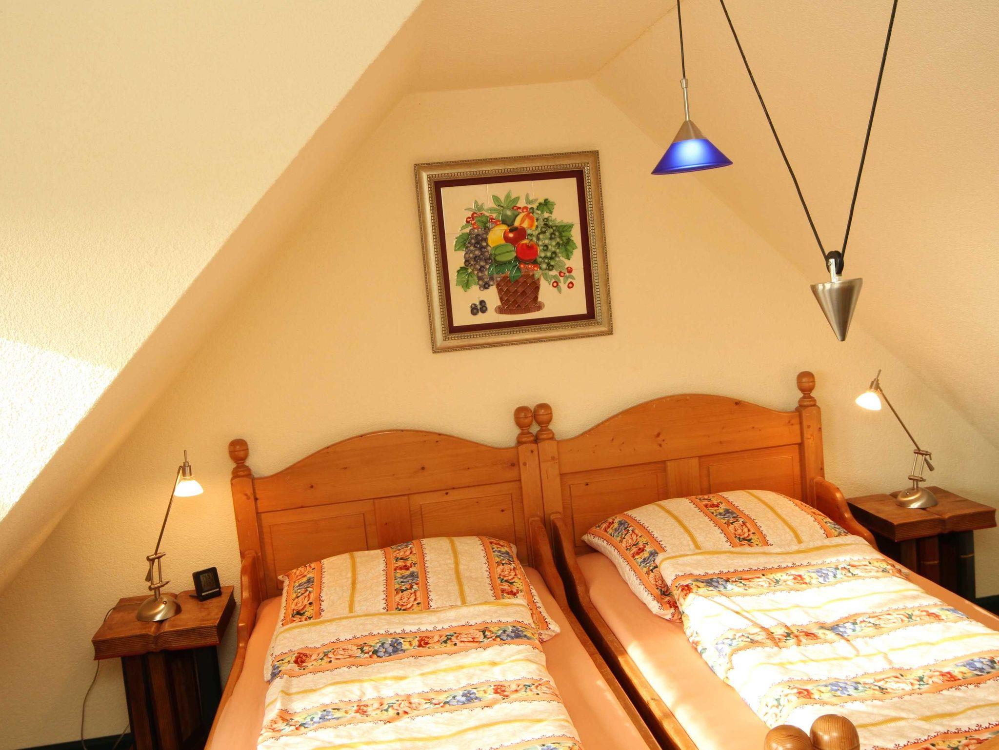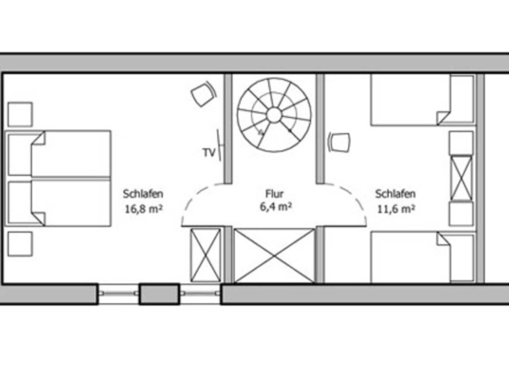 Über eine Wendeltreppe gelangen Sie in einen kleinen Vorflur des DG von dem zwei Schlafräume abzweigen. Alle Räume im DG haben Dachschrägen. Ein Schlafzimmer ist mit Ehebett und eins mit Einzelbetten ausgestattet.