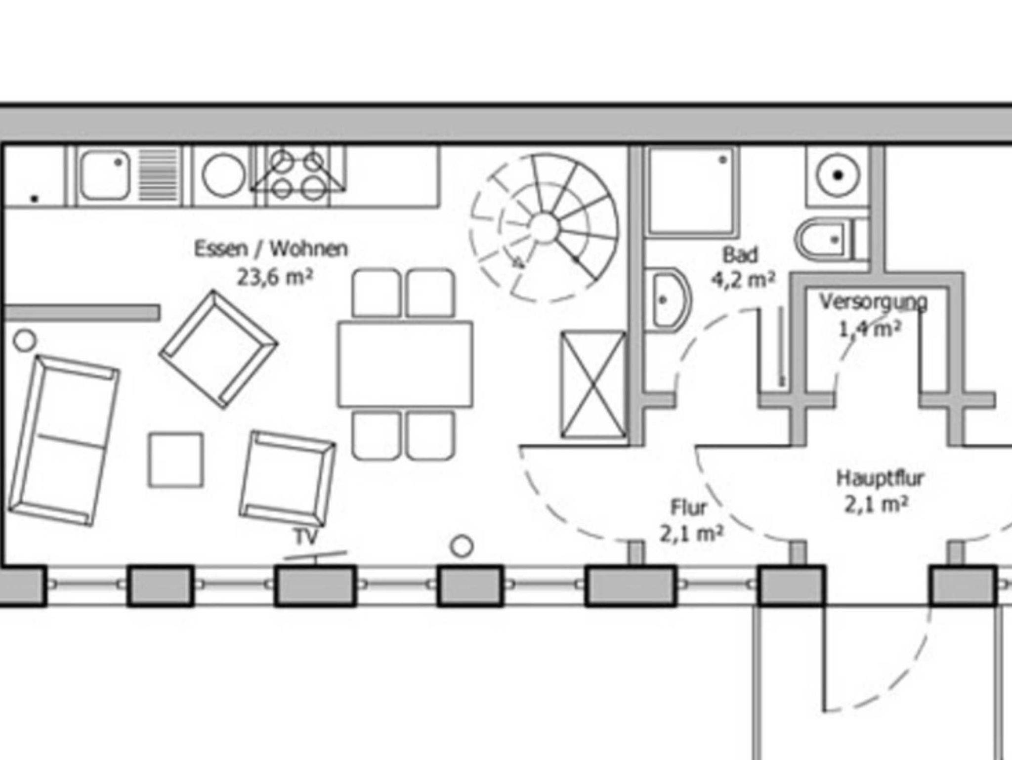 Von diesem gelangen Sie ins Bad und in den Küchen-, Ess- und Wohnbereich. Das Bad ist ausgestattet mit Dusche, WC, Haarfön. Vom Essbereich gelangen Sie in den gemütlichen Wohnbereich mit Couchgarnitur und Sat-TV,Stereoanlage sowie in den vollständigen Küchenbereich mit Ceranfeld, Backofen, Geschirrspüler, Kühl-/Gefrierkombination, Mikrowelle, Kaffeemaschine, Toaster, Wasserkocher und Geschirr.