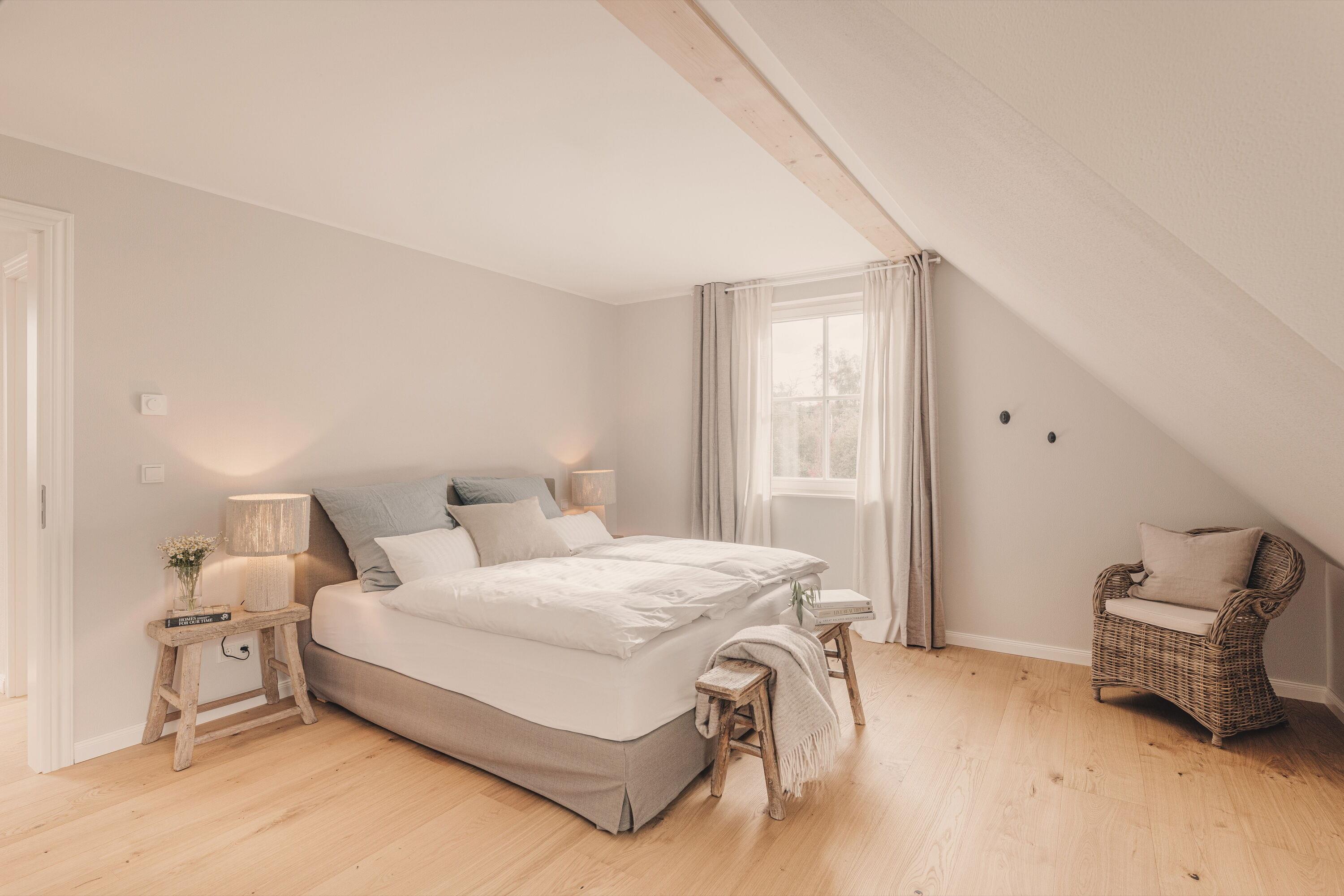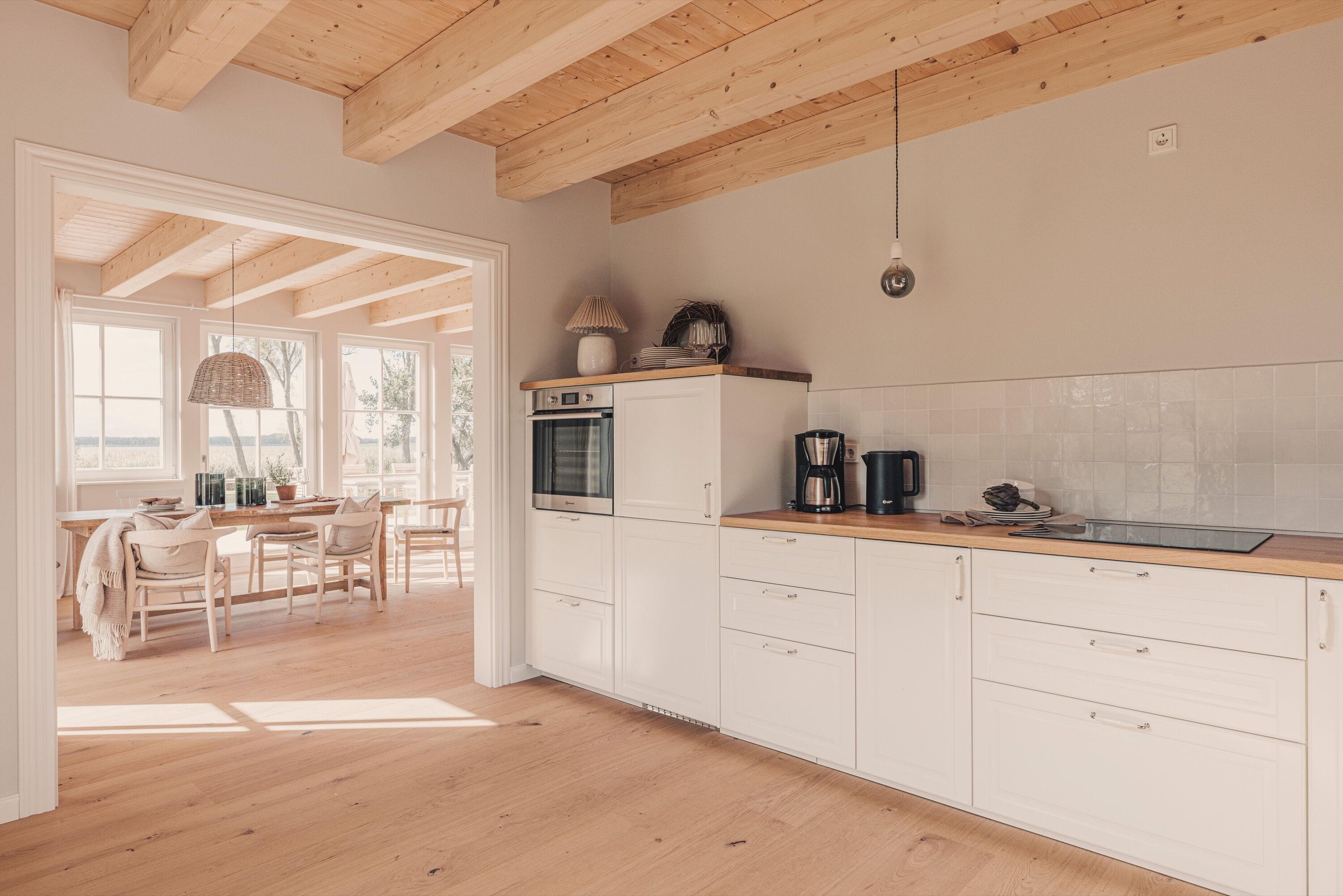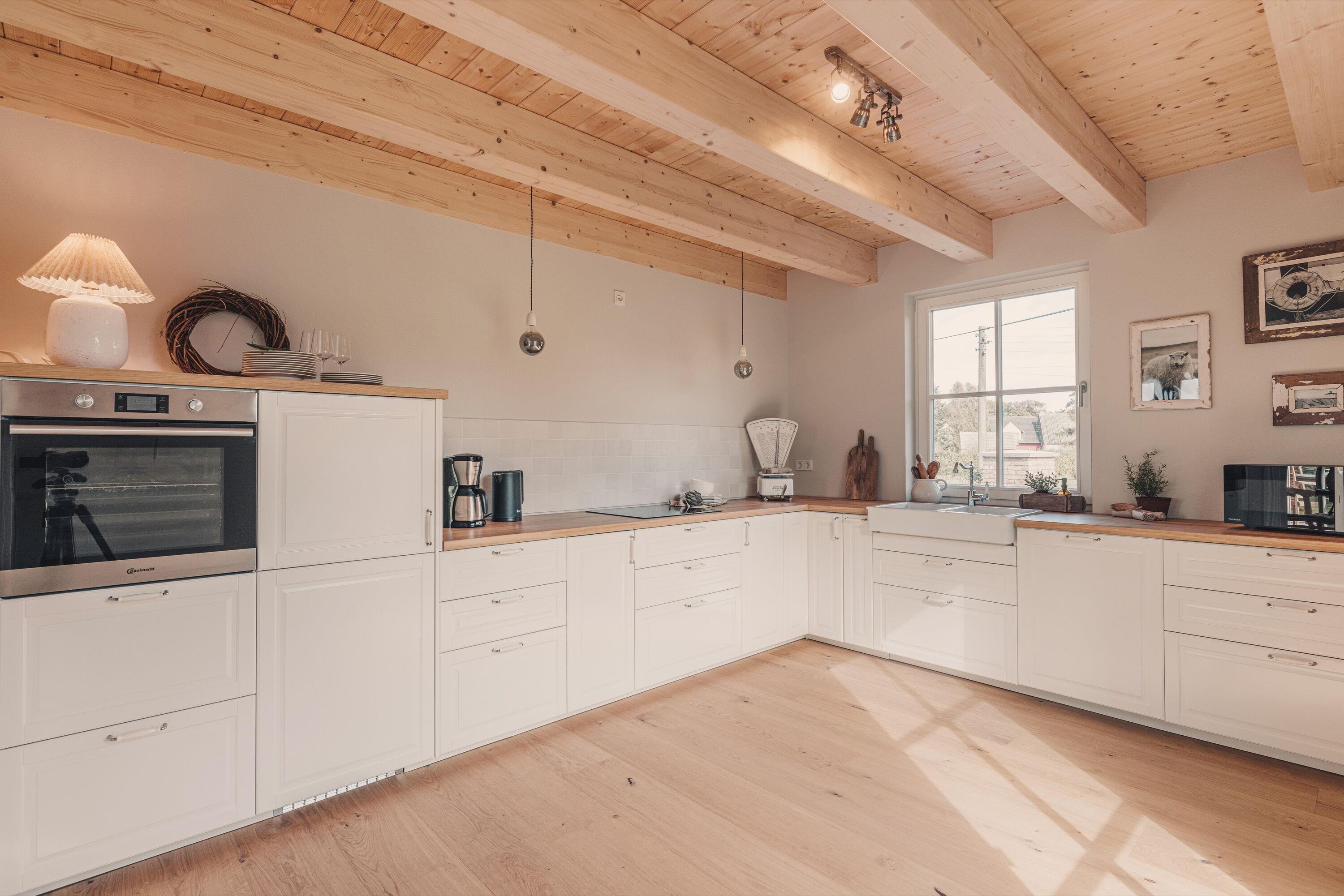 An kühleren Tagen lädt ein wärmender Kamin zum gemütlichen Verweilen ein, während die voll ausgestattete Küche ausgedehnte Kochabende garantiert. Erleben Sie echte Erholung mit 2 modernen Bädern, ausgestattet mit 2 großen Regenduschen, 2 WCs und einer Badewanne. Fußbodenheizung im gesamten Haus und Landhausdielen aus Eiche sorgen für warme Füße und sanfte Behaglichkeit.