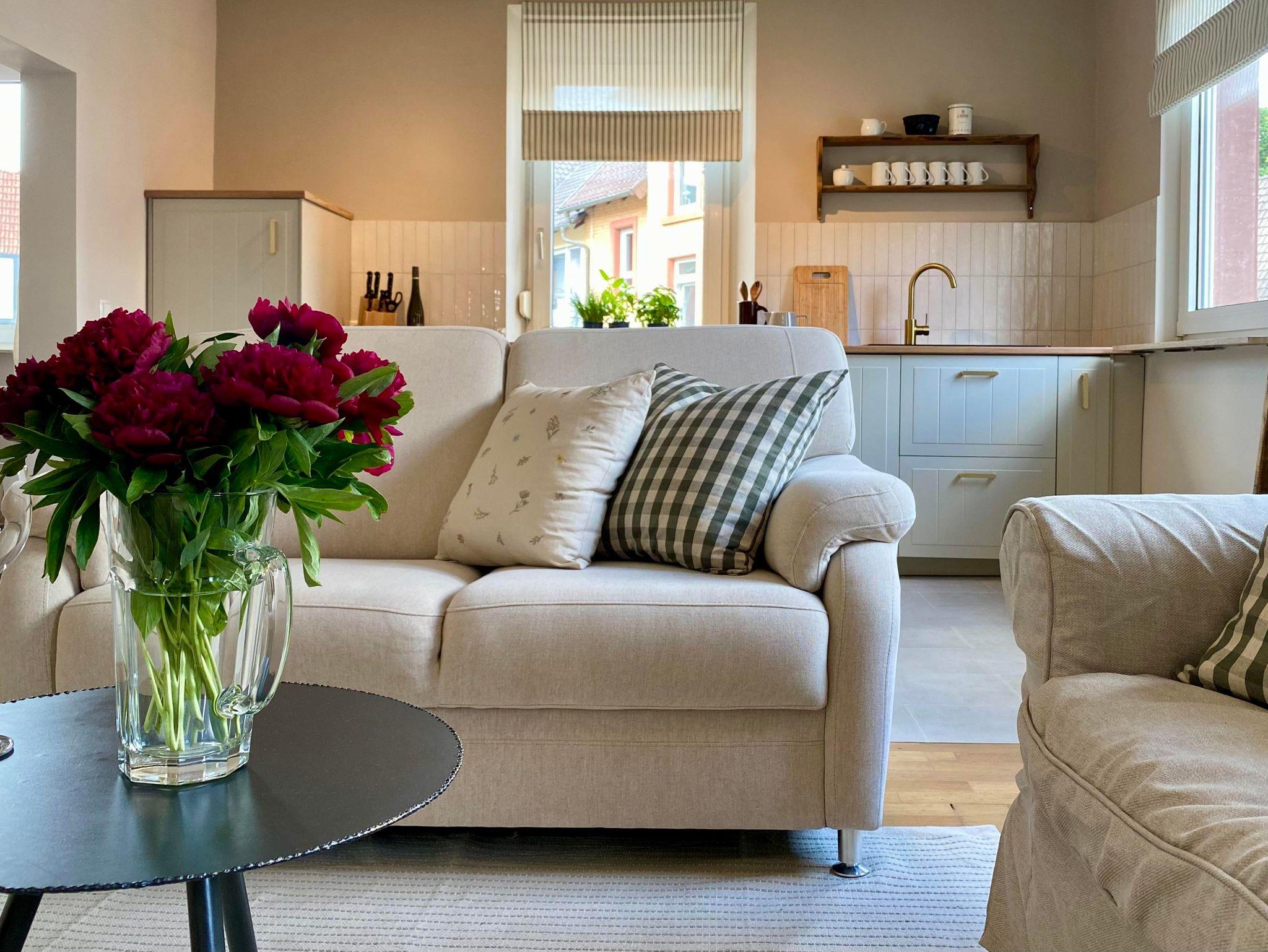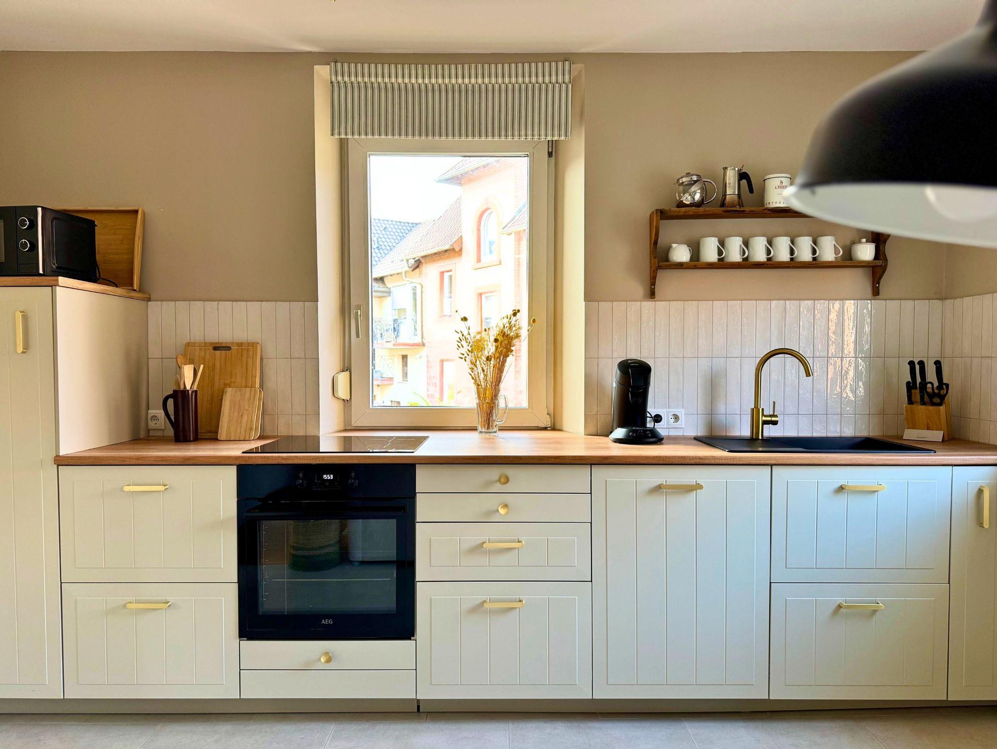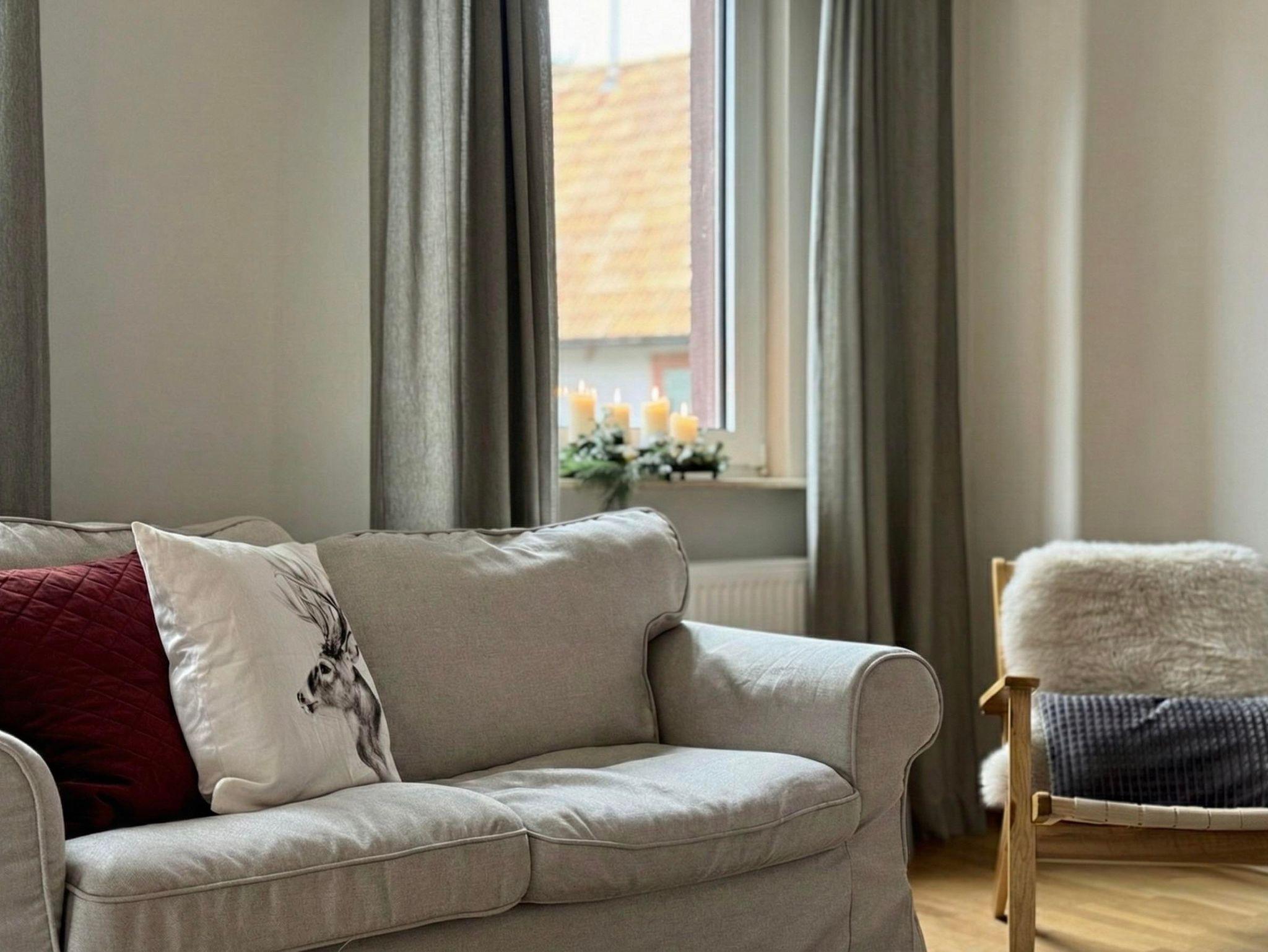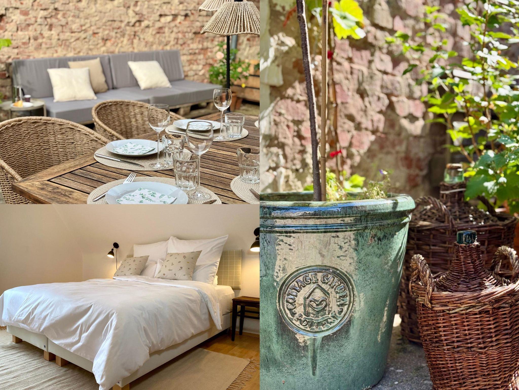 EG (Hochparterre): vollausgestattete Küche (Kühlschrank, Backofen, Induktionskochfeld, Spülmaschine, Mikrowelle, Toaster, Kaffeemaschine samt Kaffee, Wasserkocher) - Wohnbereich mit Sofas, Sesseln und TV - Esszimmer - Tageslichtbad (Dusche, WC) - Zugang zum Innenhof mit Esstisch, Grill, sonniger Lounge und Feuerschale.