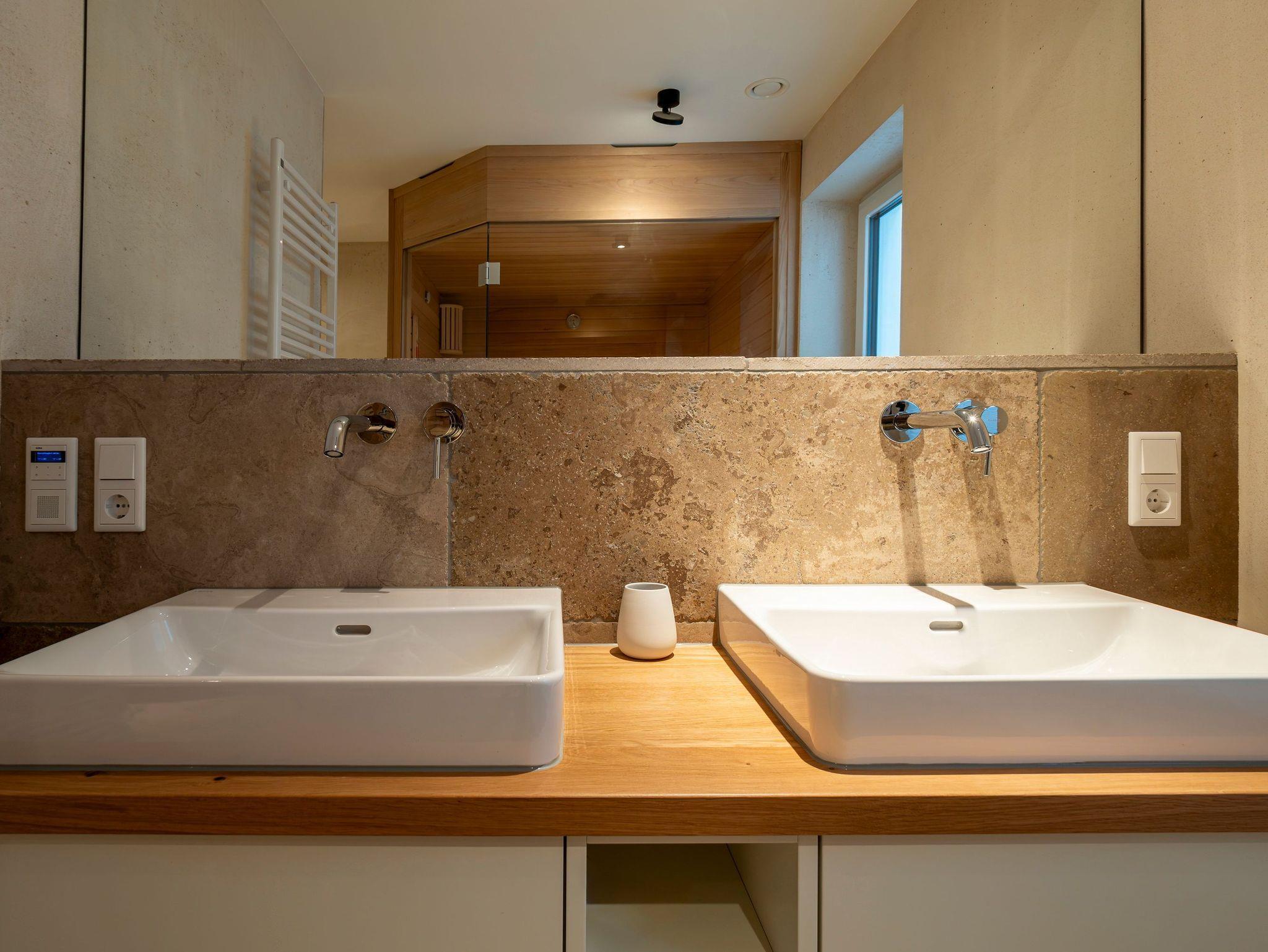 Im Untergeschoss befindet sich das 3. Schlafzimmer sowie die Wellnessoase, die vom Eingangsbereich aus bequem über eine Treppe zu erreichen ist.