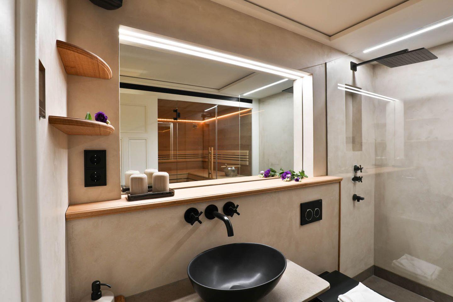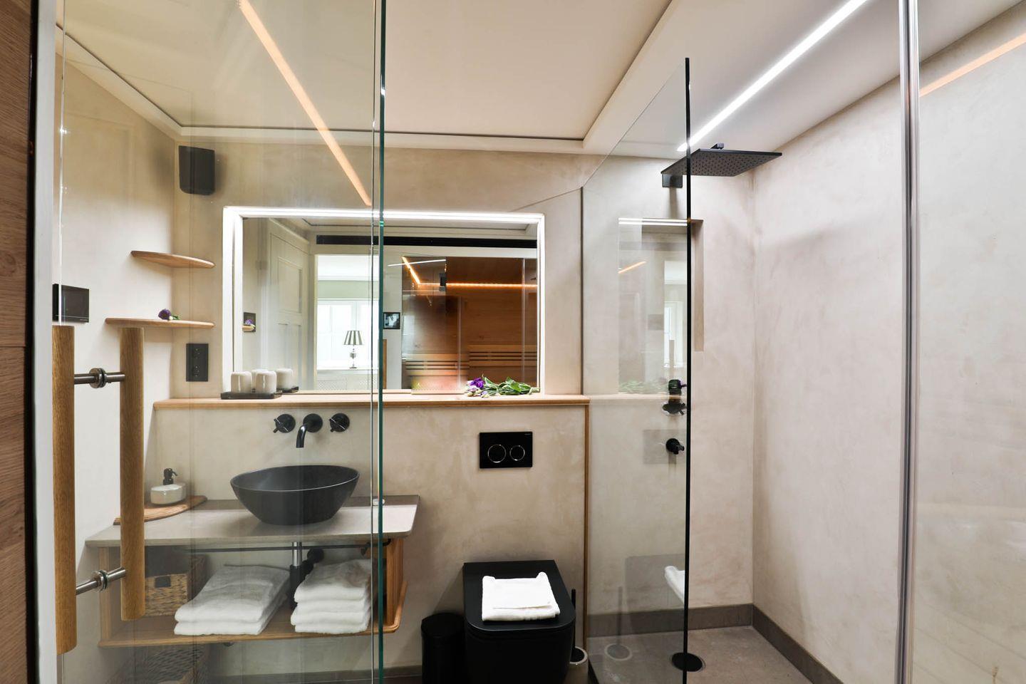 Spiegel front und der bodentiefen Dusche, sondern auch durch eine Sauna mit
