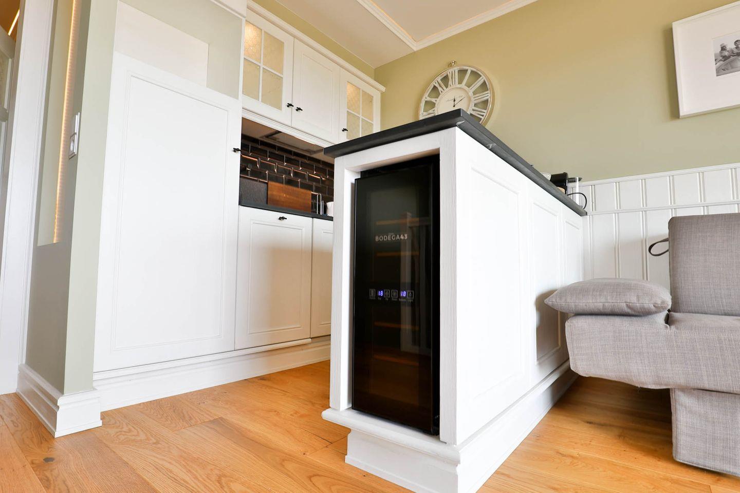 Wasserdampf-Kamin, integrierter Küchenzeile mit Weinkühlschrank, Essbereich und Zugang zur