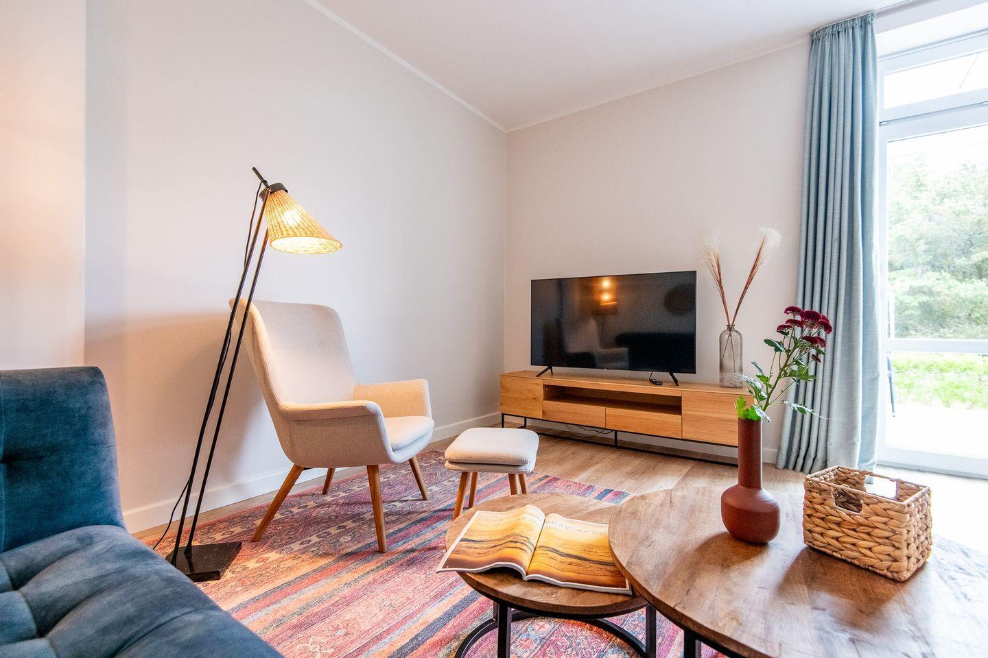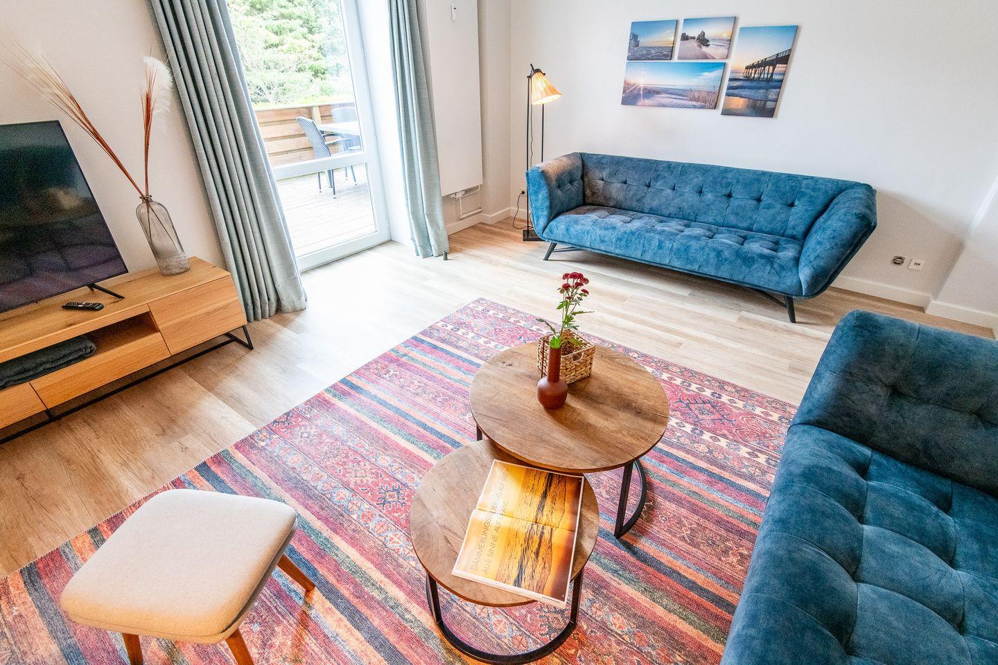 Das Wohnzimmer lädt mit zwei großen Sofas, modernem Fernsehgerät und einem gemütlichen Lesesessel zum Entspannen ein.
