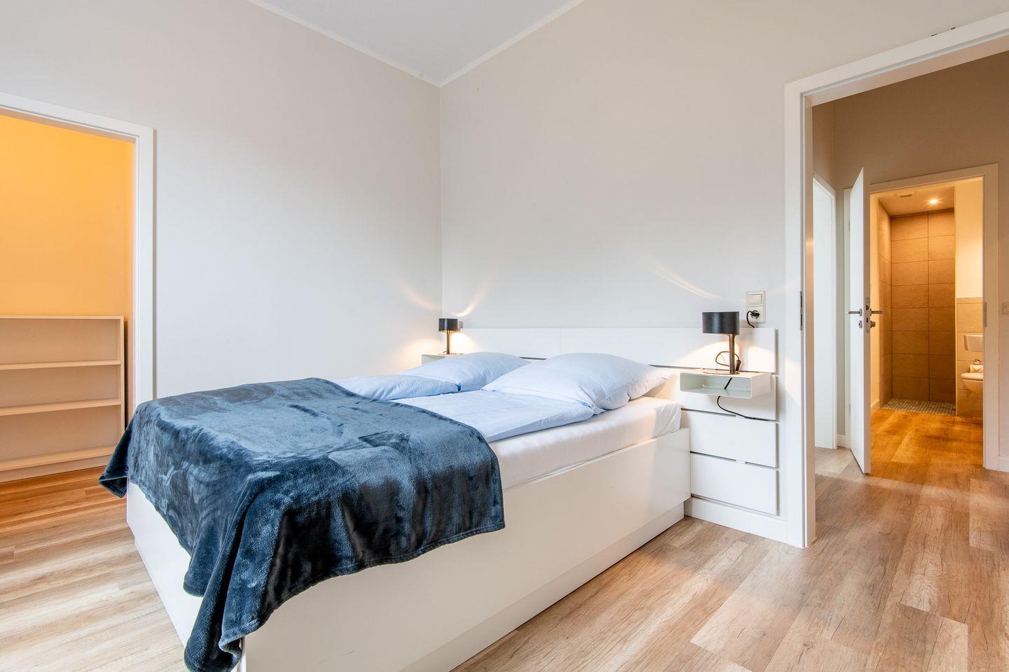 Die beiden weiteren Schlafzimmer teilen sich ein modernes Duschbad. Beide Räume verfügen jeweils über ein 160er Doppelbett sowie einen begehbaren Kleiderschrank.