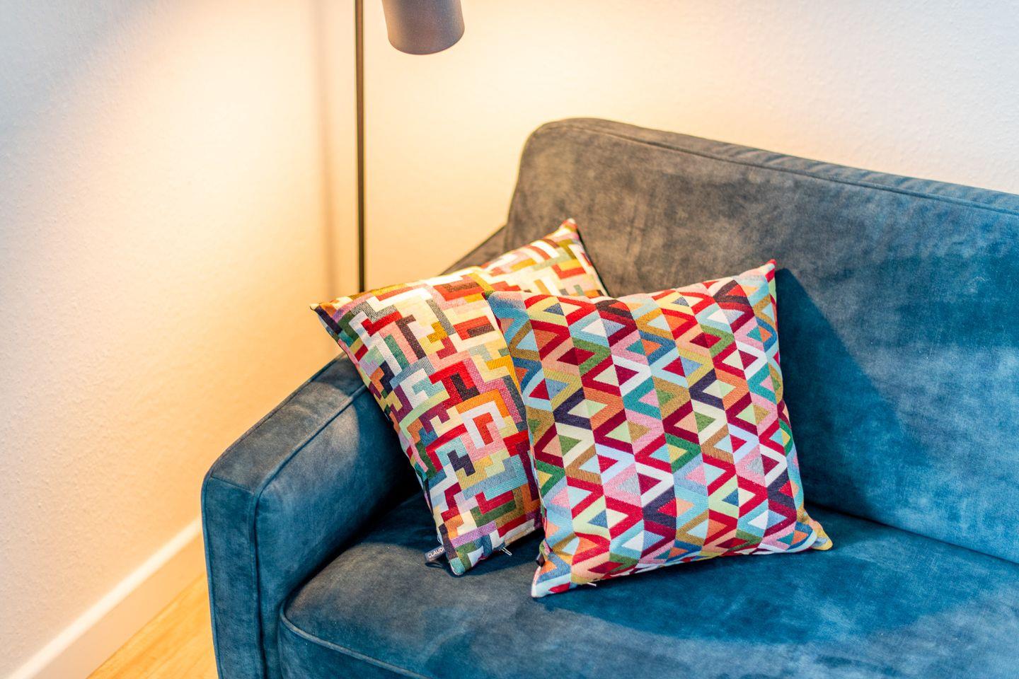 Der Wohn-Schlafbereich ist mit einer gemütlichen Sofaecke sowie einem TV-Gerät ausgestattet. Der Schlafbereich ist durch eine Wand vom Wohnbereich getrennt und mit einem bequemen Doppelbett und einem Kleiderschrank möbliert.