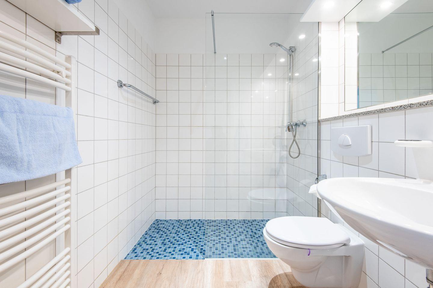 Vom Eingangsbereich aus erreichen Sie das Badezimmer. Dieses ist mit einer bodengleichen Dusche, WC, Waschbecken und einer Handtuchheizung ausgestattet.