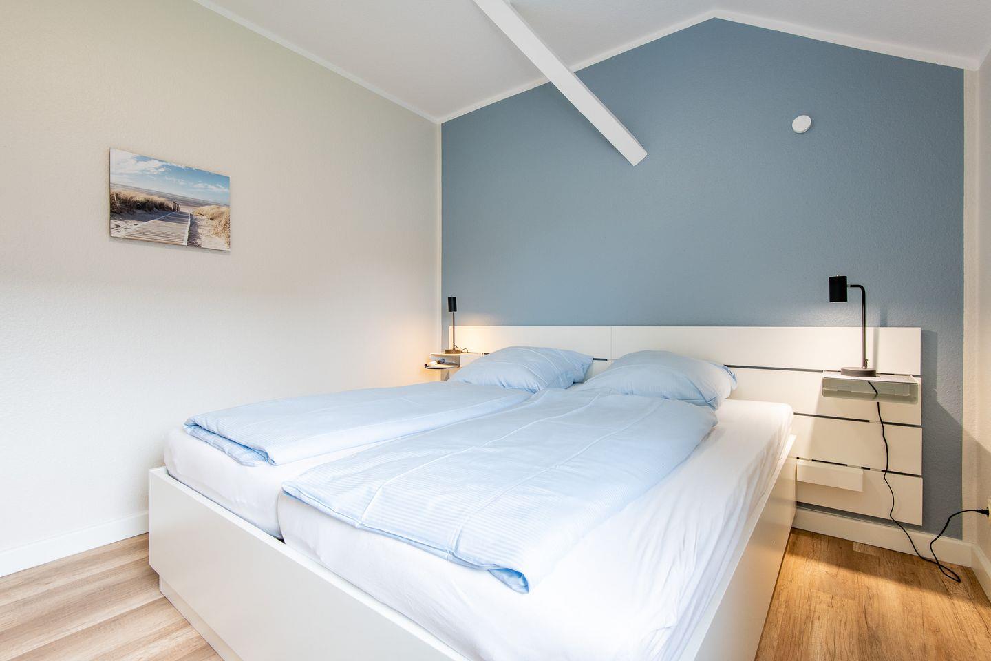 Das Schlafzimmer ist mit einem bequemen Doppelbett und einem Kleiderschrank ausgestattet.