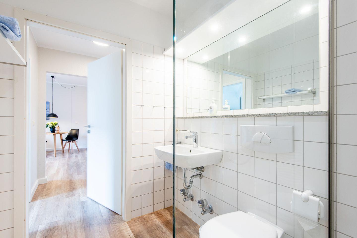 Vom Eingangsbereich aus erreichen Sie das Badezimmer. Dieses ist mit einer bodengleichen Dusche, WC, Waschbecken und einer Handtuchheizung ausgestattet.