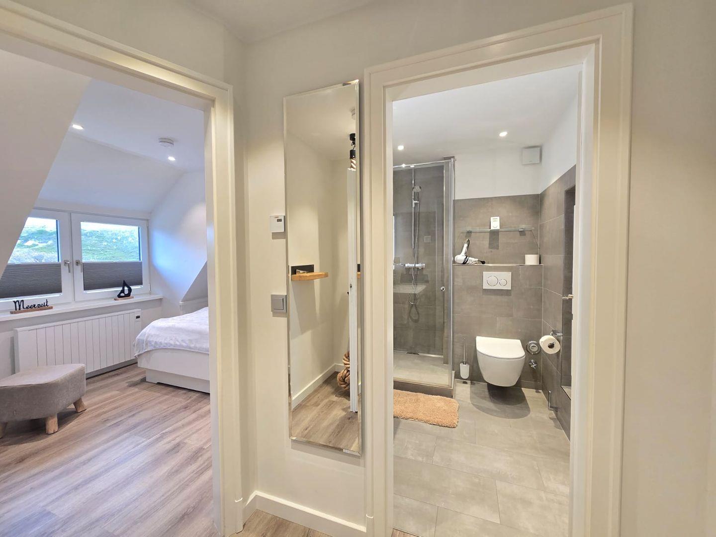 Die Wohnung befindet sich im Obergeschoss eines traditionellen Reetdachhauses und erstreckt sich über zwei Etagen. Sie besticht durch moderne, hochwertige Tischlereinbauten und einen liebevoll eingerichteten Wohn- und Essbereich mit offener Küche, der ein harmonisches Zusammenspiel von Komfort und Stil bietet. Große Fenster lassen viel Tageslicht herein und schaffen eine helle, einladende Atmosphäre. Die Küche ist mit allen notwendigen Geräten ausgestattet, darunter Miele Induktionsherd, Miele Backofen, Miele Geschirrspüler, Miele Kühlschrank sowie eine Nespressomaschine, WMF-Toaster, WMF-Wasserkocher und WMF-Filterkaffeemaschine. Ein Wasch- und Trockner erleichtert den Aufenthalt und macht die Ferienwohnung besonders komfortabel.