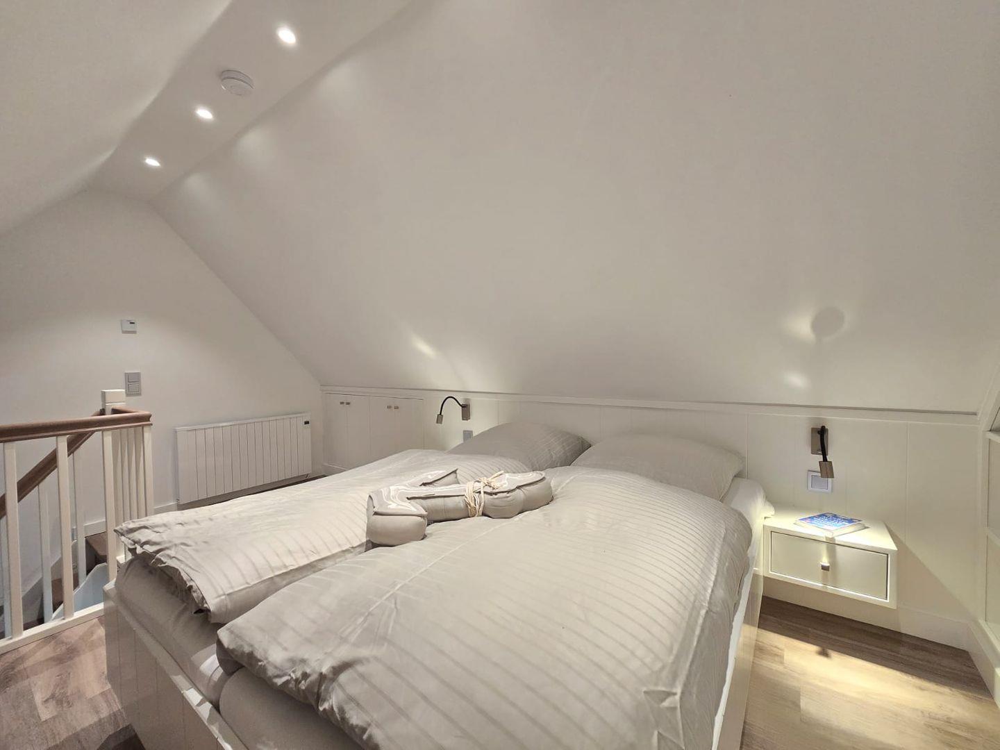 Im Dachgeschoss liegt ein weiterer Raum mit einem Doppelbett in der Größe 1,60 x 2,00 Meter, ebenfalls mit hochwertigen Federkernmatratzen ausgestattet, der zusätzlichen Schlafraum für Familien oder Paare bietet. Der geschmackvoll eingerichtete Bereich sorgt für Rückzugsmöglichkeiten und Ruhe nach einem erlebnisreichen Tag auf Sylt.