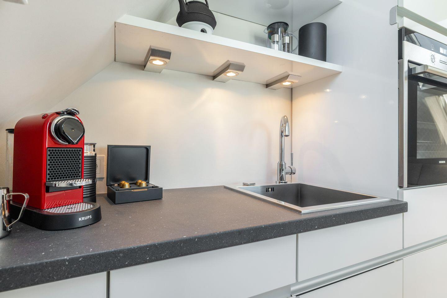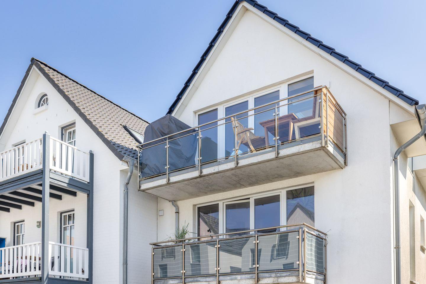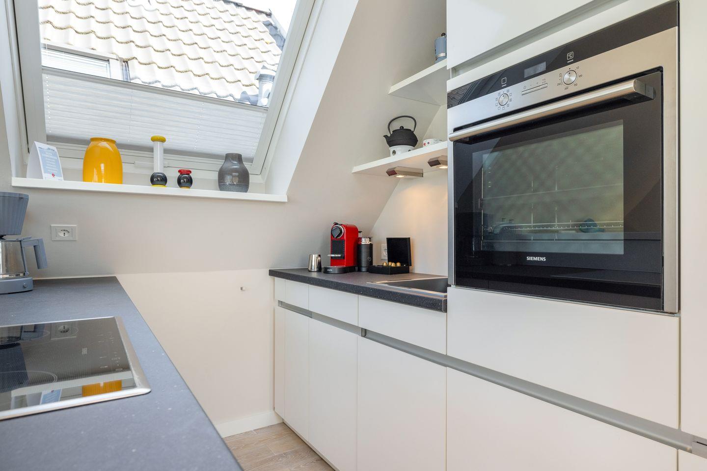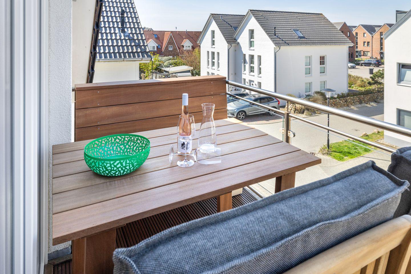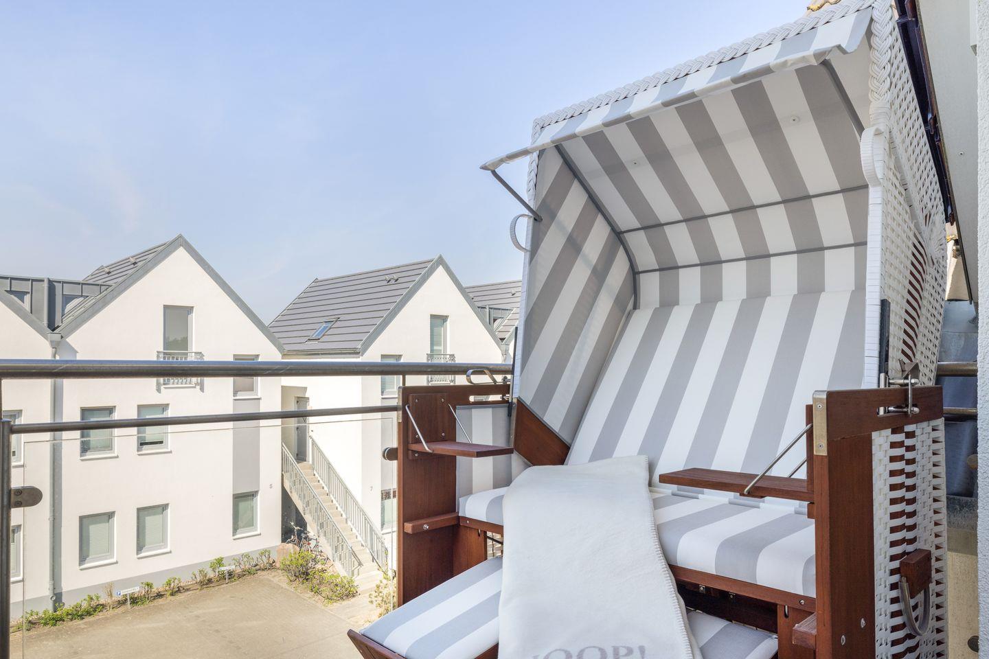 Die offene Wohnküche ist ein Highlight für alle, die gerne kochen. Mit Backofen, Geschirrspüler, Kühlschrank, Nespresso-Maschine und vielem mehr steht einem gelungenen Dinner nichts im Weg. Genießen Sie Ihre Mahlzeiten am Esstisch im Wohnbereich oder auf dem großzügigen Balkon, der mit einem wohnungseigenen Strandkorb und einer Lounge-Ecke ausgestattet ist. Lassen Sie hier den Tag bei einem Glas Wein ausklingen, während die Abendsonne den Himmel in warme Farben taucht.