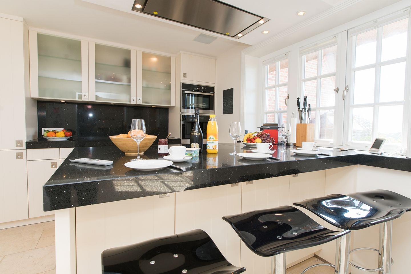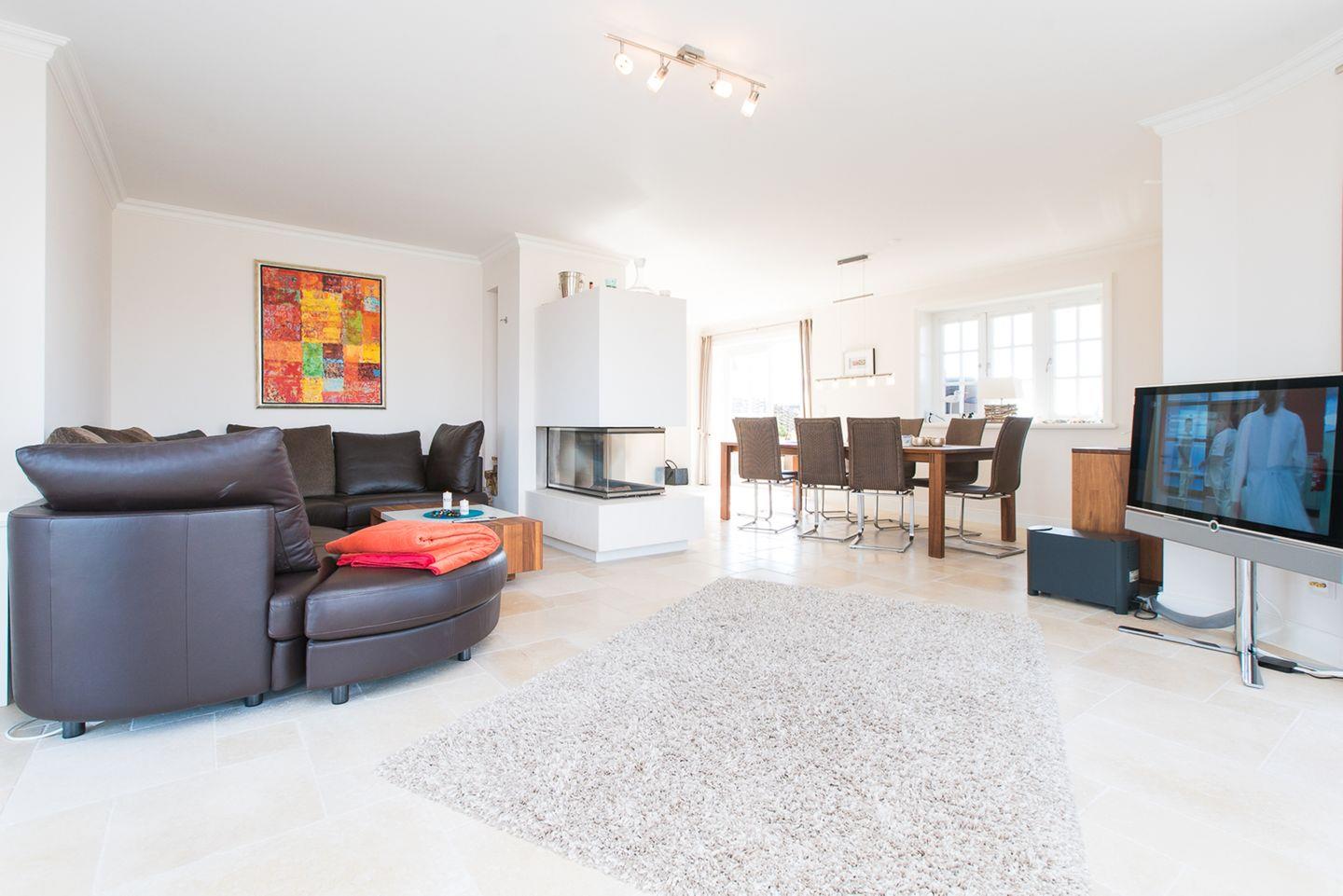 Im Erdgeschoss des Hauses befindet sich die Diele mit Zugang zum Gäste-WC und dem hochwertig eingerichteten Wohn-/Essbereich, der an eine offene Küche angrenzt. Der Wohn-/Essbereich beinhaltet einen Esstisch für 8 Personen, eine großzügige Ledereckcouch und die offene vollausgestattete Küche mit Kochinsel und vorgelagertem Esstresen. Das Wohnzimmer verfügt über einen großen Flachbildfernseher - das Highlight hier ist natürlich der Kaminofen mit Sichtfenster, der Wohlfühlatmosphäre garantiert. WLAN vorhanden (ohne Gewähr)
